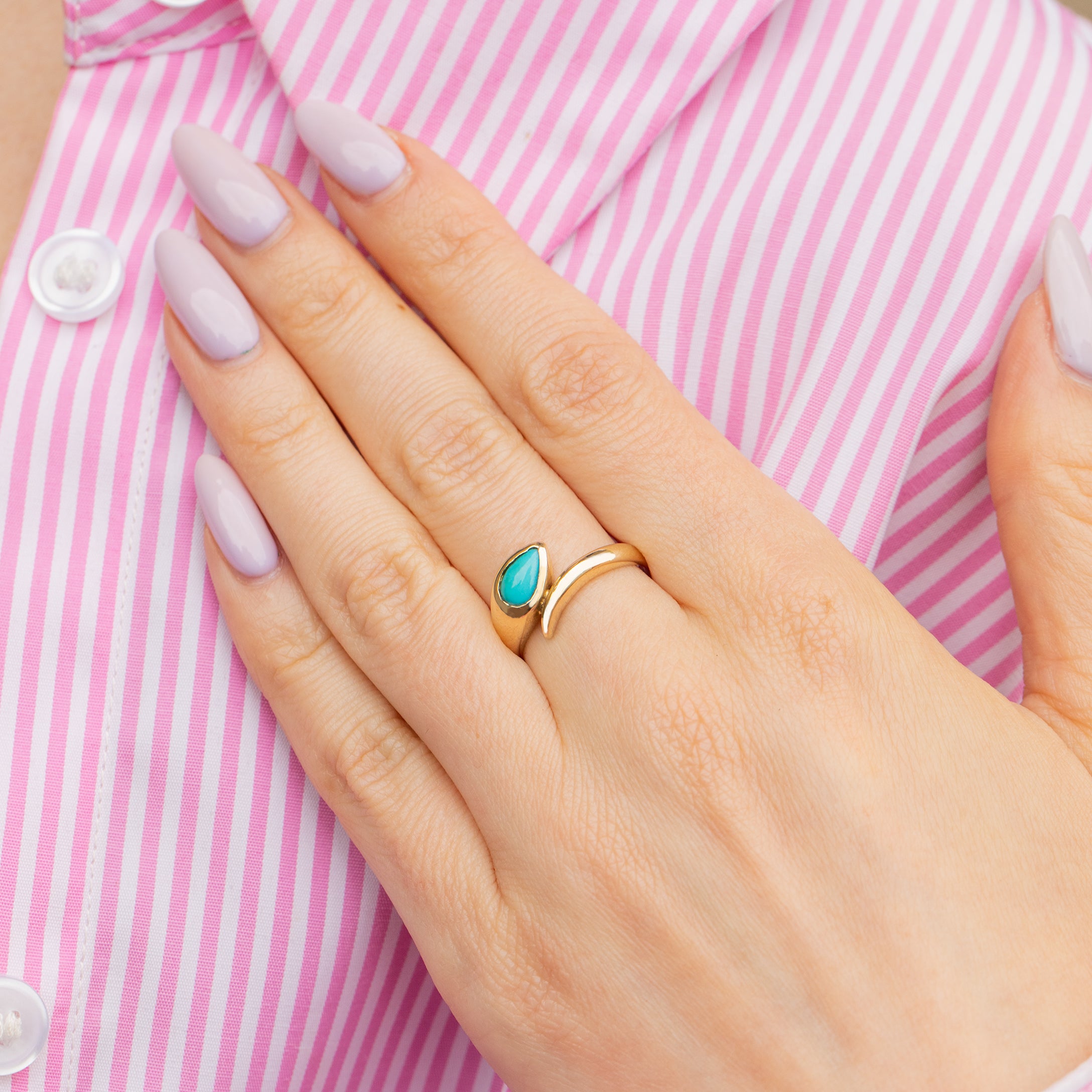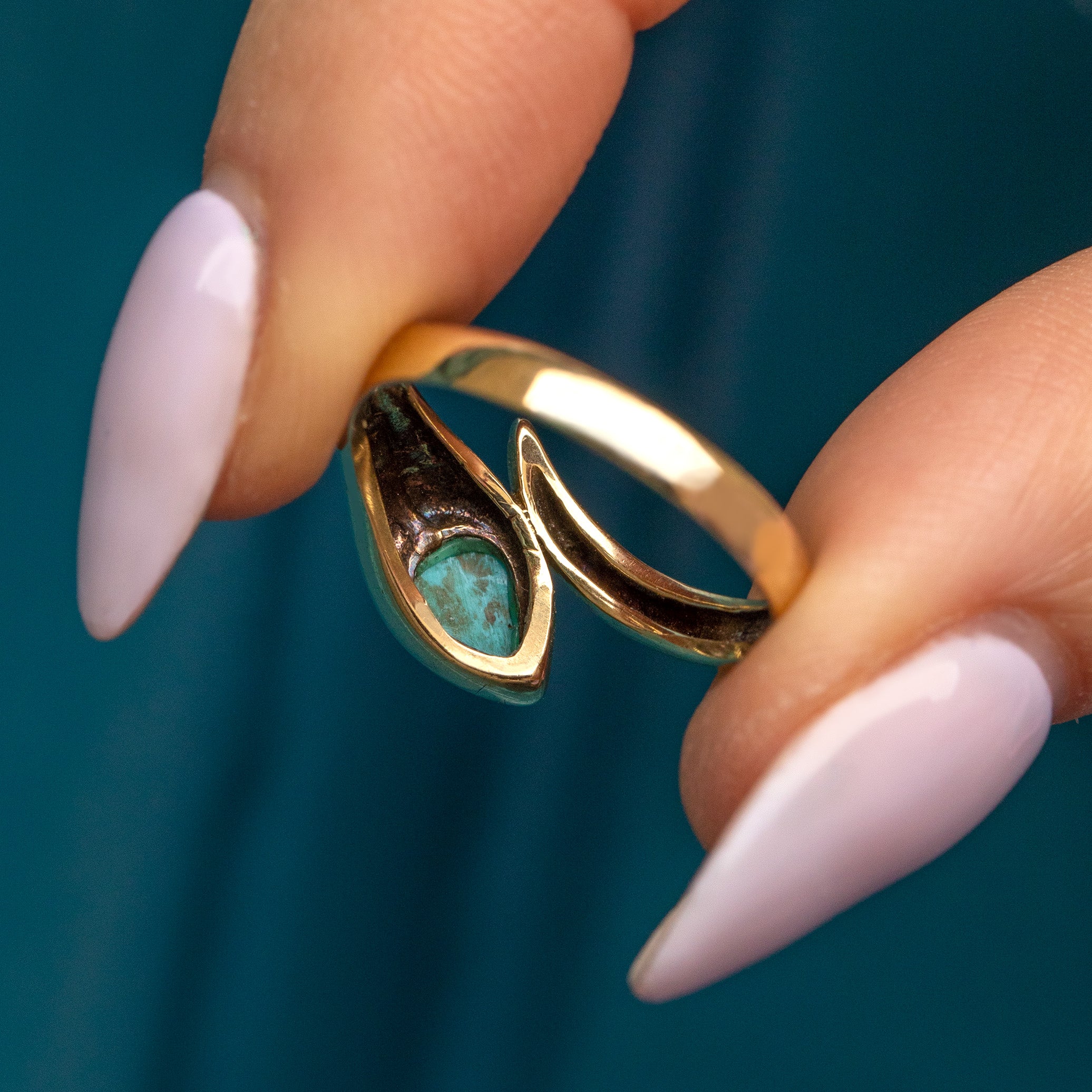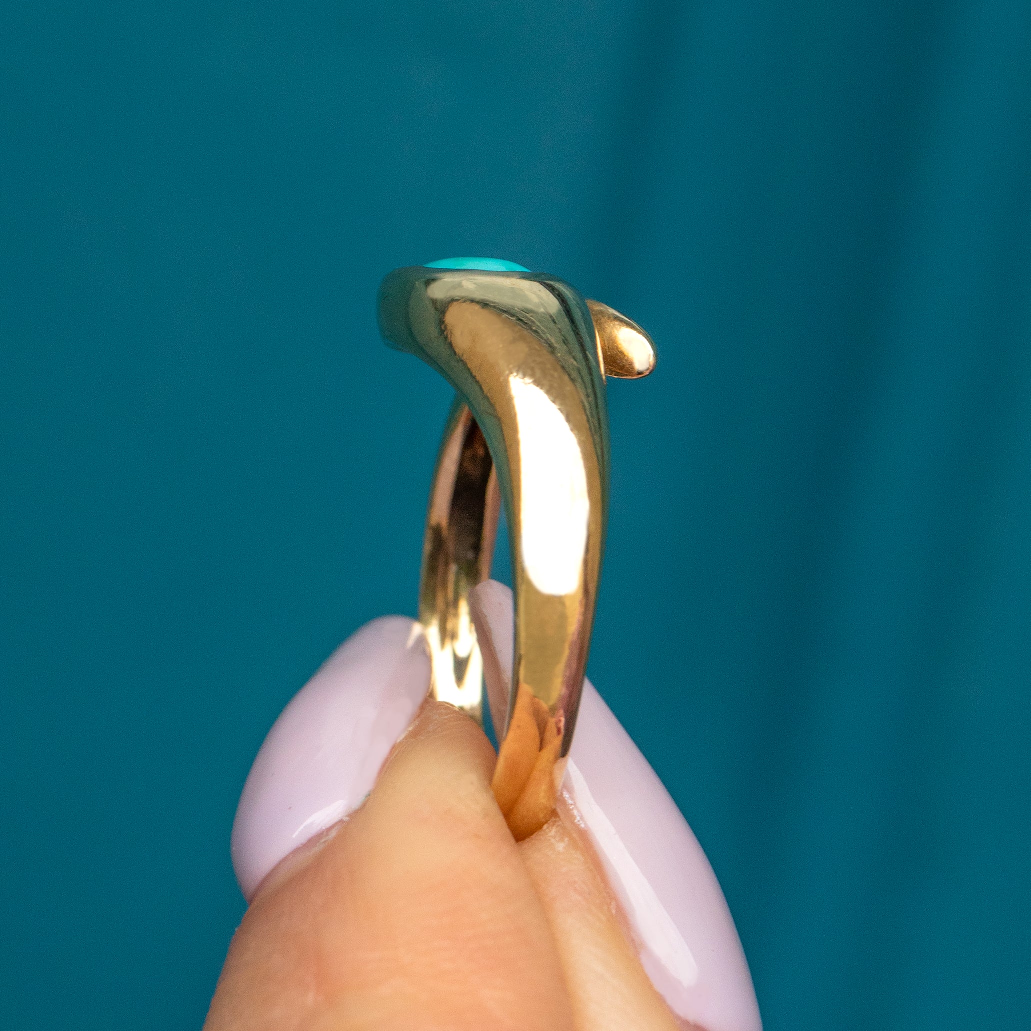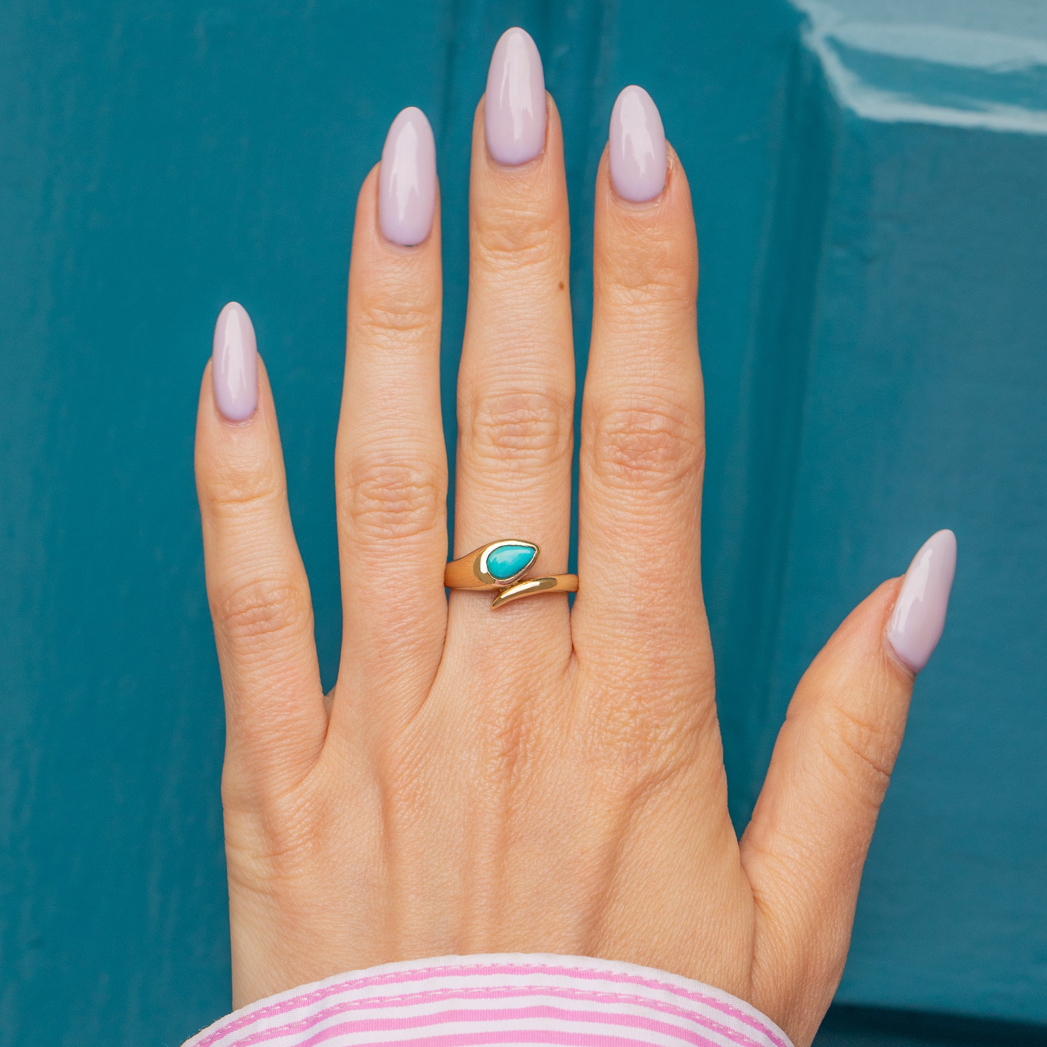 This striking 9ct Gold Turquoise snake ring will make a unique addition to your curated ring stack! Buttery 9ct Gold forms the snake's body, wrapping around your finger with undeniable luxury.