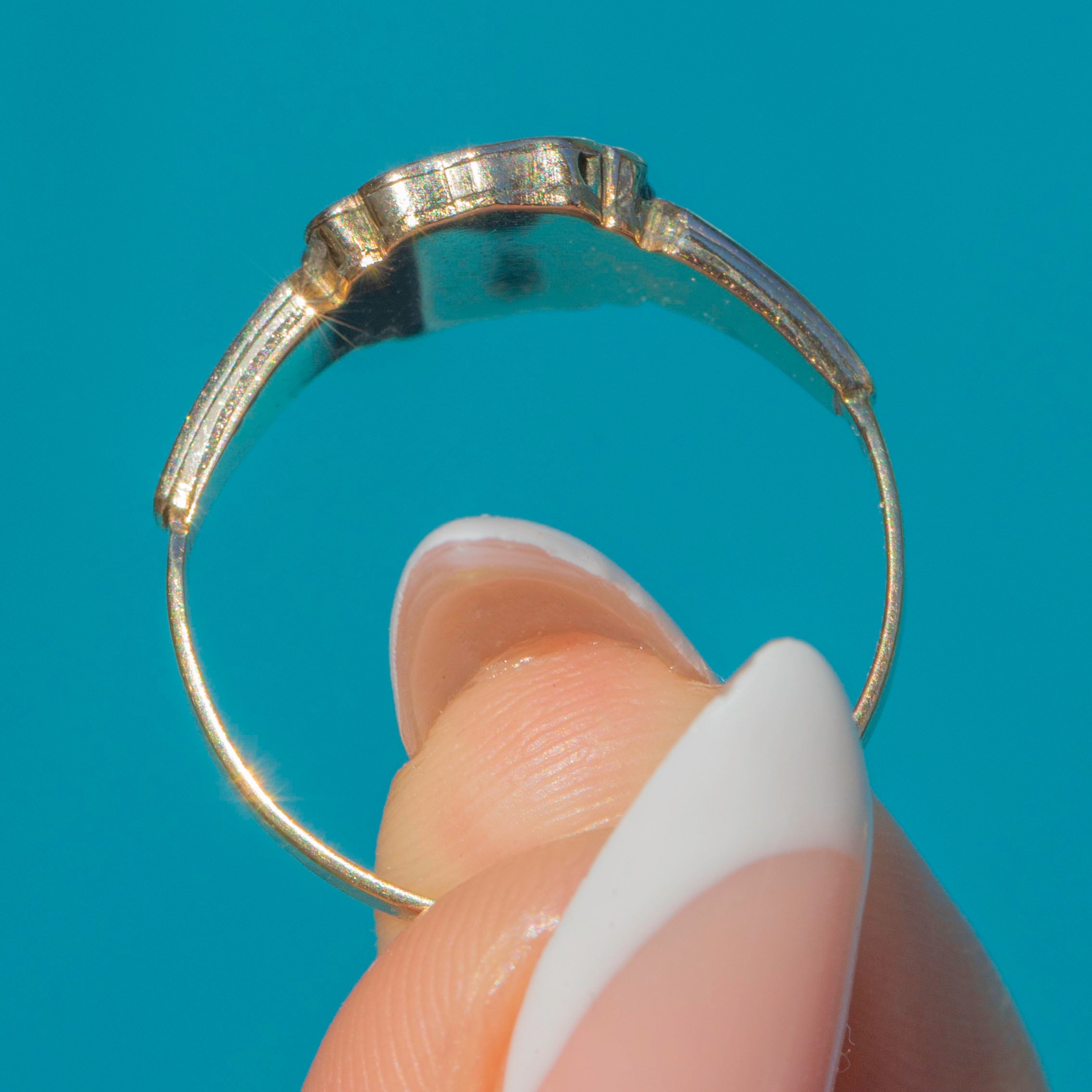 EXCELLENT. The Black Enamel is crisp with only the lightest wear. The Opal (a later replacement for the original panel) is securely set and displays attractive play-of-colour, free from chips or cracks. The Gold shank is strong with a smooth taper, making this historic ring comfortable and ready to wear.