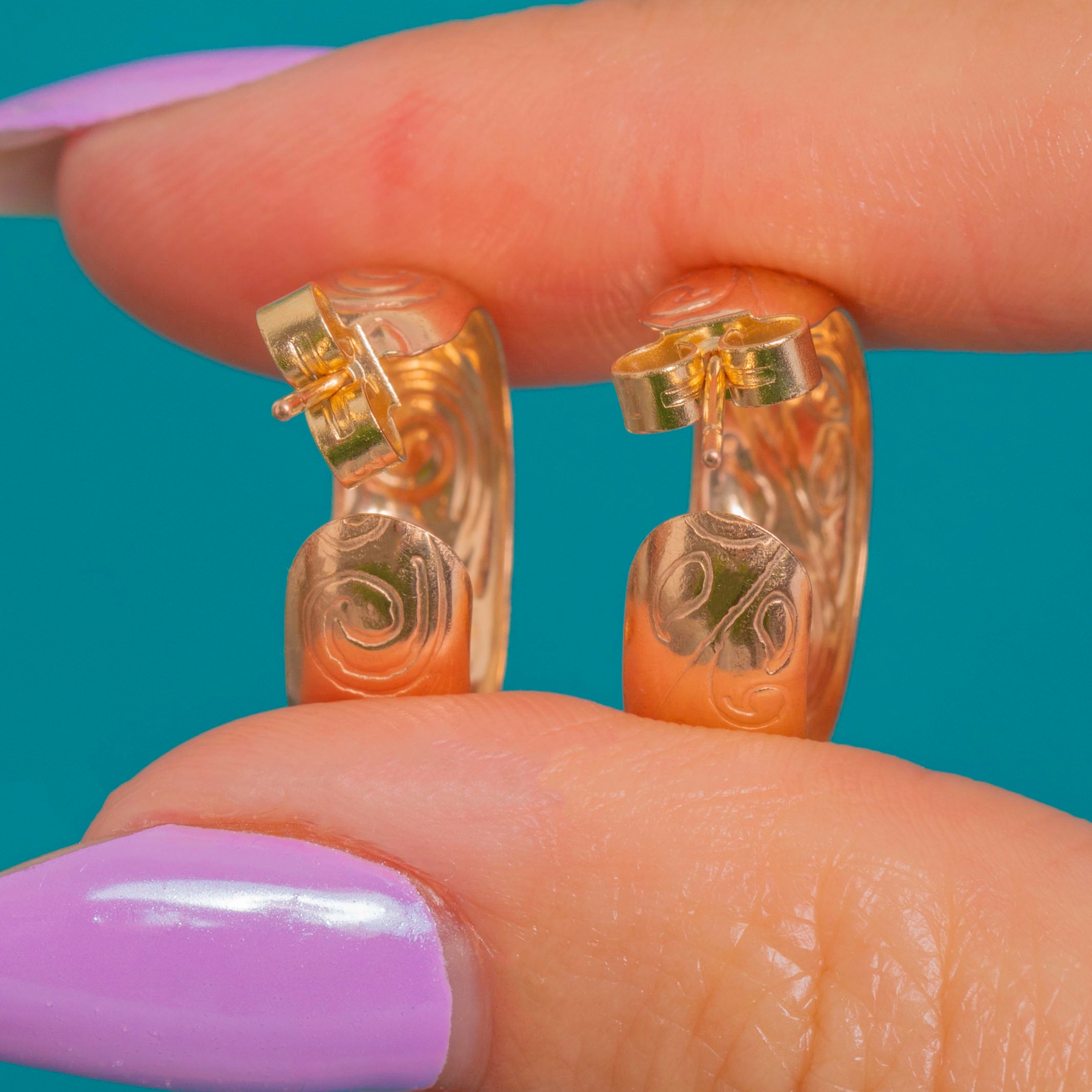 Crafted as compact half hoops that sit close to the ear, the low-relief engraving lends texture and light-play. A timeless pair—these are the kind of earrings you’ll reach for again and again.