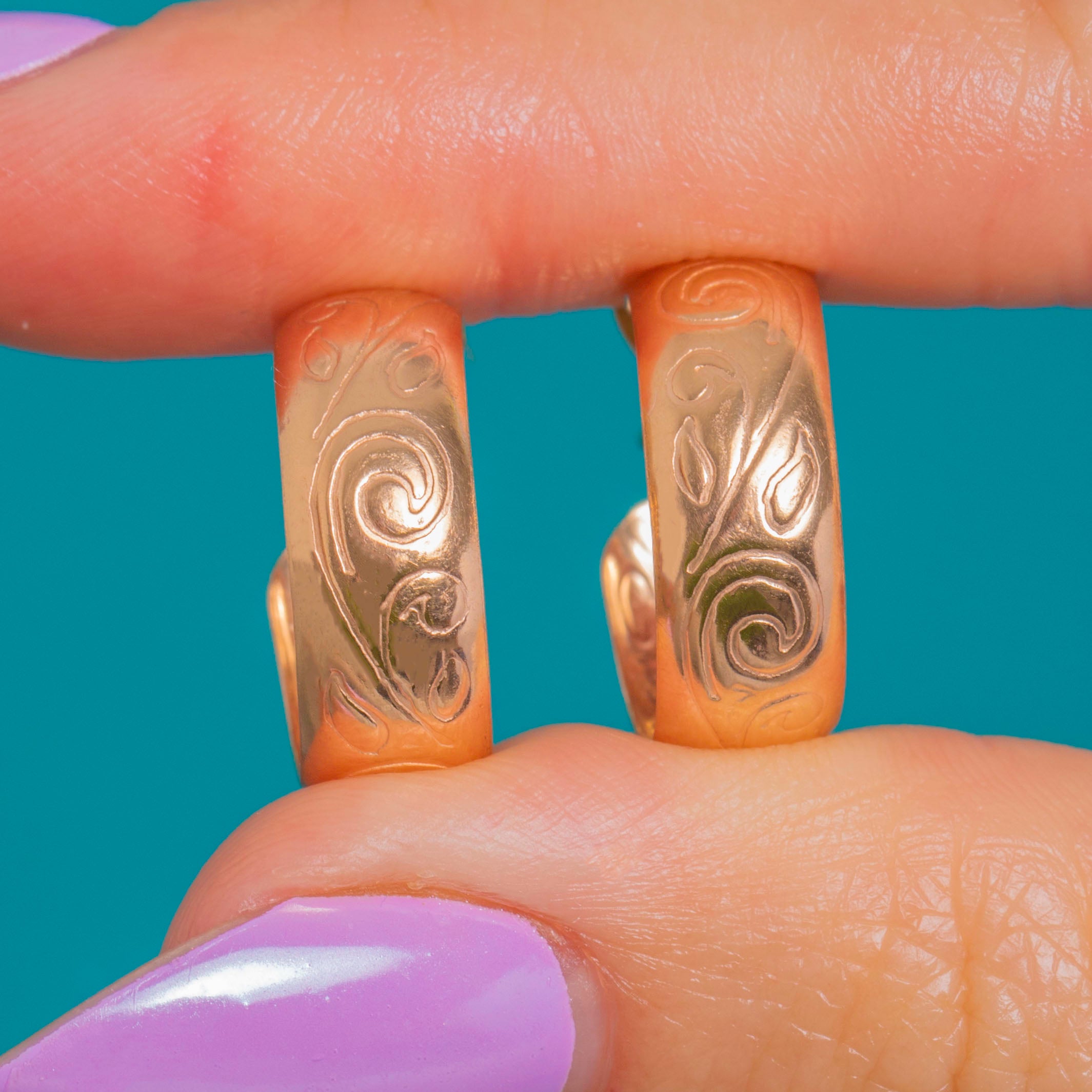 Elevate your everyday with these vintage hoop earrings. Their warm blush hue is beautifully complemented by a refined foliate scroll motif that flows around each curve, striking the perfect balance between ornate detailing and effortless wearability.