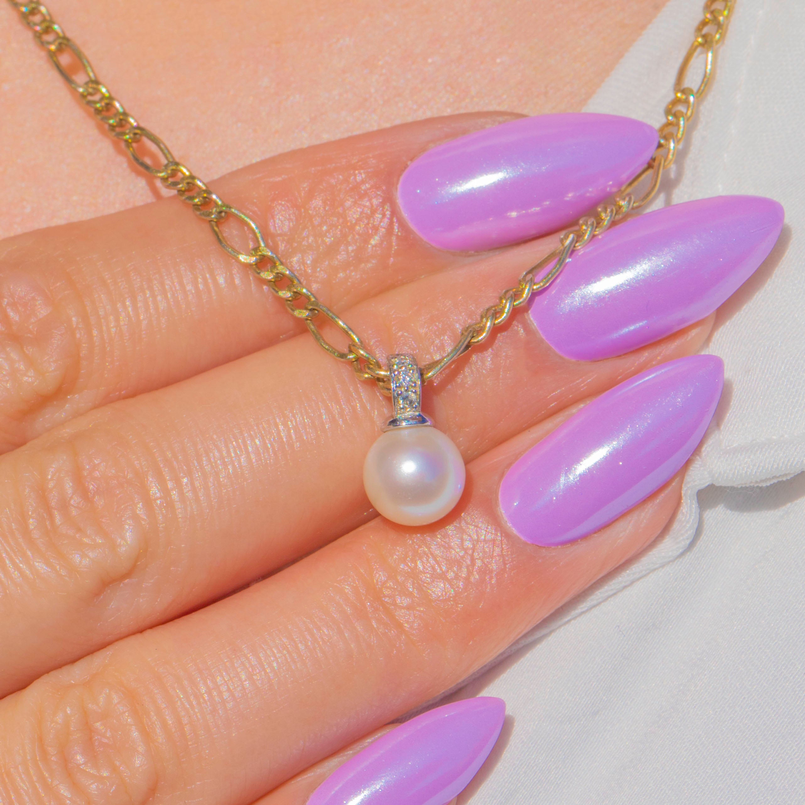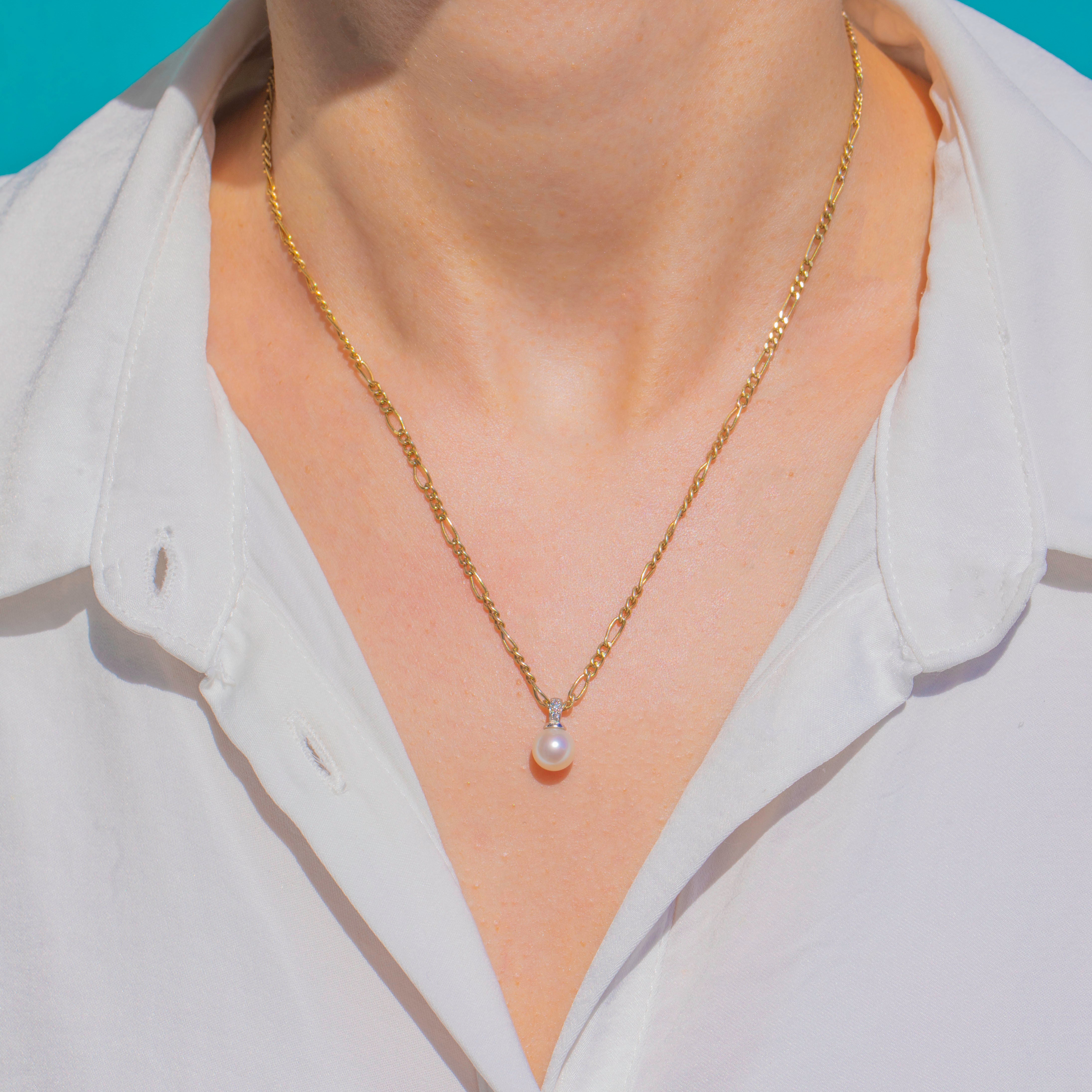 Elegant and effortlessly wearable, this petite 9ct White Gold pendant pairs a luminous Pearl drop with a sparkling pavé Diamond-set bail. The refined silhouette and crisp White Gold setting let the glow of the Pearl and the scintillation of the Diamonds take centre stage.