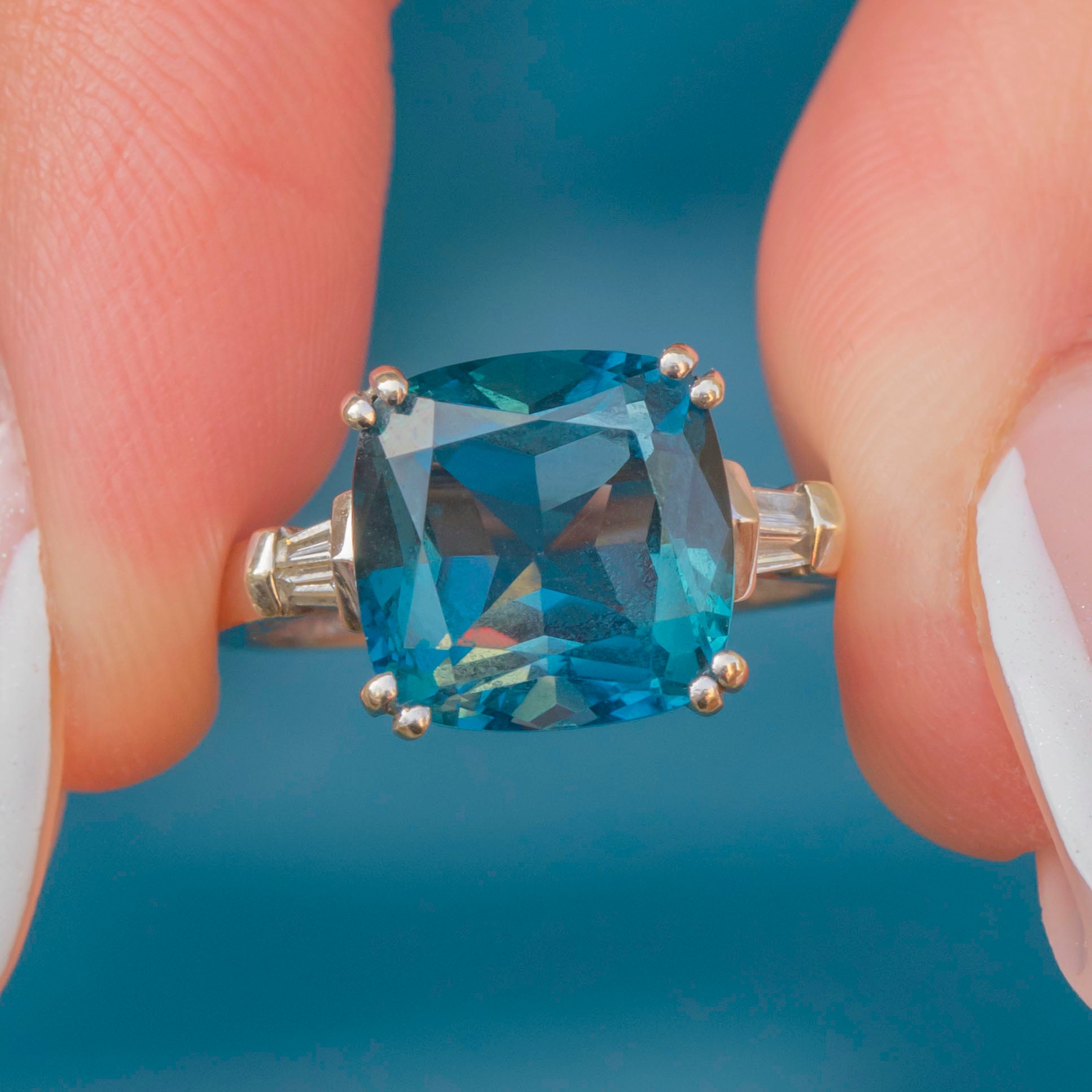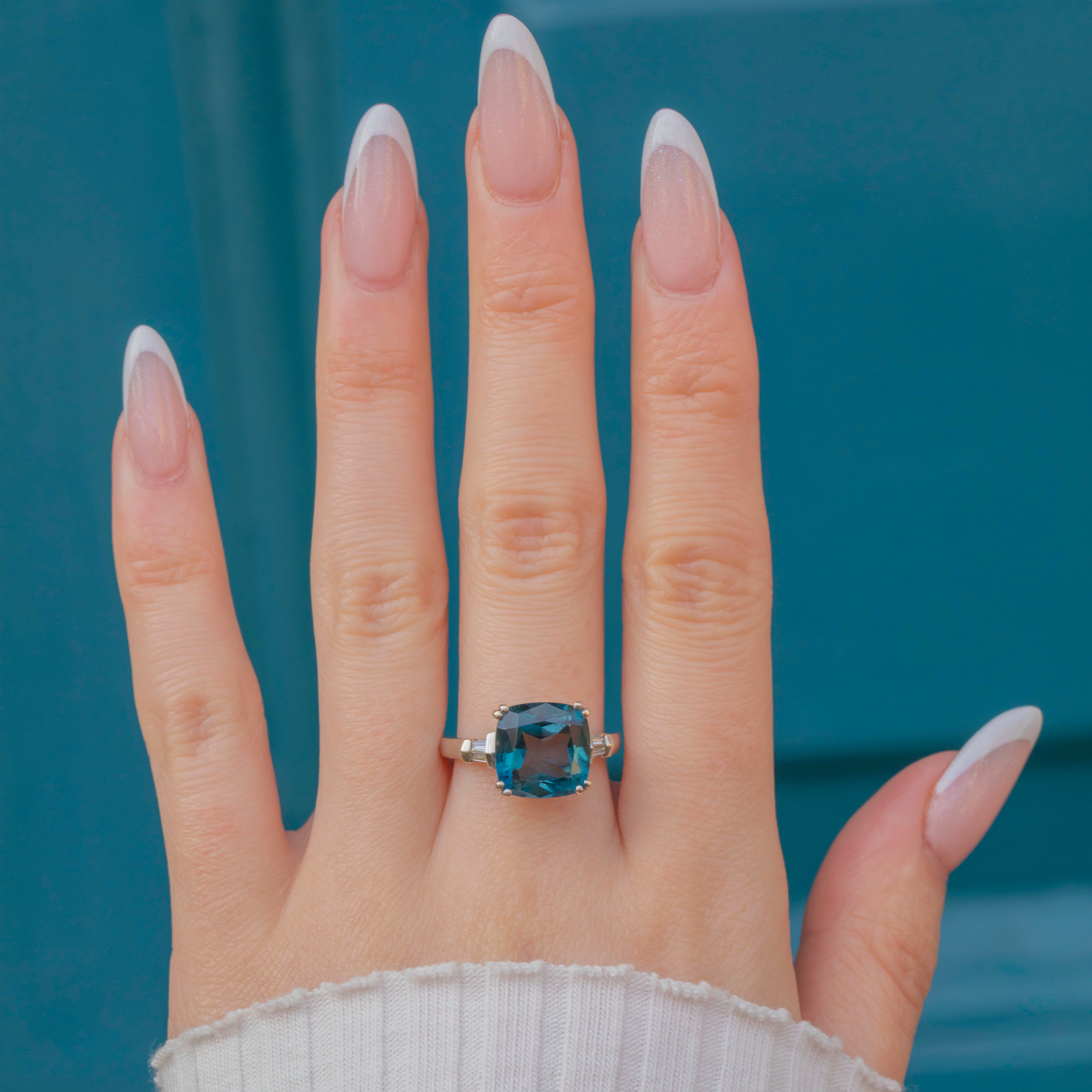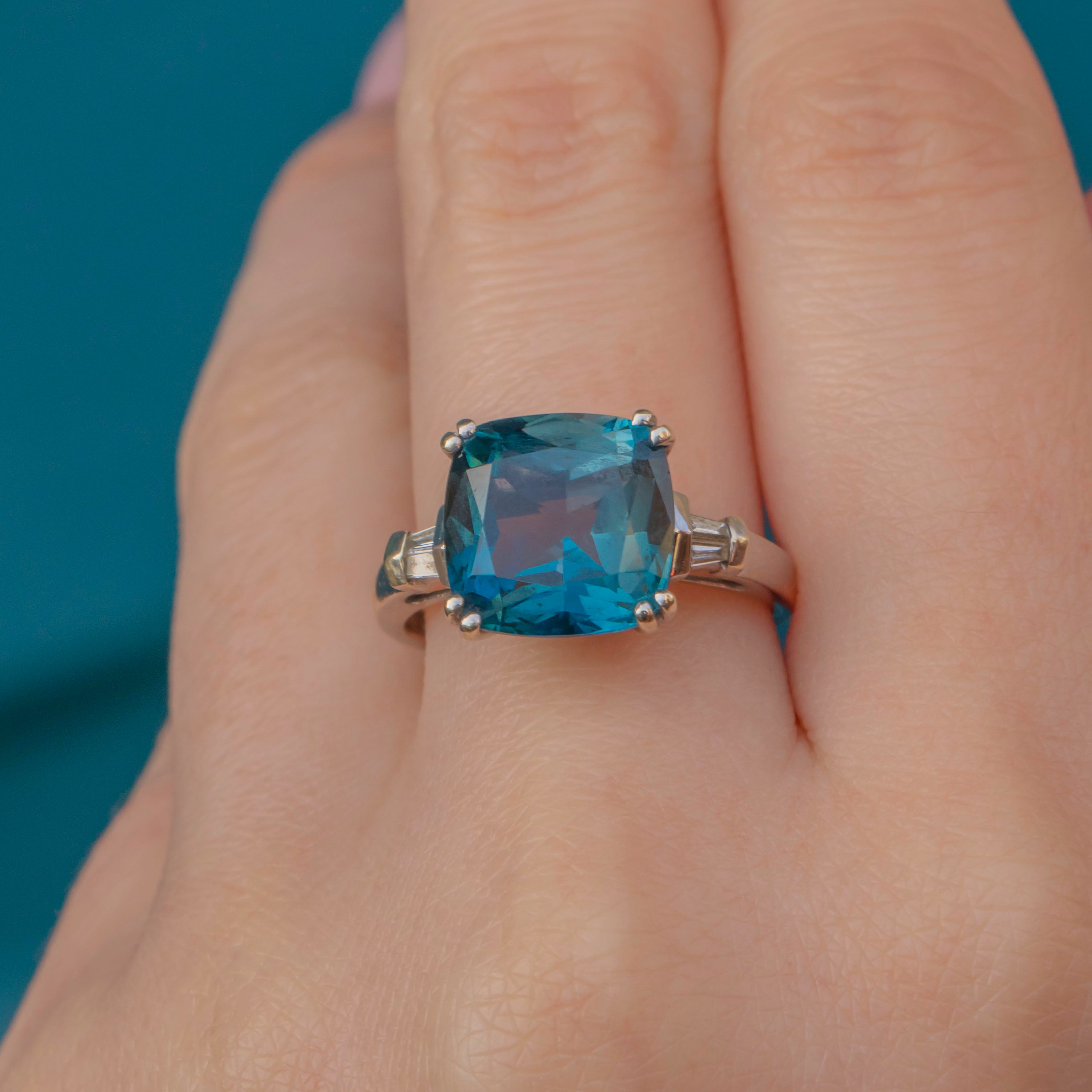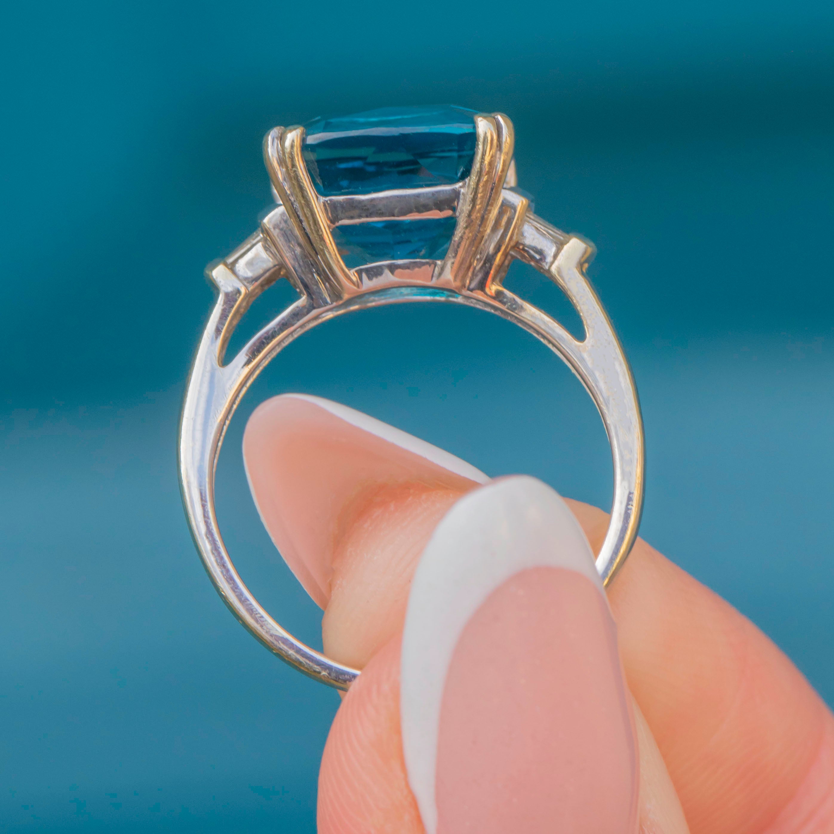 This 9ct White Gold Teal Spinel Diamond Ring is a stand-out piece! A large 4.95ct Spinel takes centrestage, guaranteed to mesmerise you with her bright teal hue, flanked by two bright baguette-cut Diamonds.
