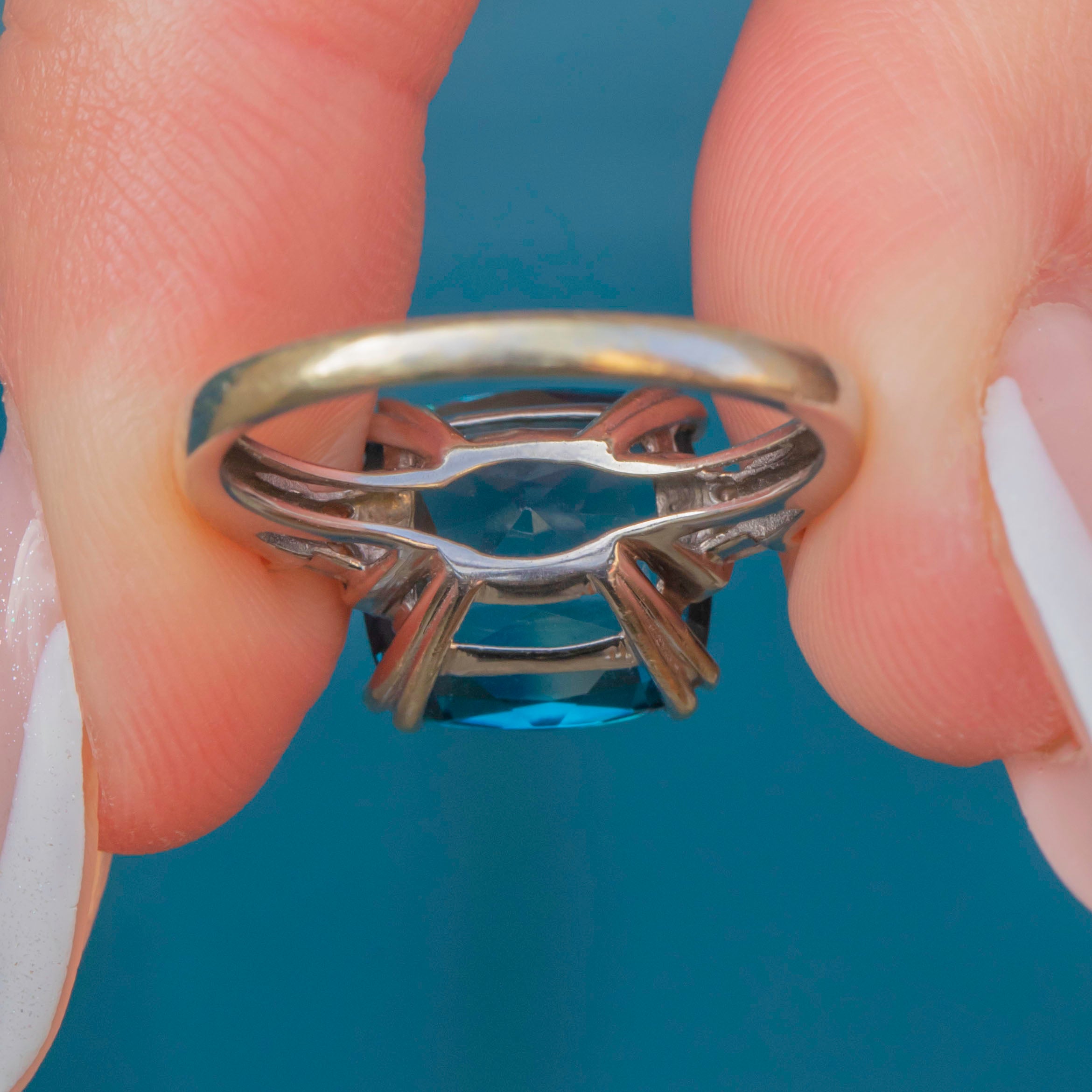 The Spinel is faceted wonderfully, radiating the most gorgeous blend of blue-green hues as she catches the light. Her 9ct White Gold band and striking gallery complement the synthetic Spinel's brilliance while offering a timeless and sophisticated look.