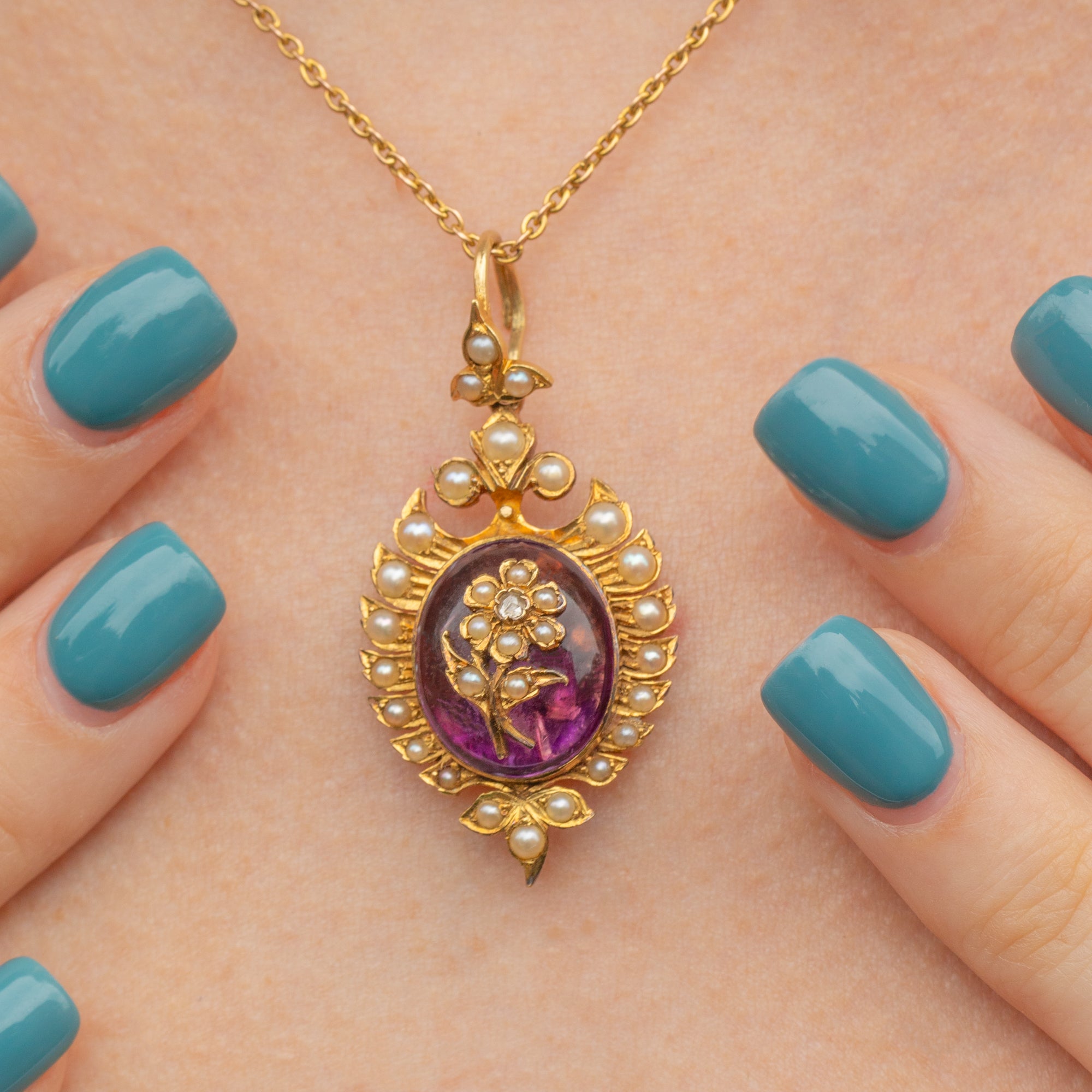 A halo of plump shimmering Pearls surrounds the eye-catching Amethyst, framed by striking feather-like Gold details for a refined finish. Turn this Victorian Gold pendant over and you'll discover a locket compartment. Steeped in history and exuding a regal allure, this exquisite piece of Victorian jewellery will become a treasured heirloom, guaranteed to be admired for generations to come!