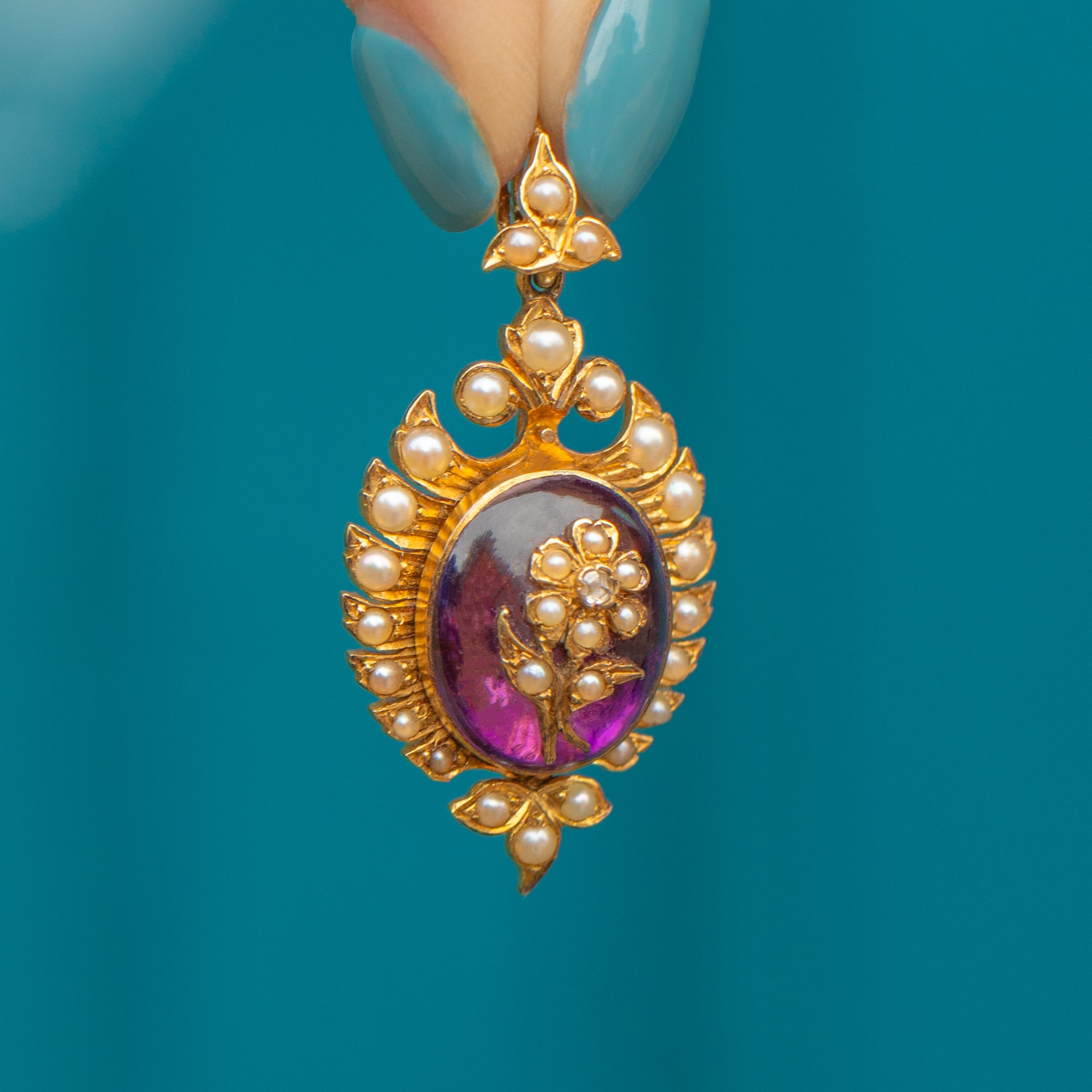 MATERIALS: Tests as 15ct Gold. (The metal inner frame of the locket provides strength and durability) 6.40ct Amethyst cabochon (foiled), Natural Pearls, Rose-cut Diamond.