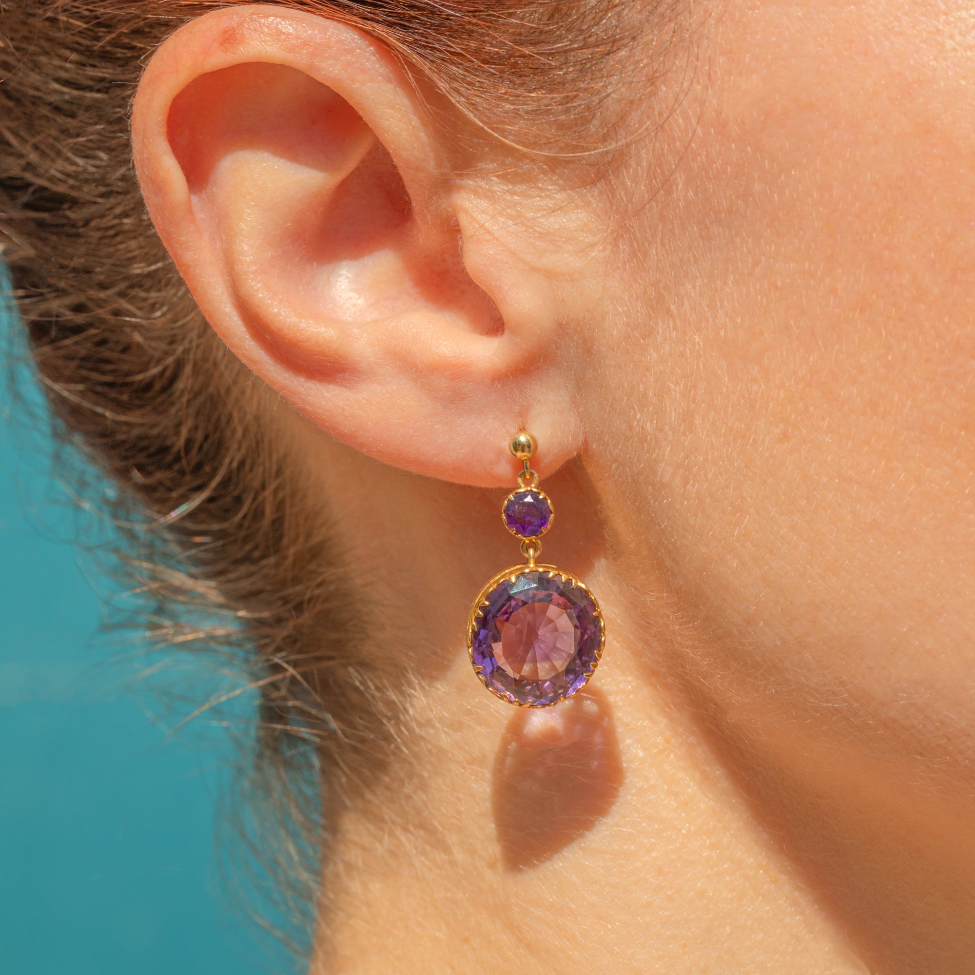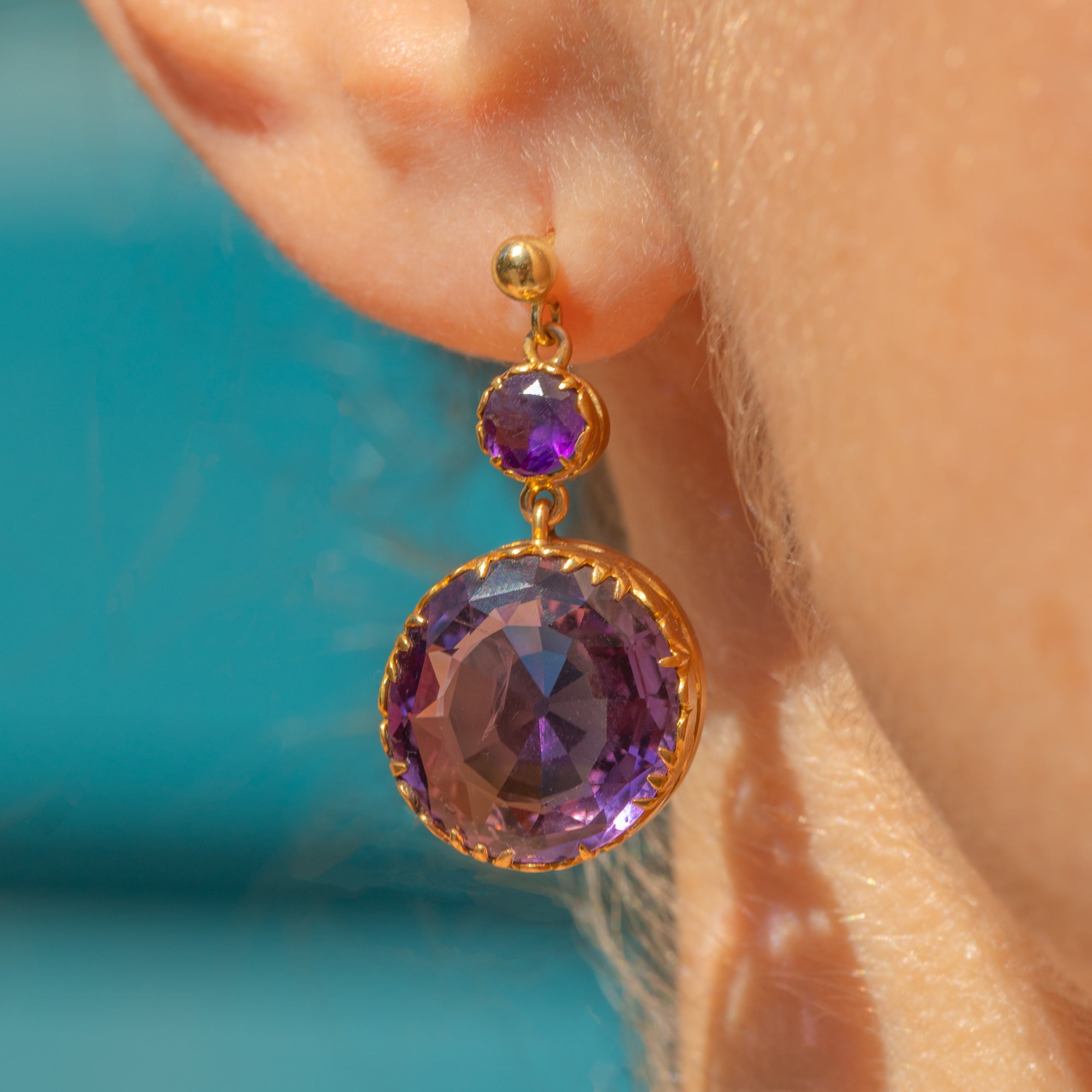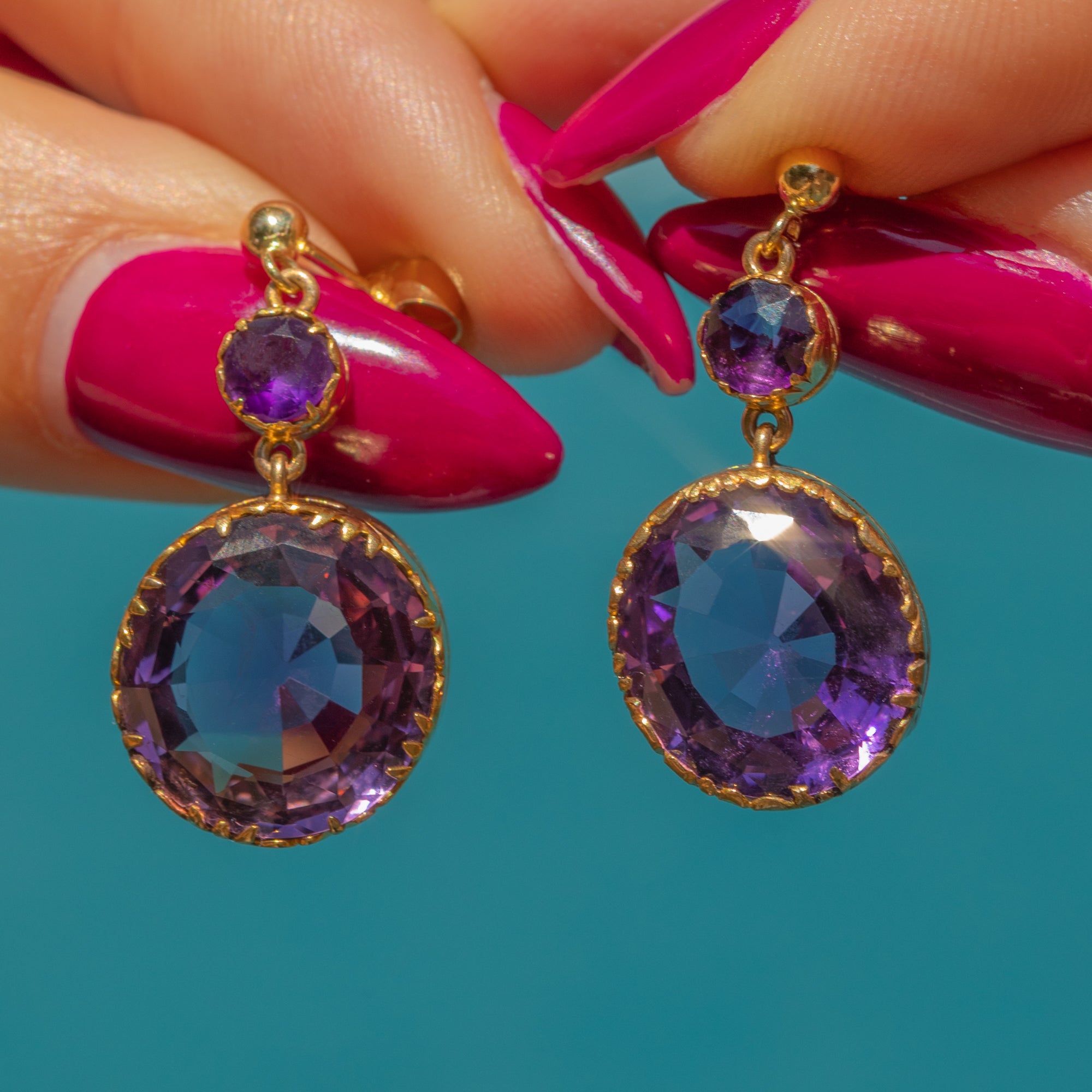 EXCELLENT: The Amethysts are stunning, vibrant and securely set, with no chips or surface wear. The Gold has a rich, buttery hue and shows no signs of wear around the settings, ensuring the gemstones remain securely set. There are subtle signs indicating the earrings were once converted from a different piece of jewellery, adding a touch of history to their charm.