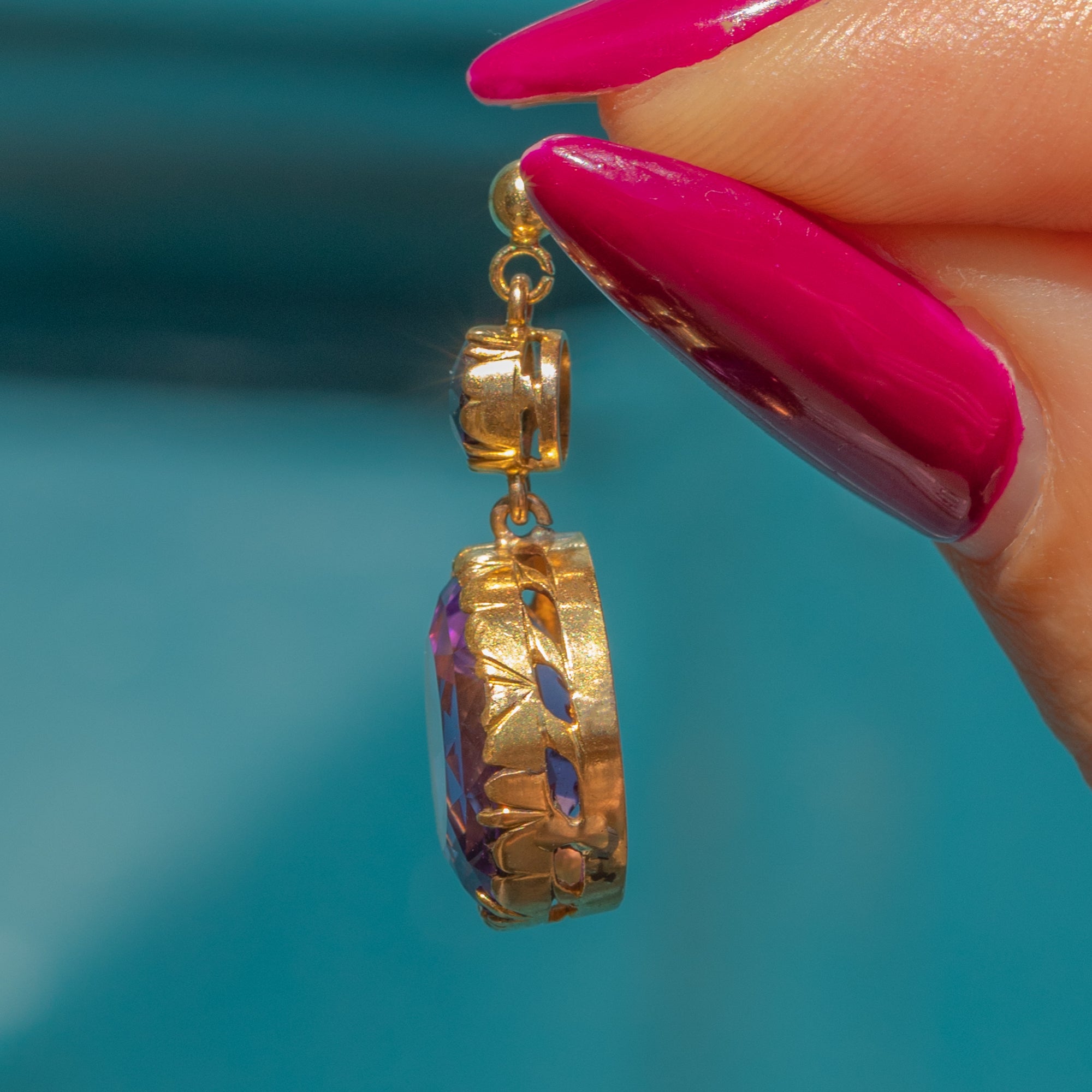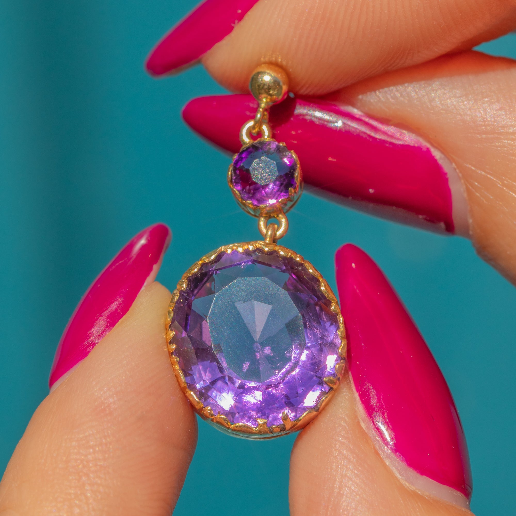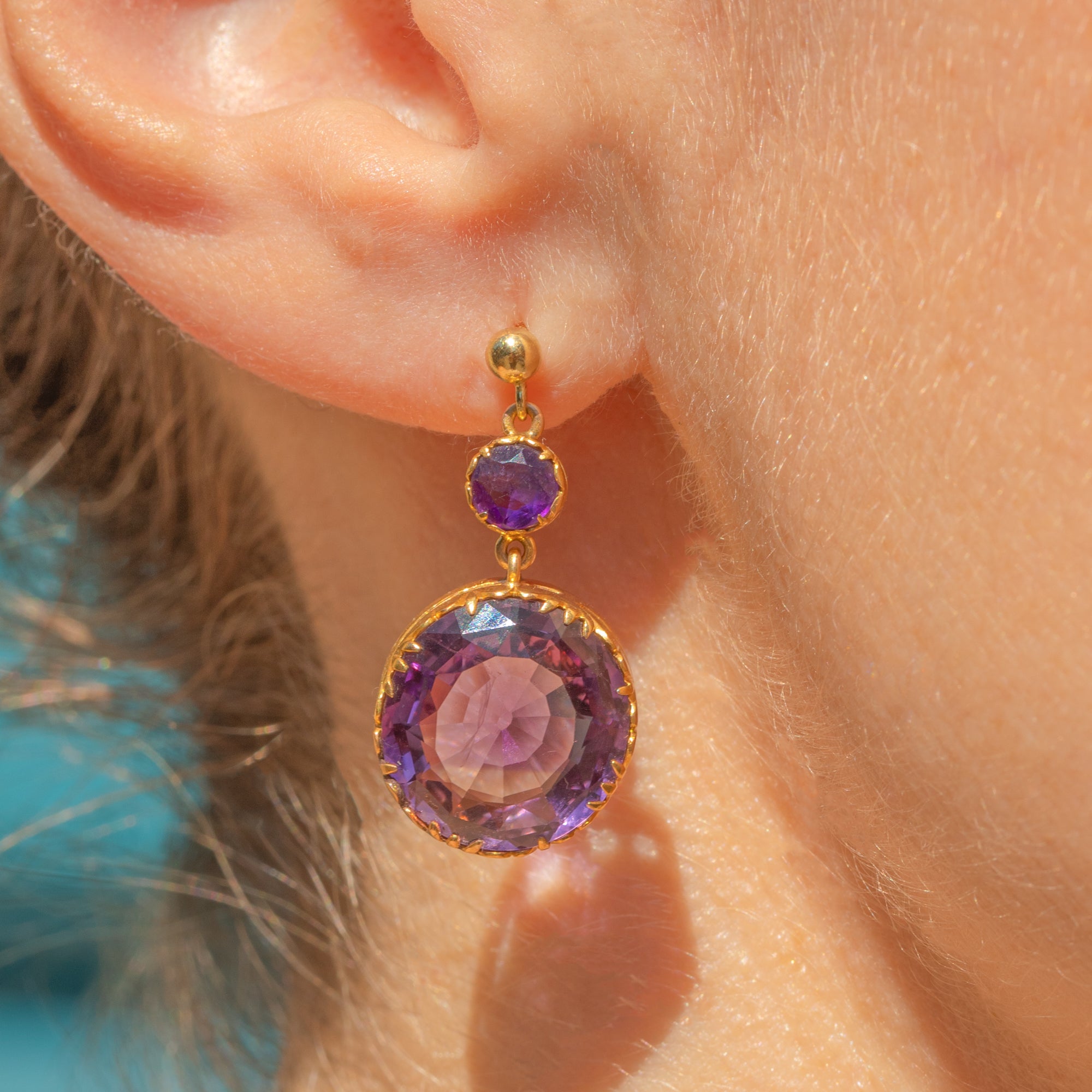 EXCELLENT: The Amethysts are stunning, vibrant and securely set, with no chips or surface wear. The Gold has a rich, buttery hue and shows no signs of wear around the settings, ensuring the gemstones remain securely set. There are subtle signs indicating the earrings were once converted from a different piece of jewellery, adding a touch of history to their charm.