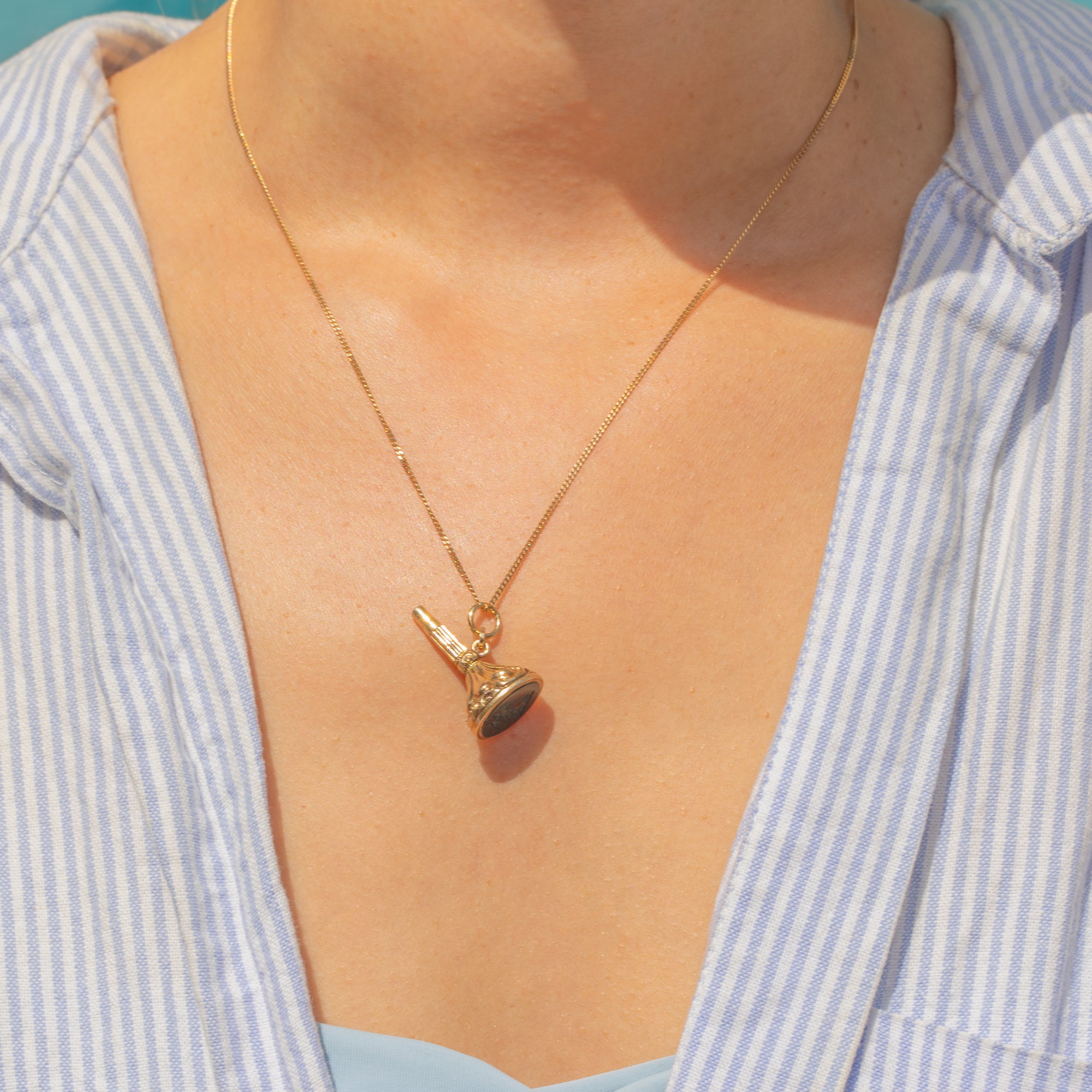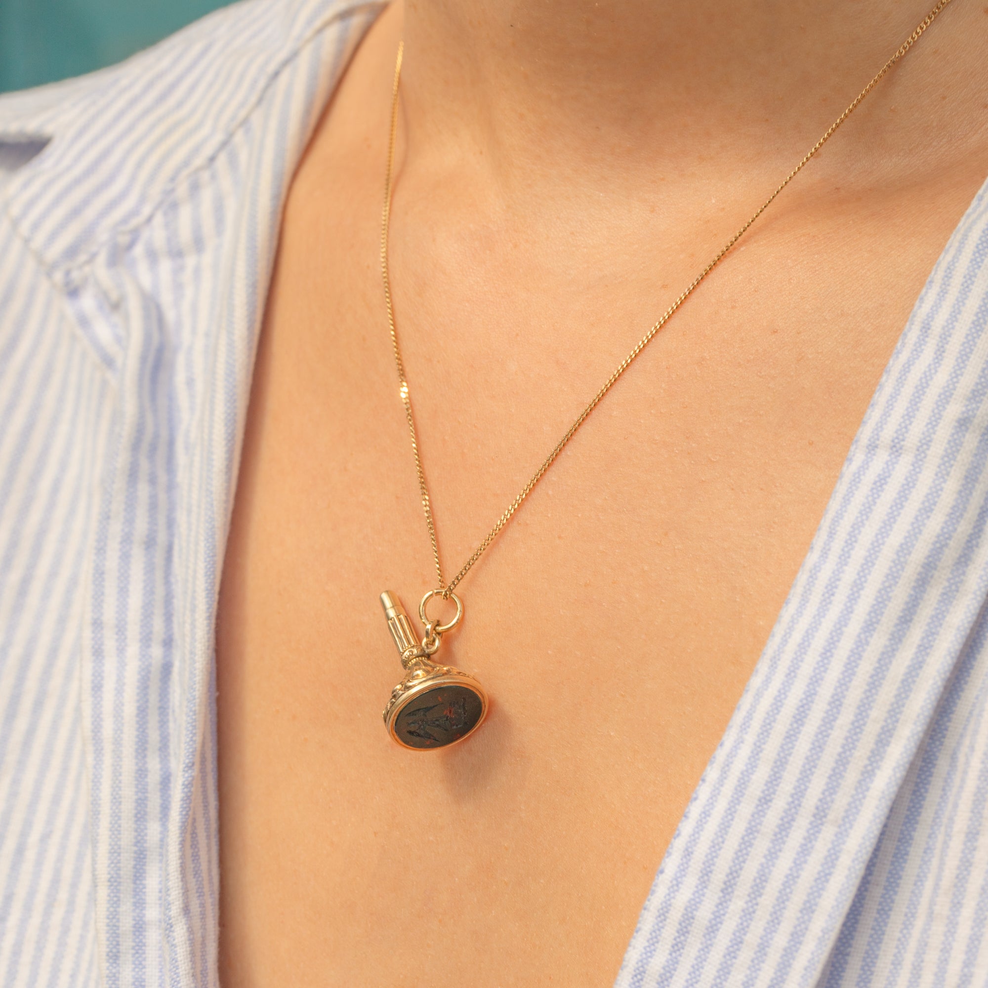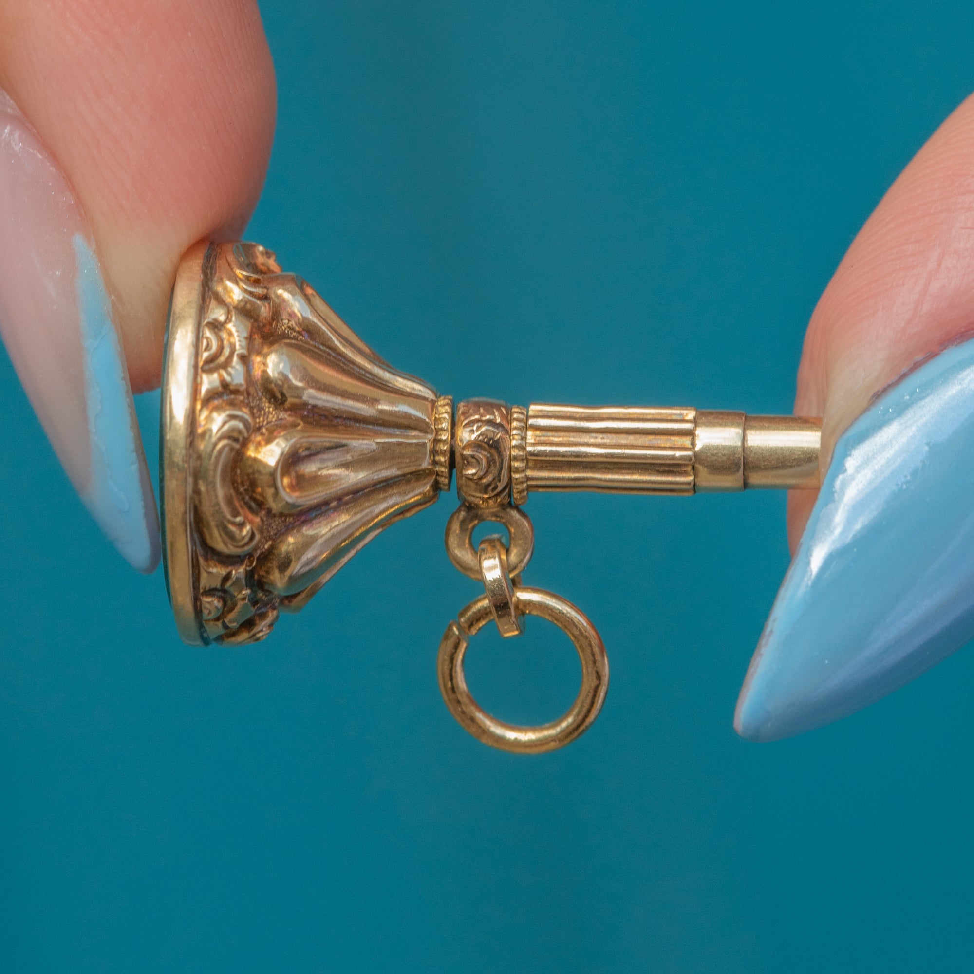 This Victorian fob pendant is the perfect everyday treasure! Crafted entirely from solid 15ct Gold, this watch key fob boasts an ornately formed pillar with a dark forest green Bloodstone displayed at its base.