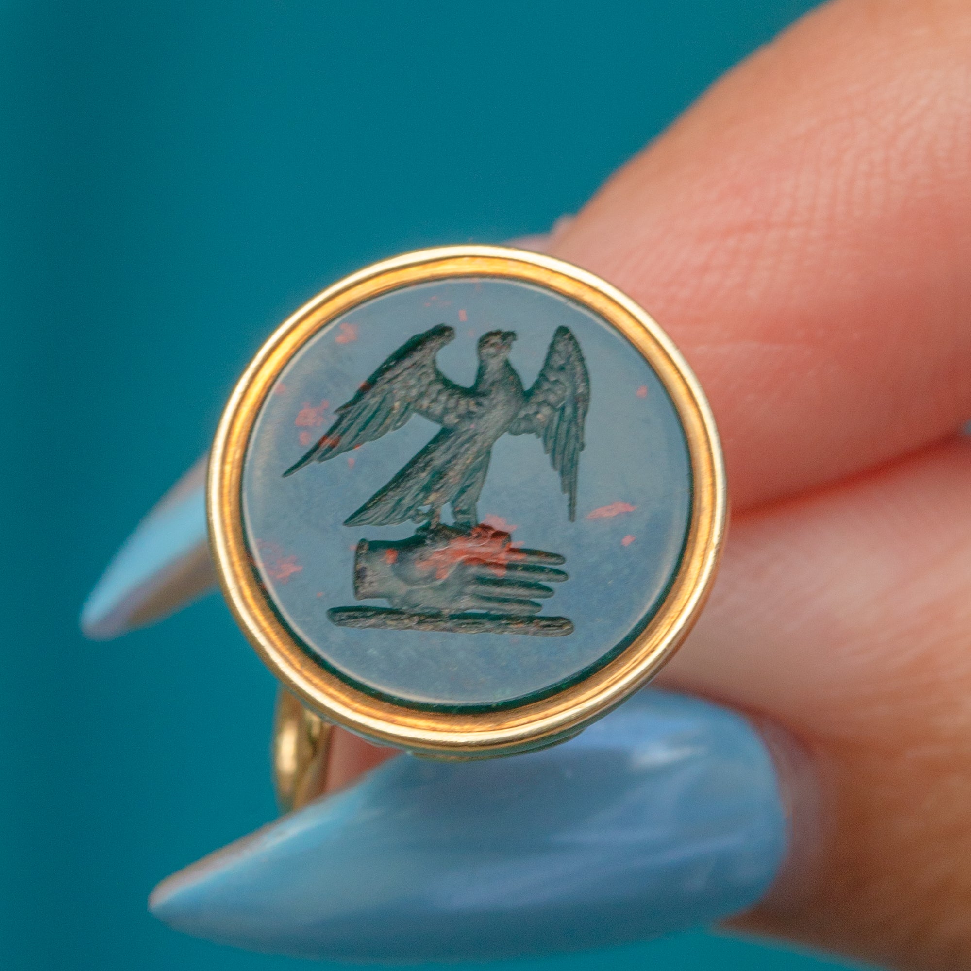 EXCELLENT: The Gold is brightly saturated and the engraved details remain defined. The Bloodstone is secure within its setting and the intaglio is crisp, free from chips or surface wear.
