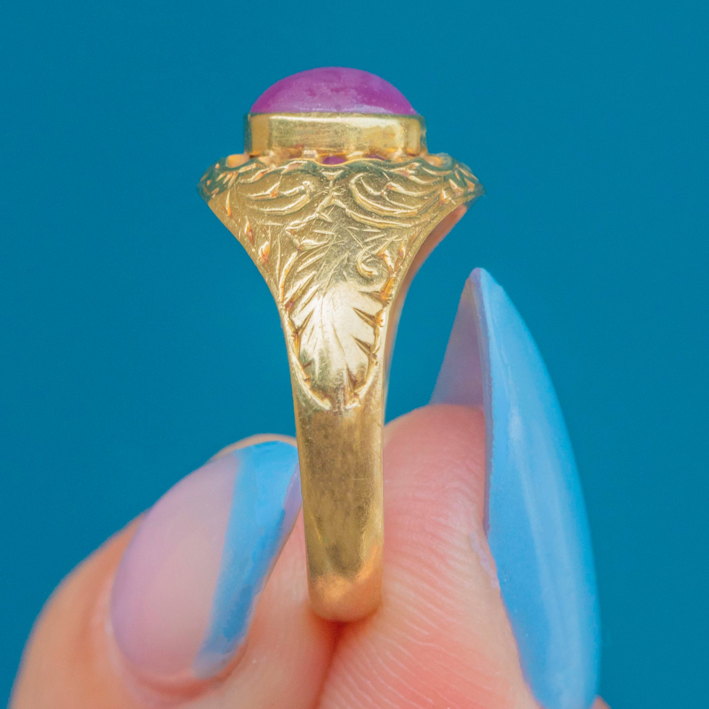 This engraved Victorian ring boasts a resplendent Star Ruby in its centre, radiating saturated magenta hues and flaunting a distinct asterism which provides the gemstone its namesake 'star'.