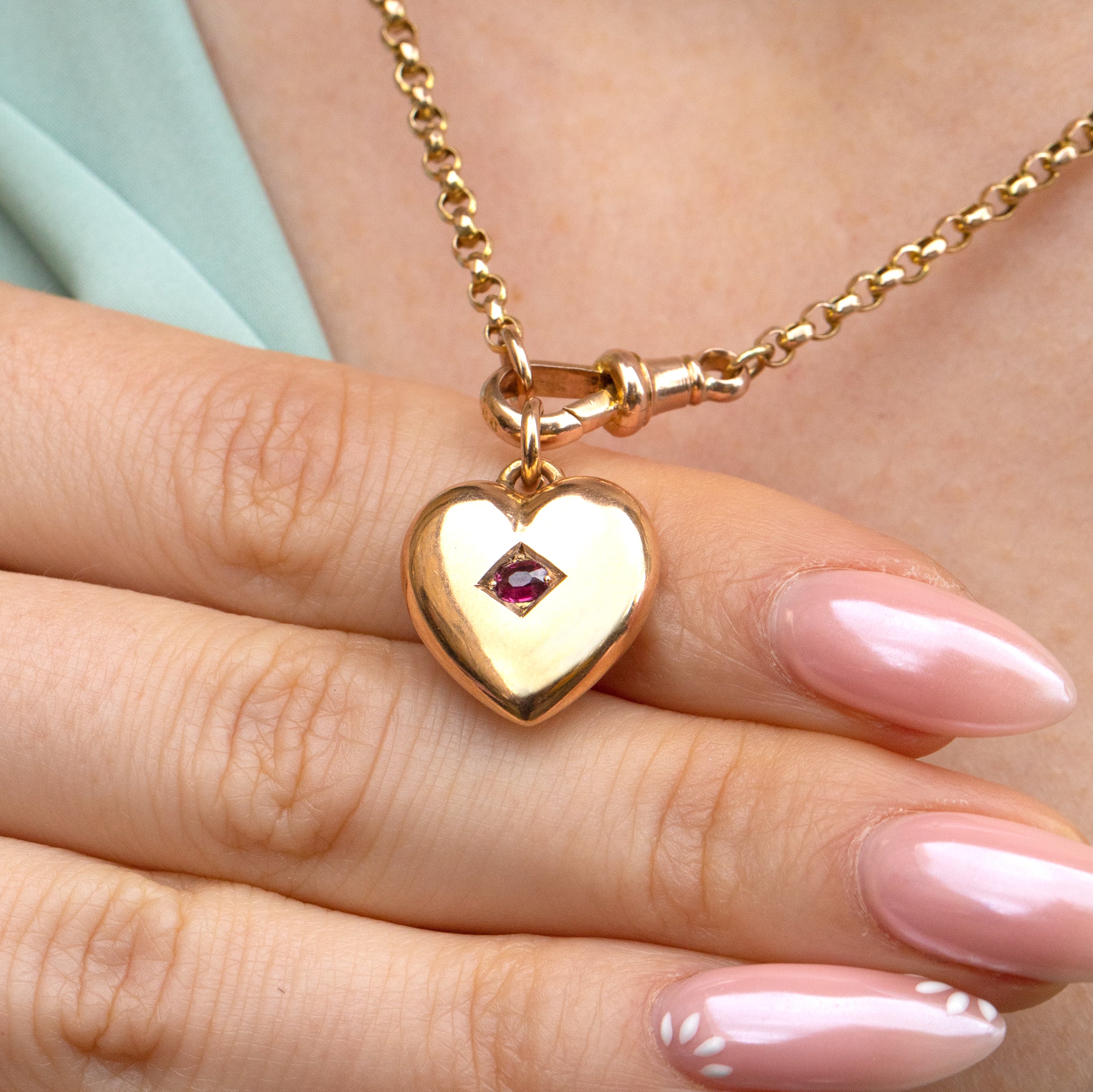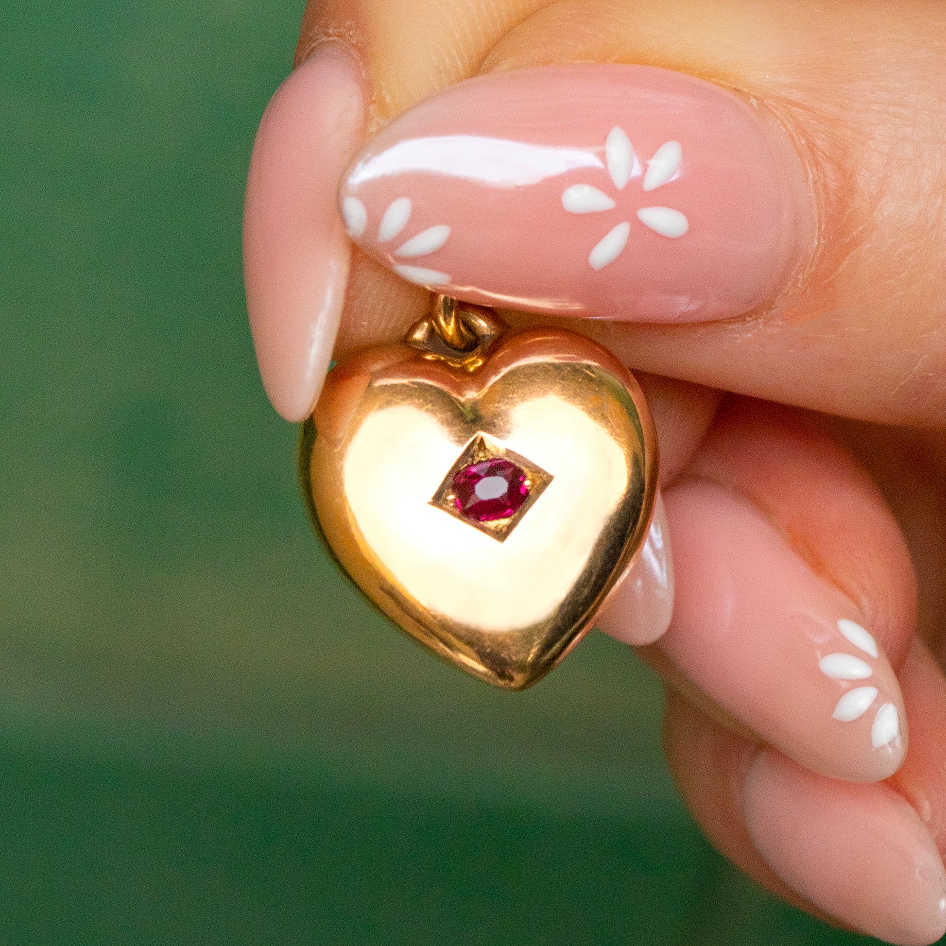 This is the sweetest antique 15ct Gold Garnet puffy heart pendant! Her curvaceous form is crafted from buttery 15ct Gold, with gorgeous reflective qualities that shimmer beneath the light.