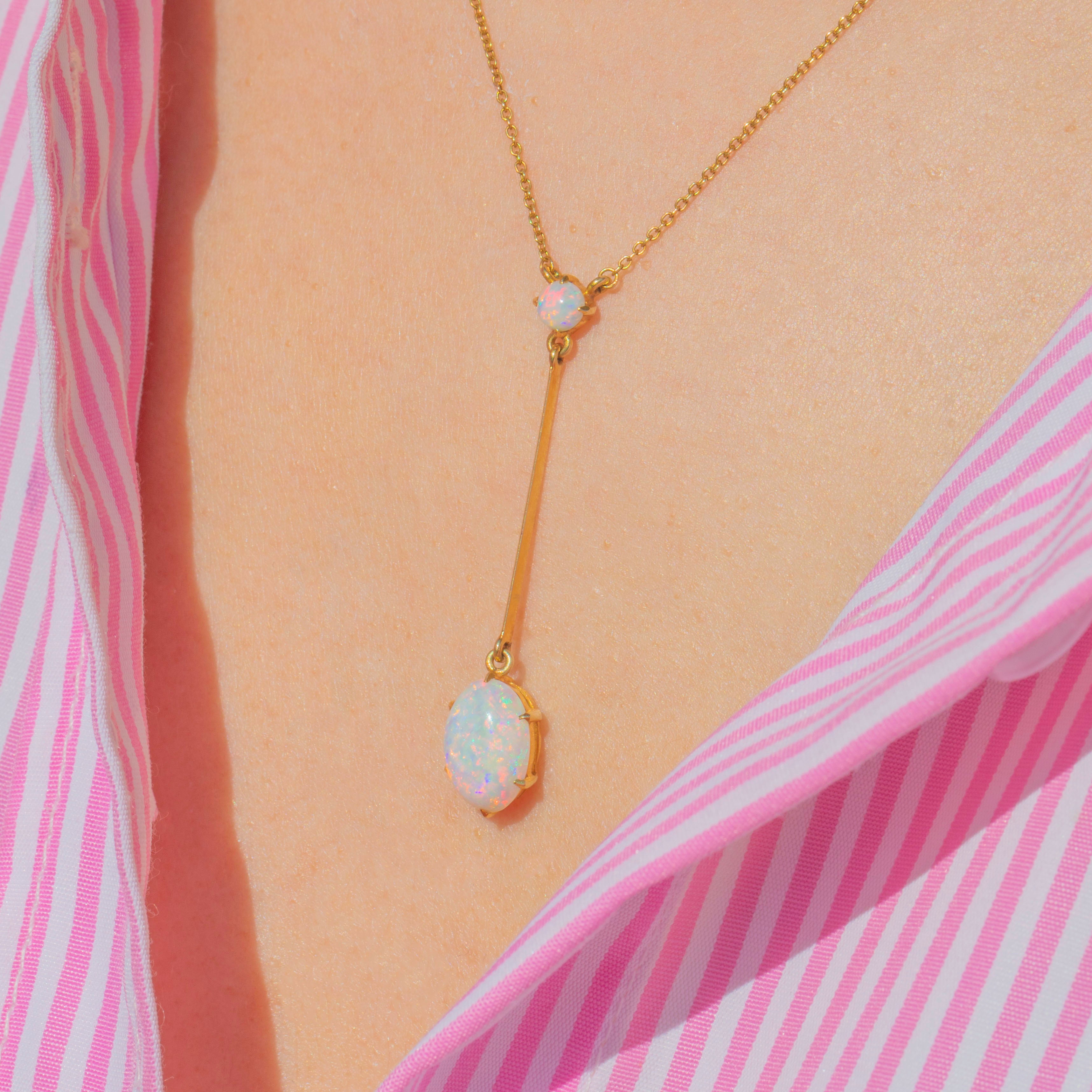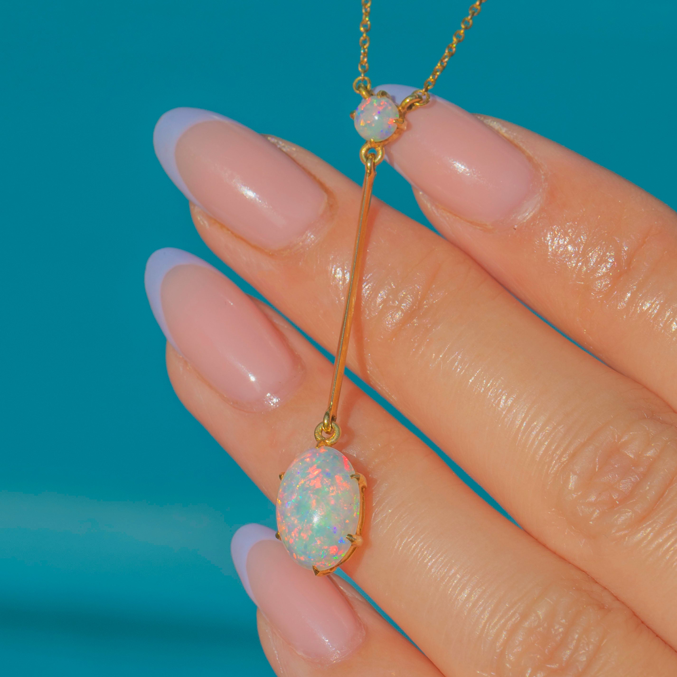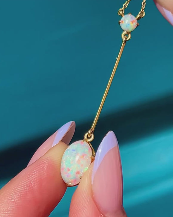 EXCELLENT: We are pleased to present this antique 15ct Gold Opal drop necklace in excellent condition. The Opals are smooth, with no signs of wear, and are securely held within their claw settings. The Gold is bright and buttery and each component is securely connected. With a fully functioning antique bolt-ring, you can enjoy wearing this Edwardian Opal necklace with utmost confidence!