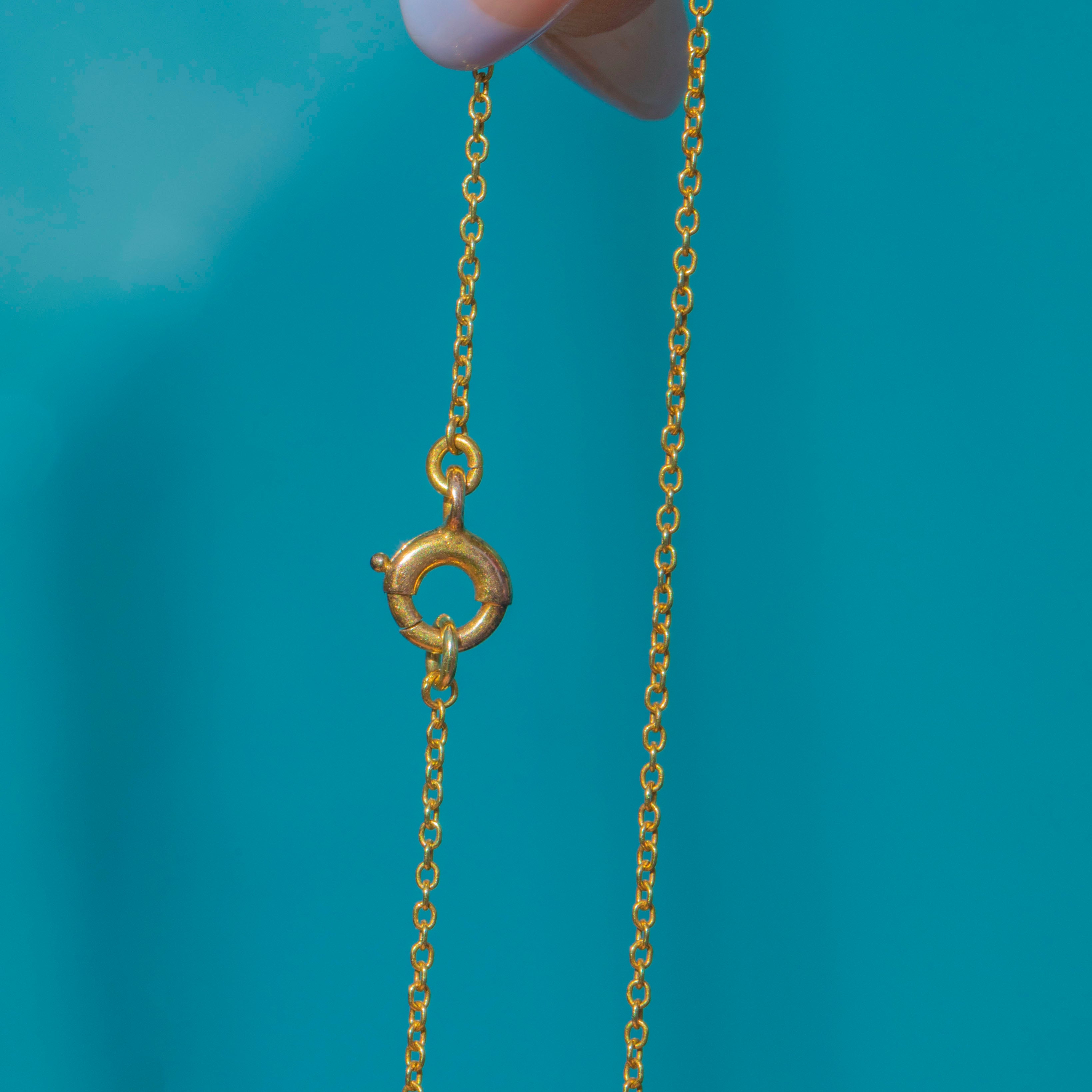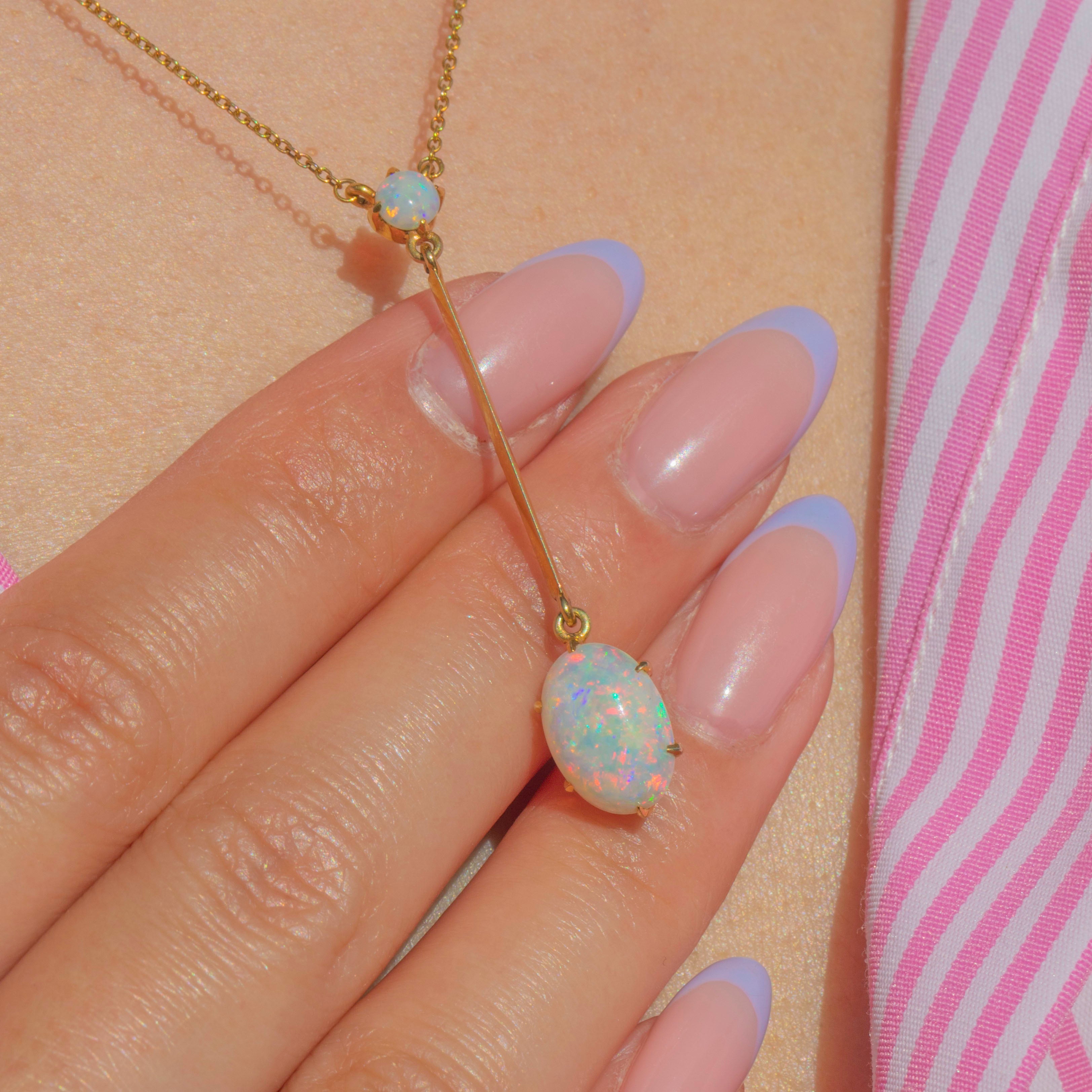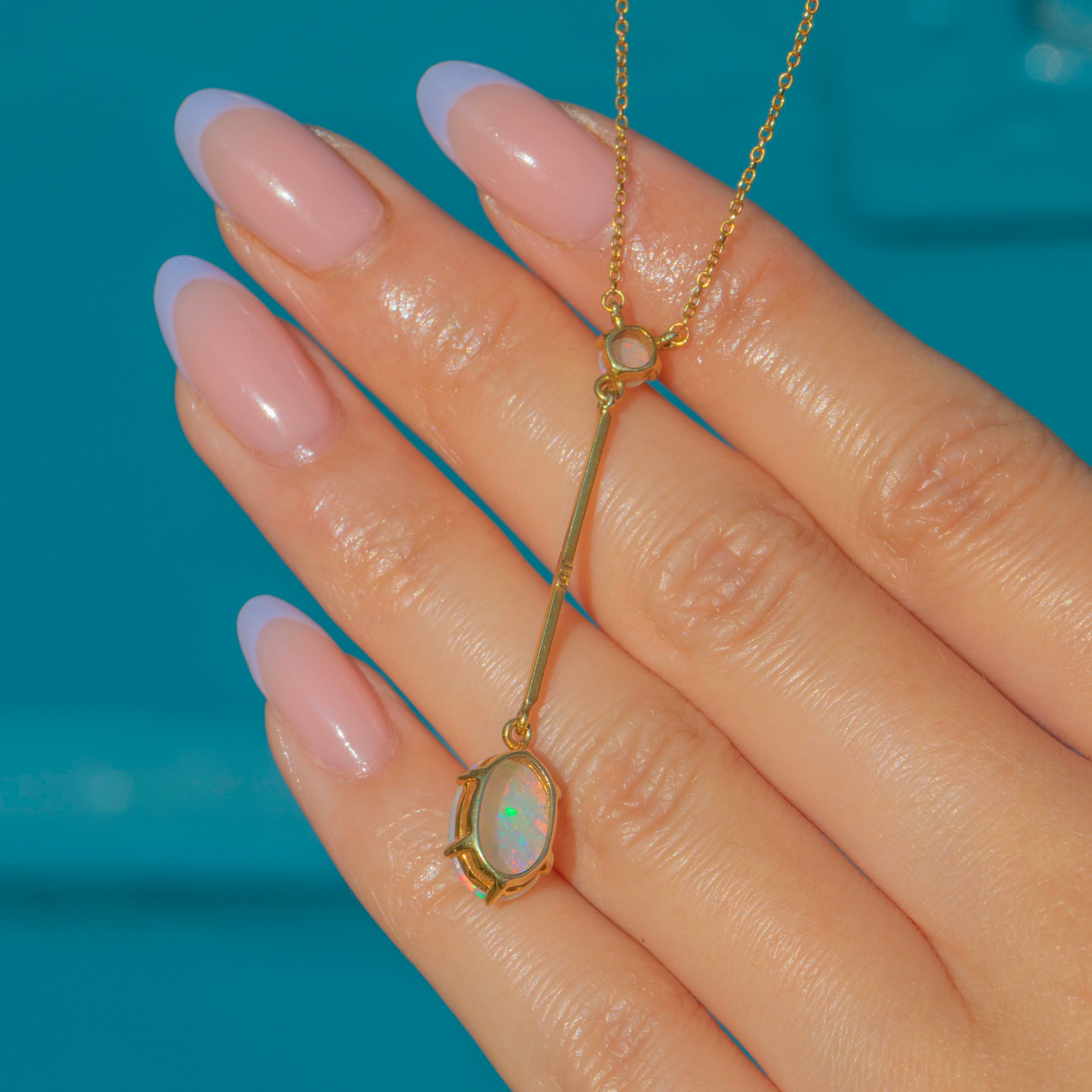If you have a penchant for elegant jewels, look no further than this antique 15ct Gold Opal drop necklace! Finely crafted from radiant 15ct Gold, this necklace displays 1.41cts of natural solid Opal with a lively play-of-colour.