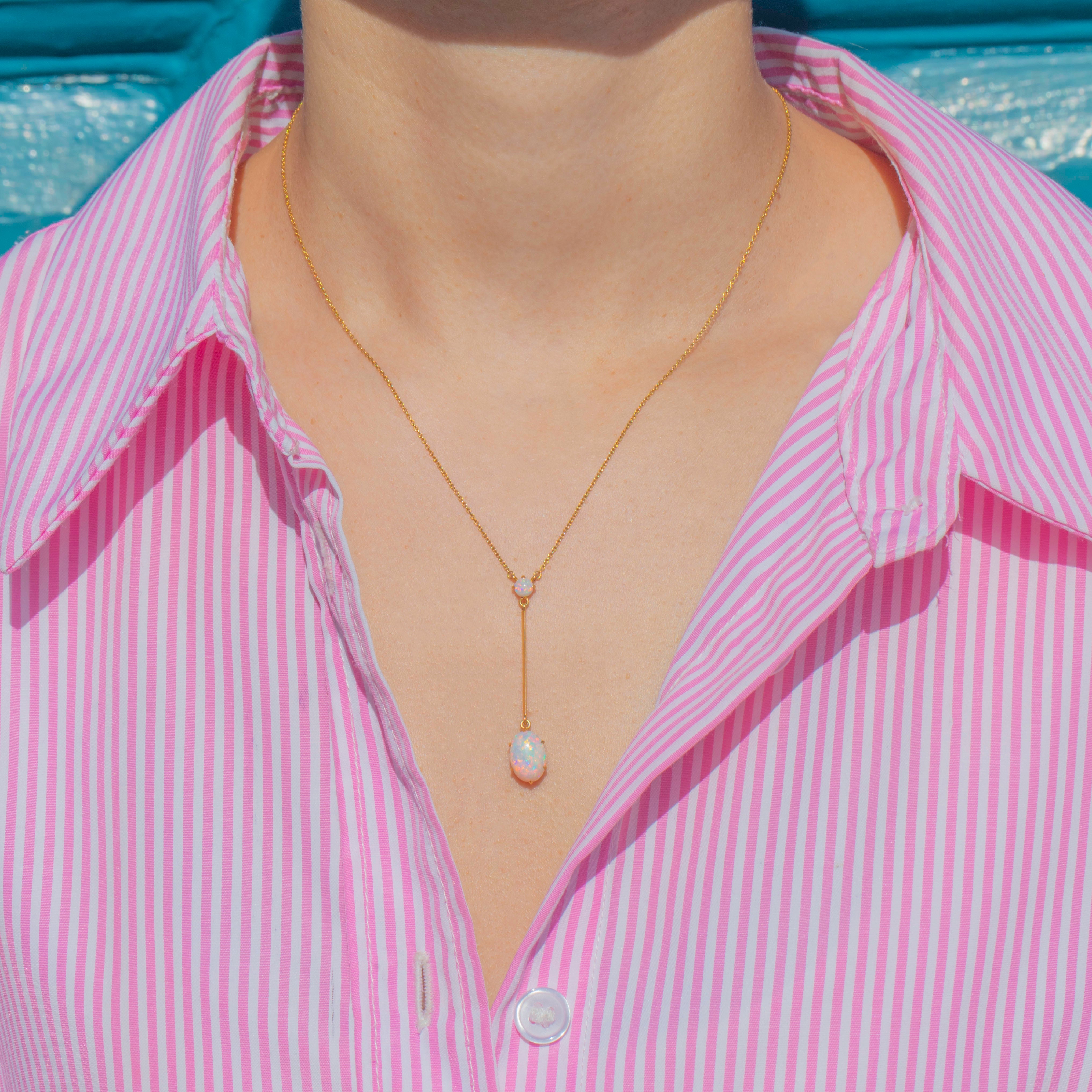 The two Opal cabochons come to life beneath the light, each one an explosion of confetti hues, and are connected by a Gold knife-edge bar creating a refined silhouette. The pendant drop is suspended from a 16" chain, allowing the Opals to rest centrally between your collarbones.