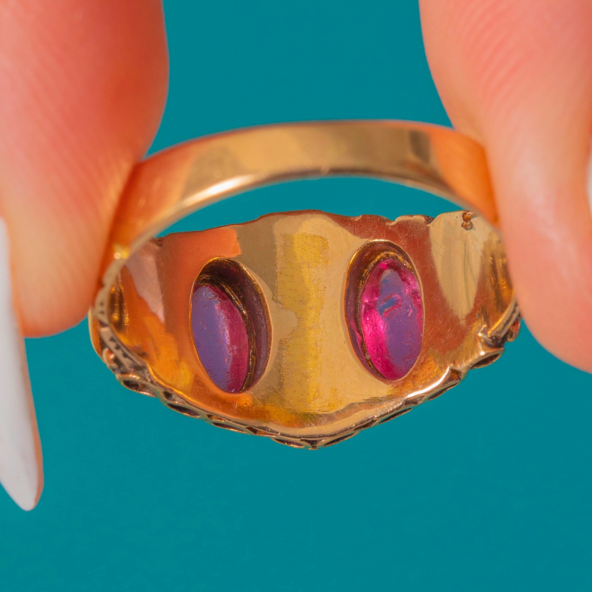 This antique ring is an exemplar of Victorian craftsmanship, formed from buttery 15ct Gold throughout with ornate settings and engraved shoulders providing her with a lovely texture. A brilliant piece to stack or wear alone, this antique Paste and Pearl ring is a must-have!