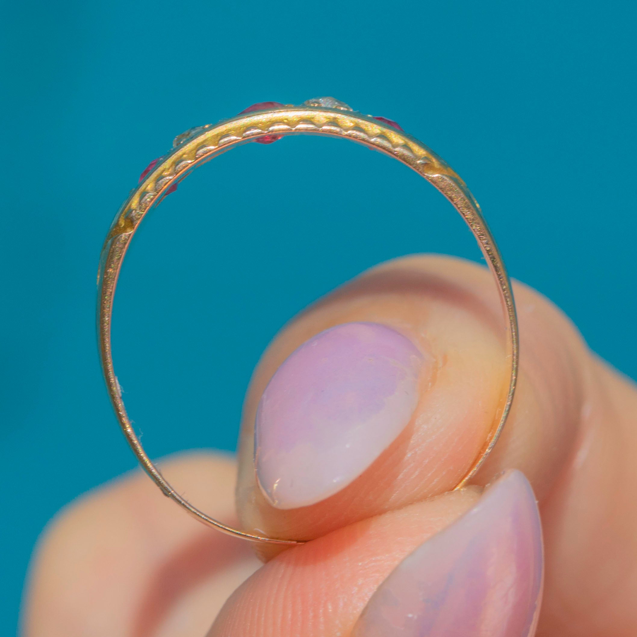 VERY GOOD: Each gemstone is secure within its setting with no damage to note. The Rubies have a wonderful, deep crimson hue and no chips or abrasions, while the rose-cut Diamonds are charmingly bright and lively. The ring band has maintained a great shape. On the back of the band, there is some variation to the Gold tone due to a previous resizing, which has resulted in the loss of some hallmarks; however, this cannot be seen when worn. This Ruby Diamond ring will make a gorgeous addition to your collection!