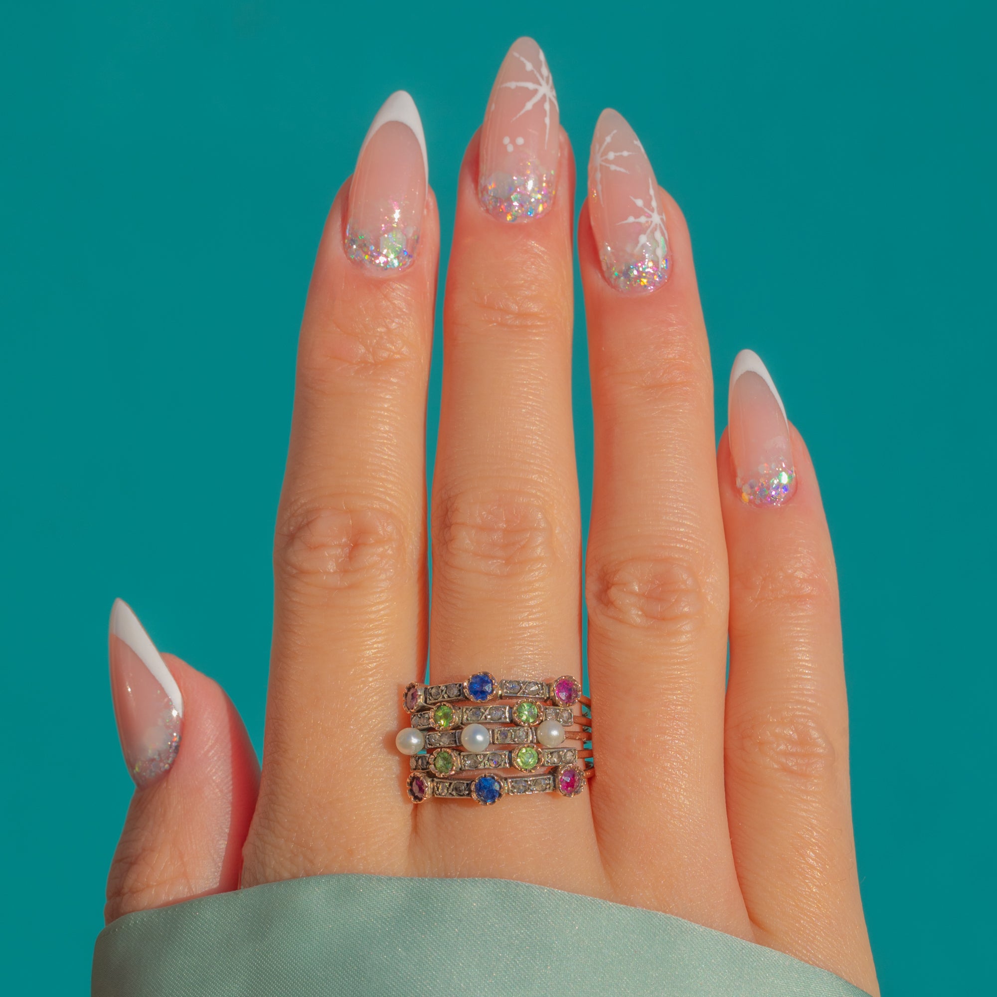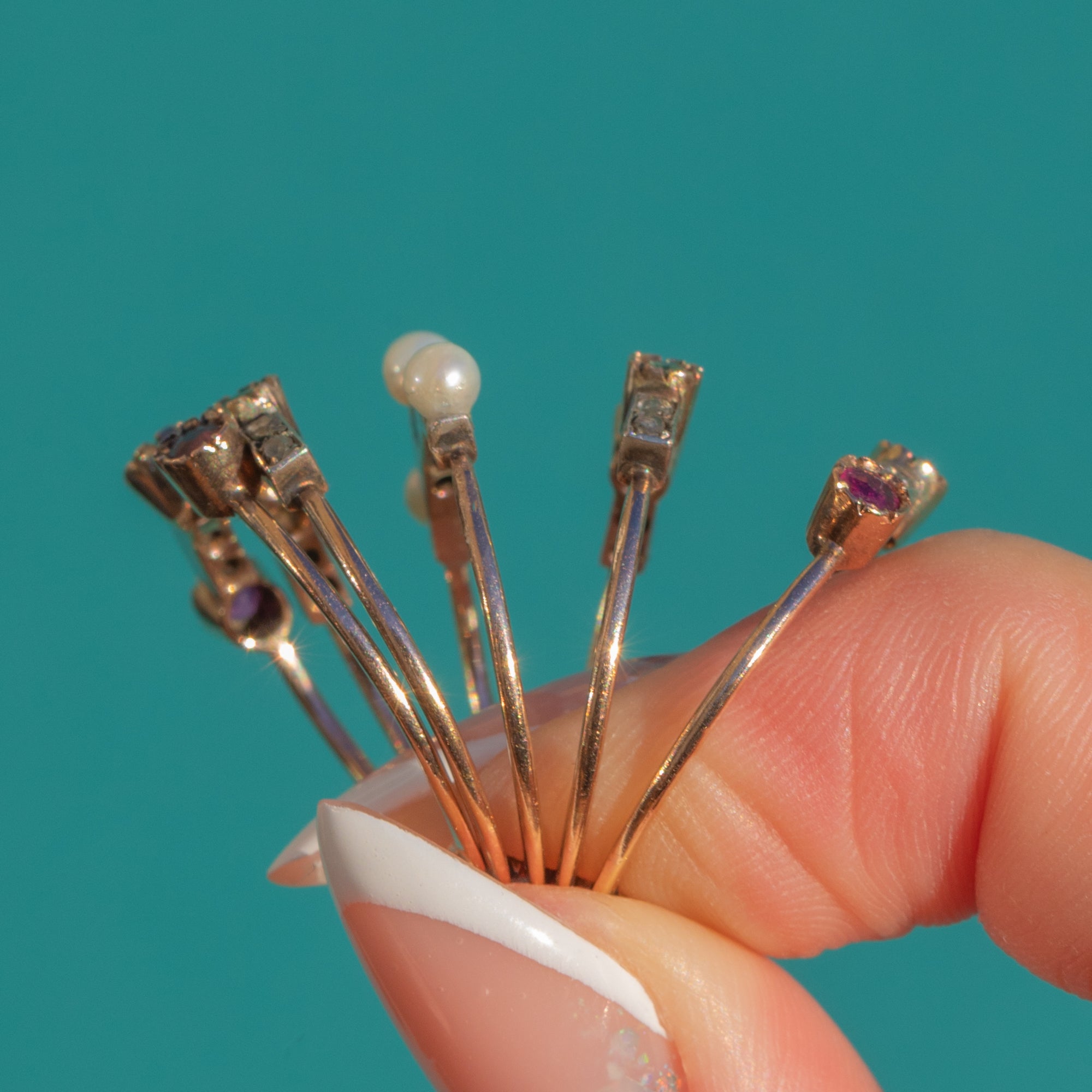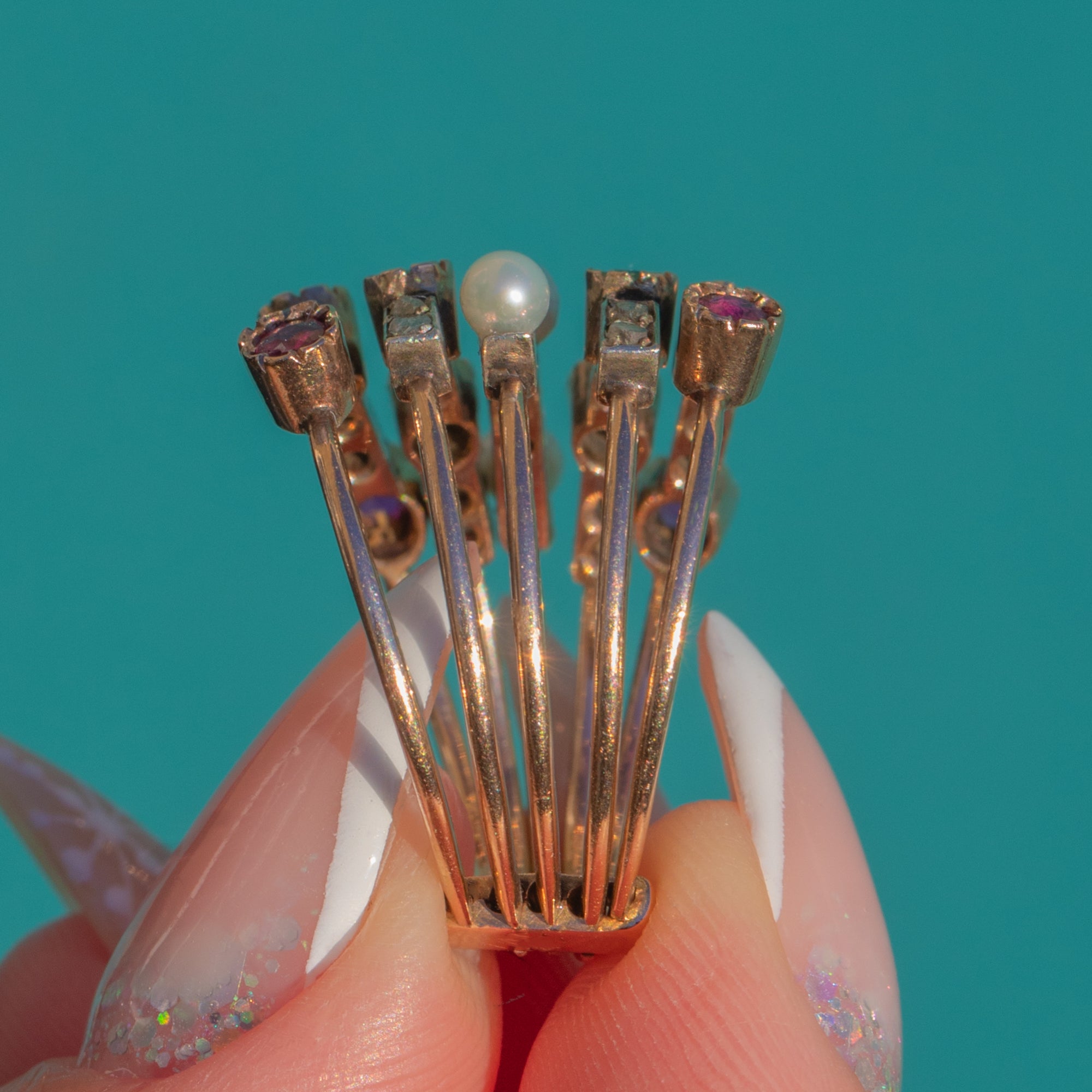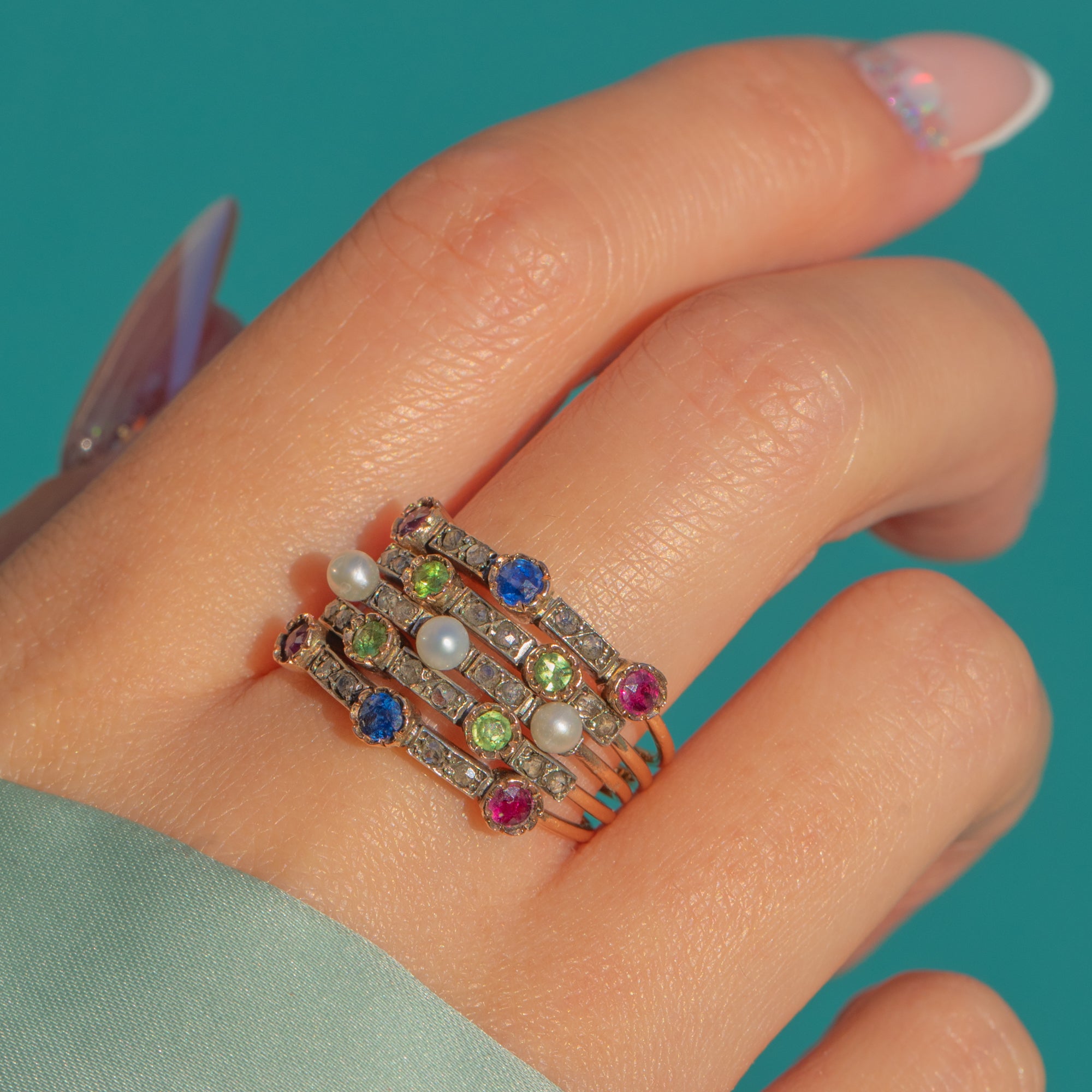 A joyful kaleidoscope of Victorian colour, this 15ct Gold harem ring brings together Rubies, Sapphires, Demantoid Garnets, Pearls and twinkling rose-cut Diamonds in one sumptuous stack. Each slender band is set with its own line of gemstones, creating a delicious rainbow effect that looks like a perfectly curated ring stack in a single, wearable piece.