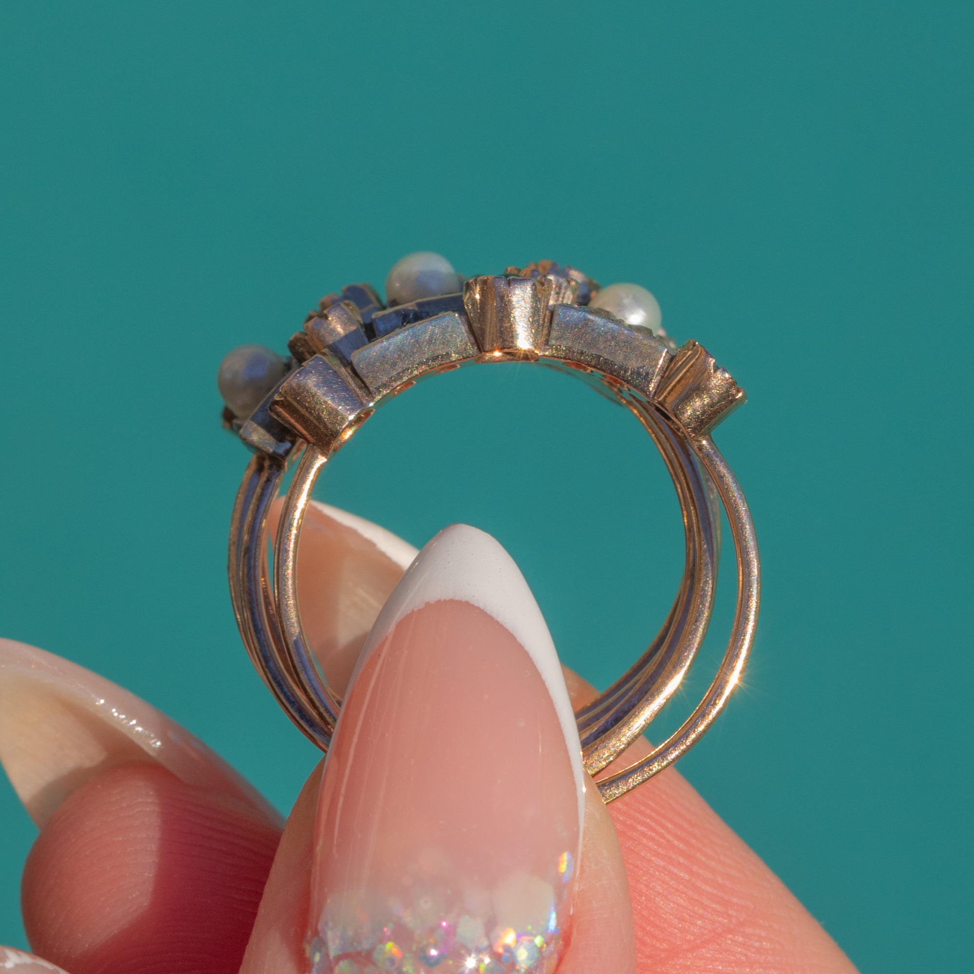 Dating to c.1890, the warm 15ct Gold and Silver settings give this ring that unmistakable Victorian glow, with rich red Rubies, inky blue Sapphires, vivid green Demantoid Garnets, creamy Pearls and sparkling Diamonds dancing across the finger. The wide, tapering band hugs the finger beautifully, making it a striking statement ring that still feels comfortable enough for everyday decadence.