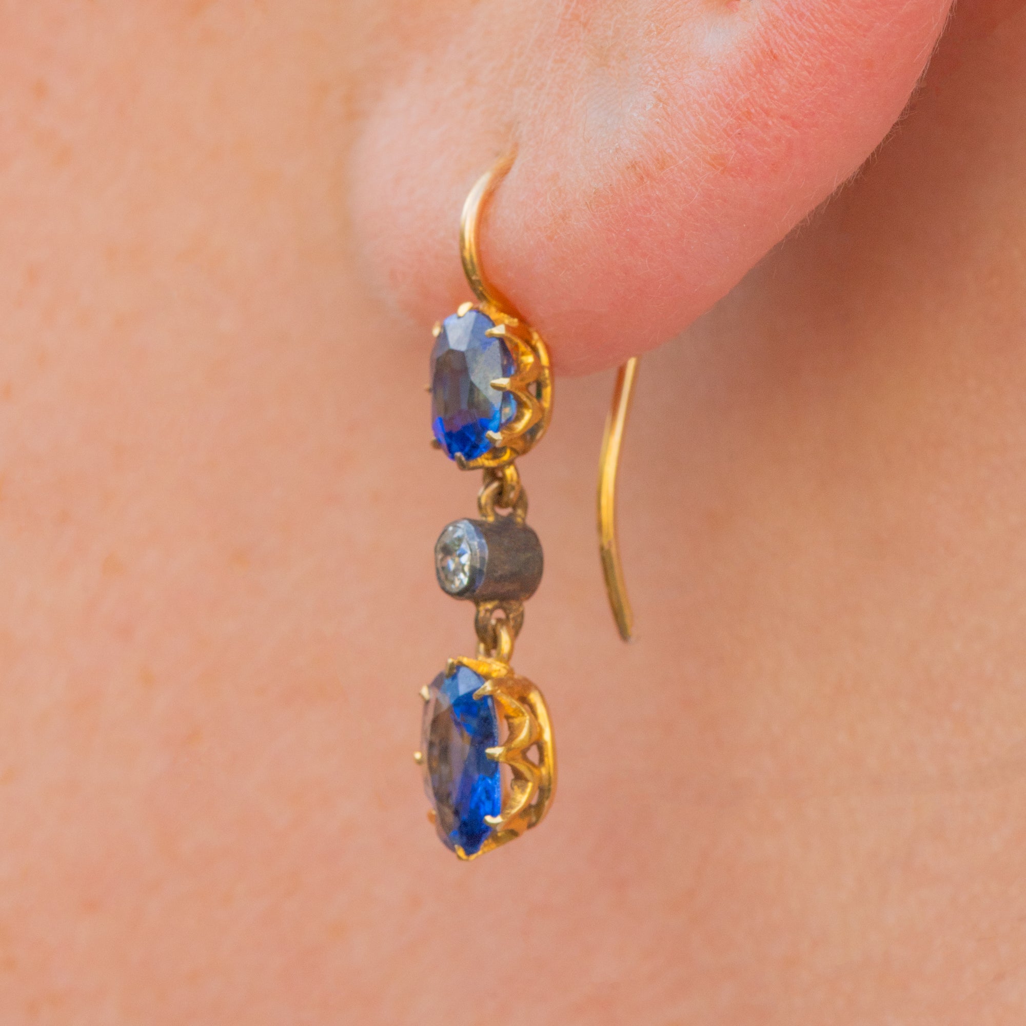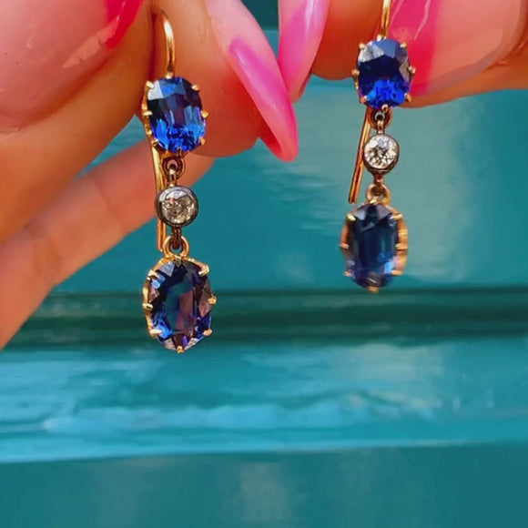 A sublime pair of antique 15ct Gold Sapphire Diamond drop earrings for your collection. Forming an elegant three-stone drop, rich indigo-hued Sapphires, and a sparkly Diamond adorn this pretty pair.