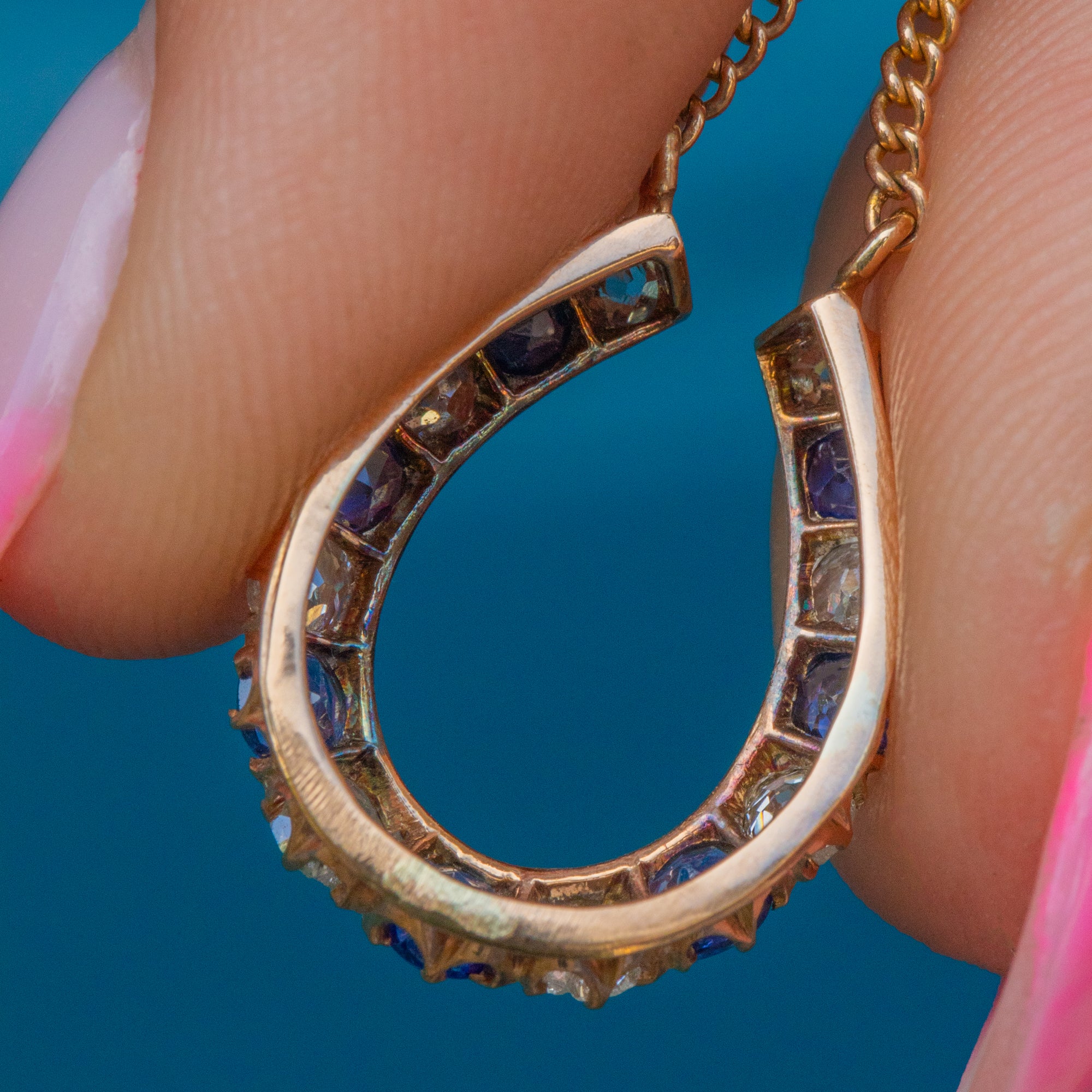 Bring luck into your repertoire with this antique 15ct Gold Sapphire Diamond horseshoe integral necklace! This integral horseshoe necklace will be the belle of the ball, inlaid with midnight blue Sapphires, totalling 0.35ct, and alternating with dazzling Diamonds for an effortlessly elegant finish.