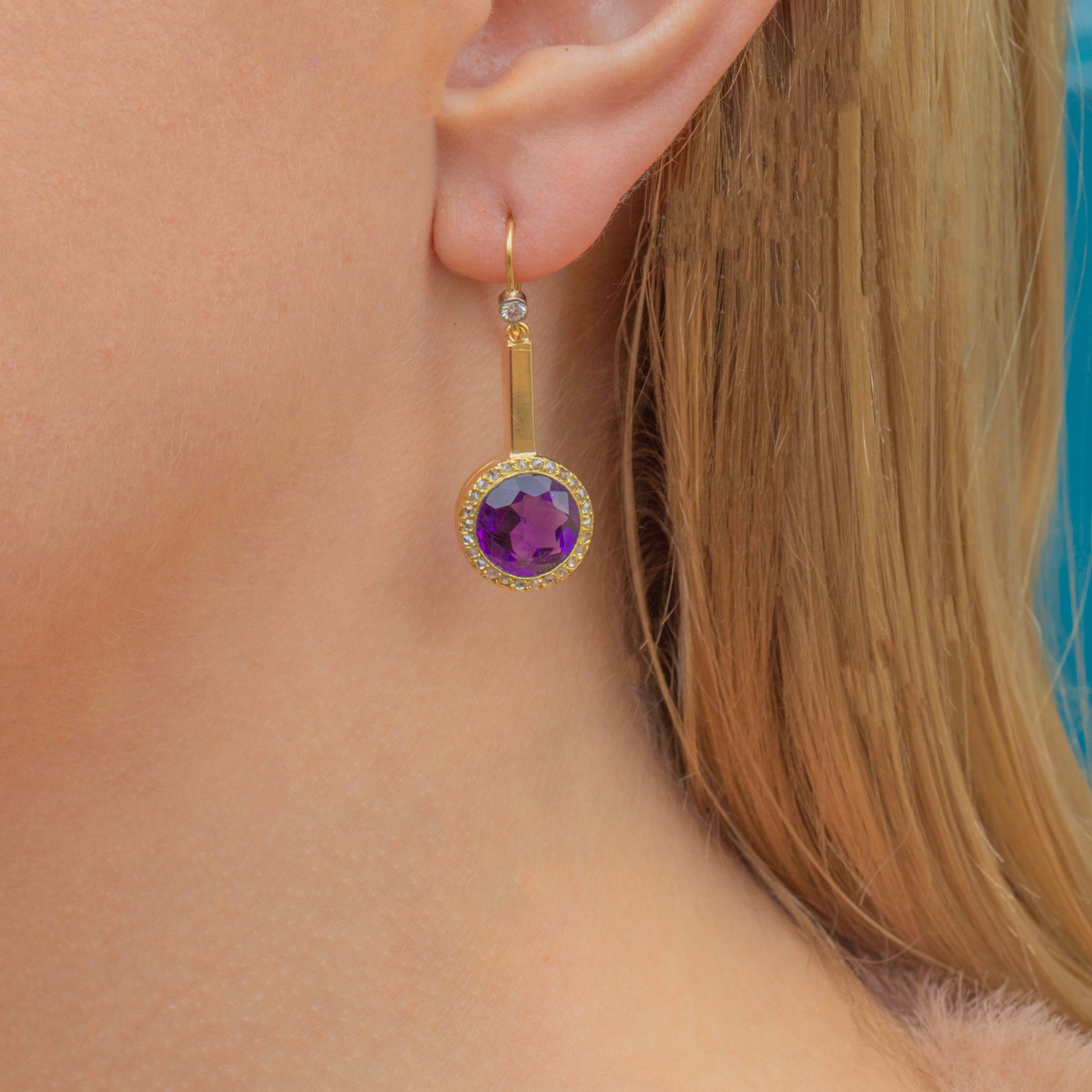 Each earring features a vivid Siberian Amethyst centre with the most intense rich and noble purple hue, in a halo of twinkling Rose-cut-Diamonds. They nestle into buttery 18ct Gold settings and fall pendulously with just the right amount of swing and movement to feel (and look) amazing!