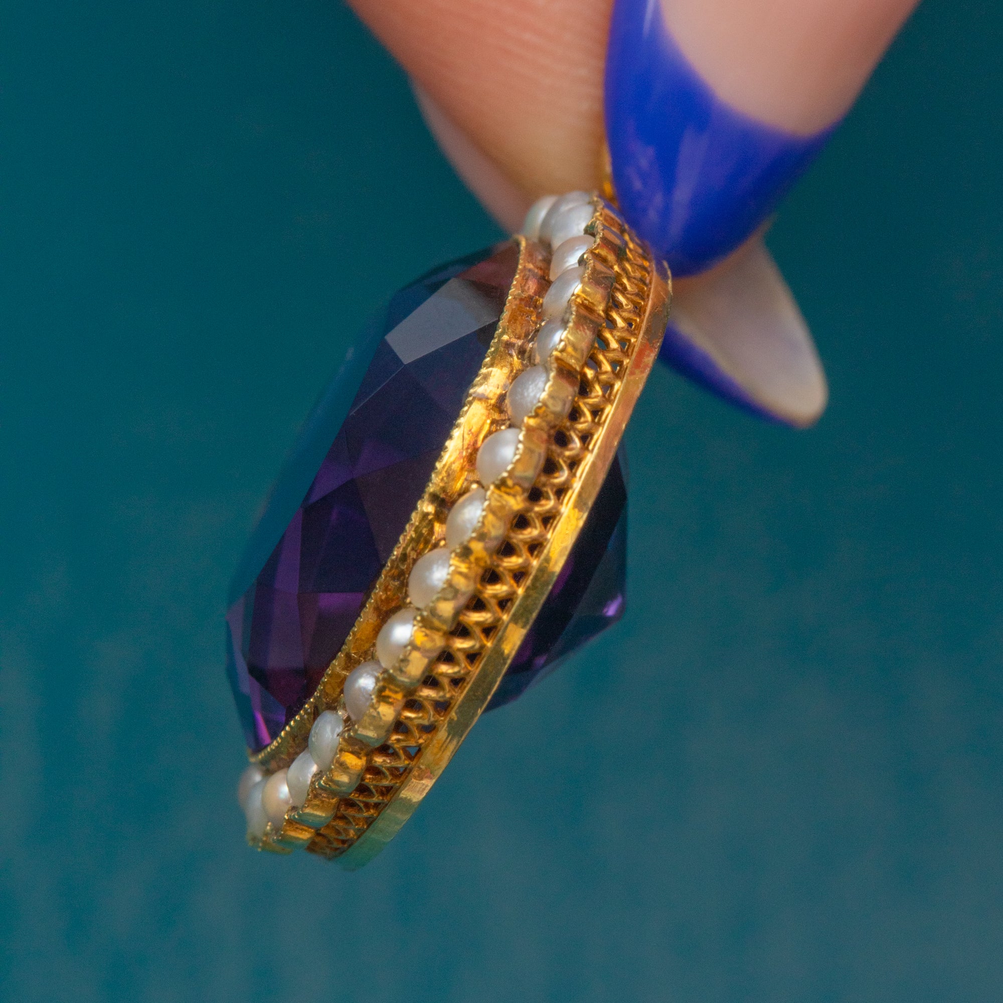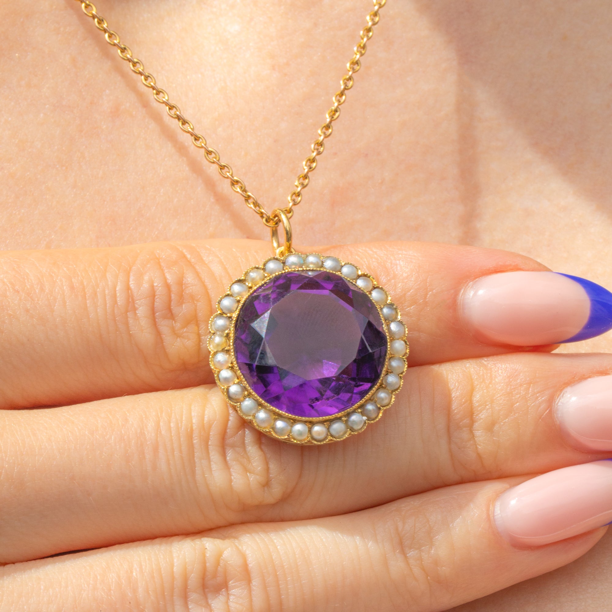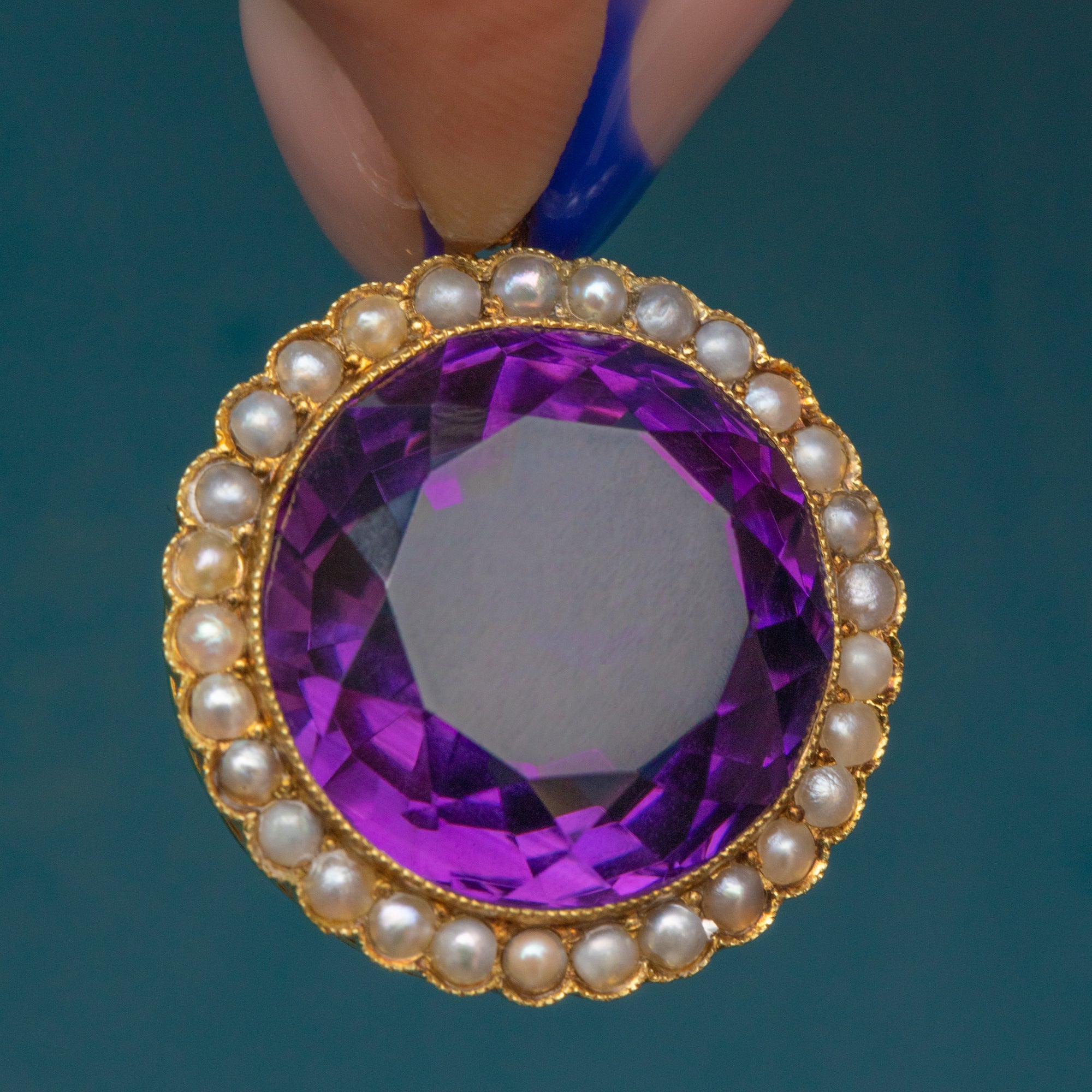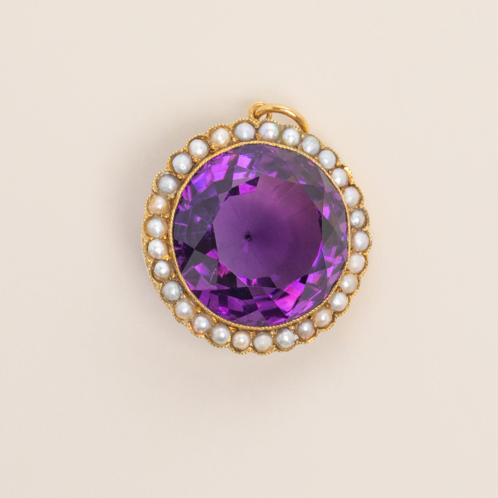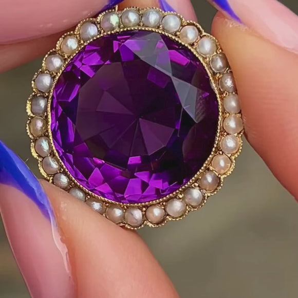 This antique 18ct Gold Amethyst Pearl cluster pendant demands attention! Homing a 14.85ct Amethyst, her vivacious violet hues dance between her fabulously faceted form, haloed by a sea of shimmering Pearls.