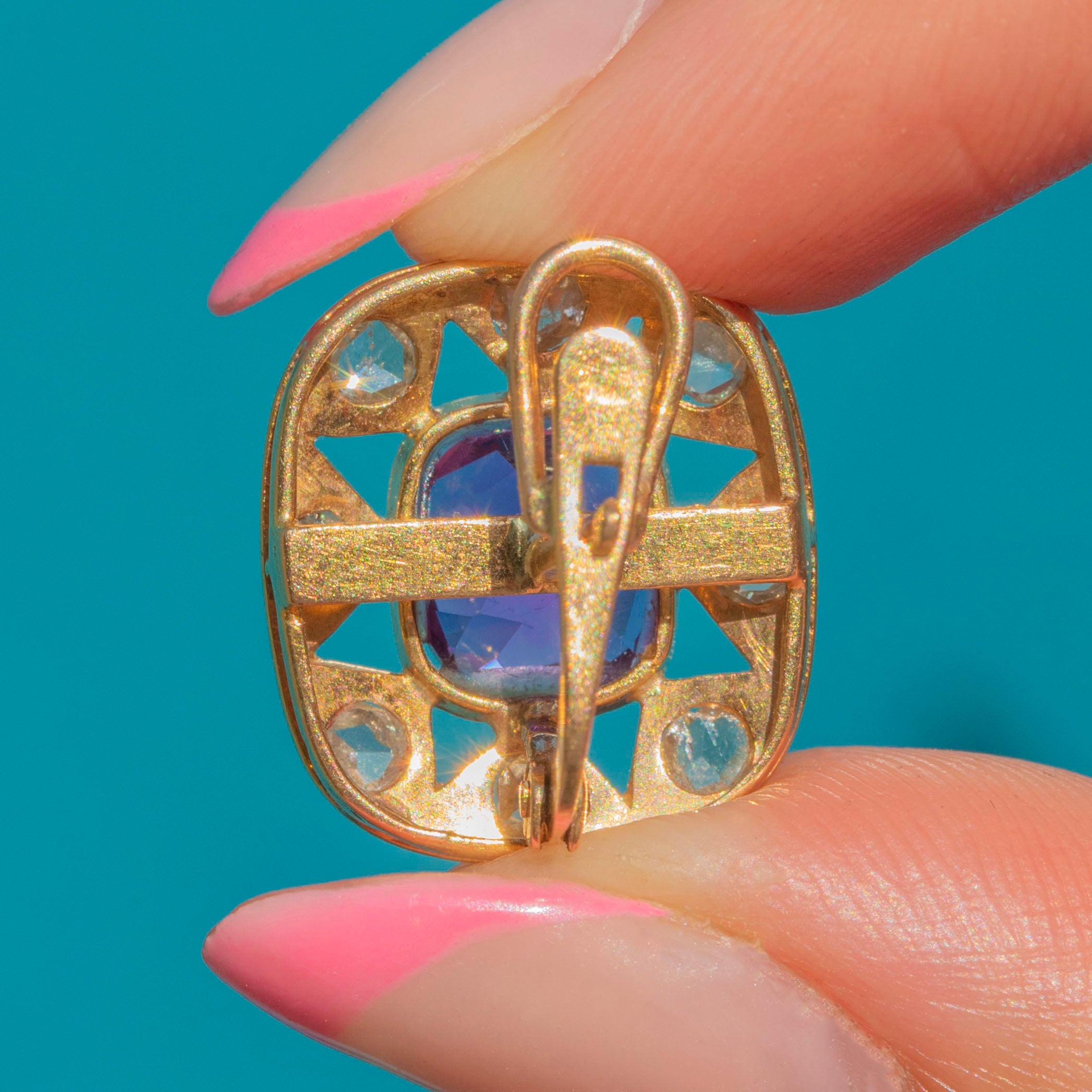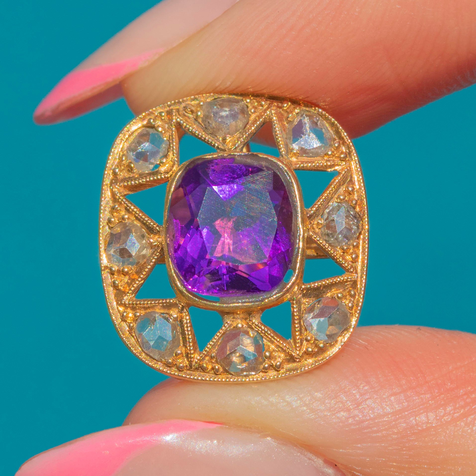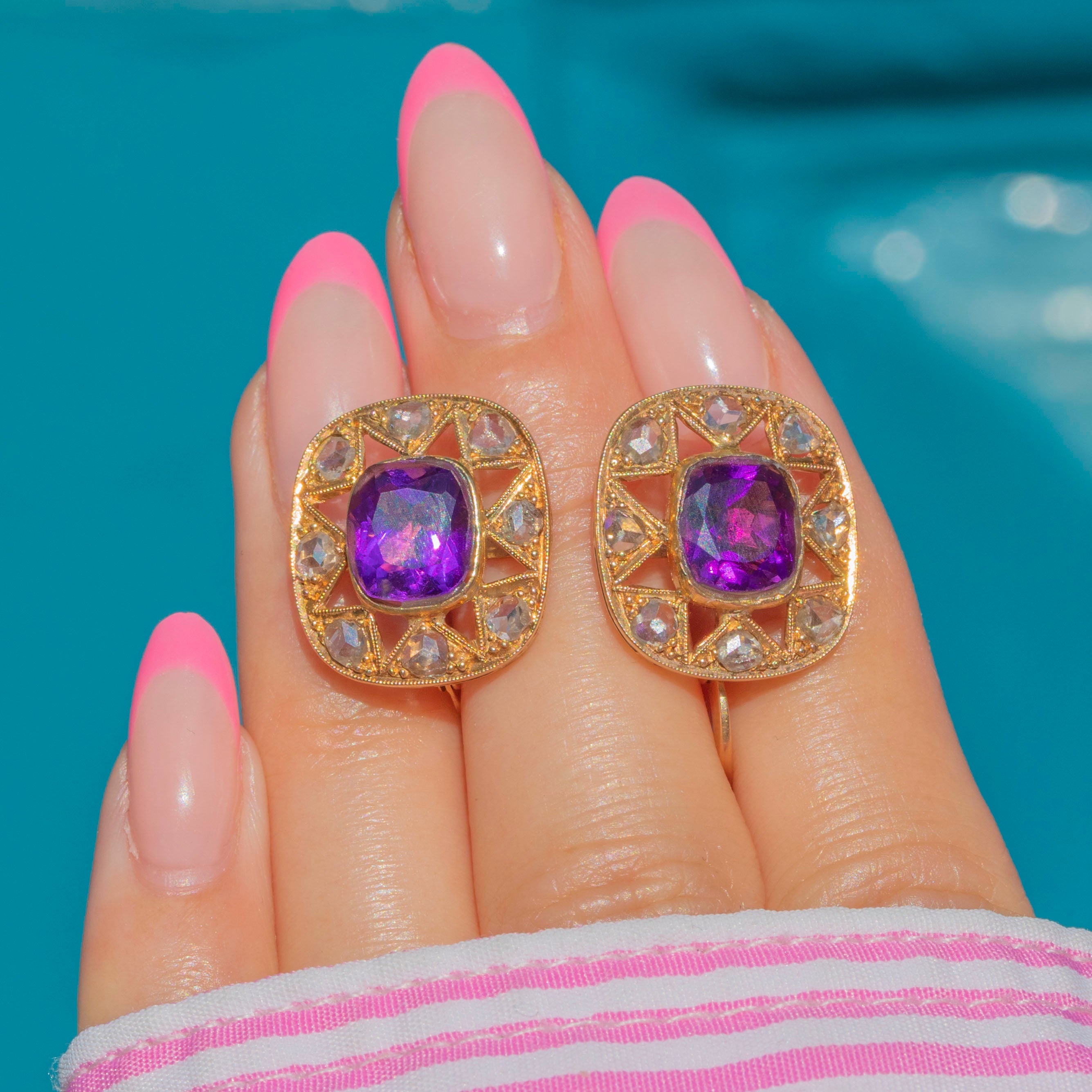 GOOD: These antique 18ct Gold Amethyst rose-cut Diamond star cluster earrings are in good condition. The Amethyst and Diamonds sparkle beautifully and while one or two of them do have some minor chips to the surface, they still captivate all who set their eyes on them. The openwork details remain stunning, providing secure settings for her remarkable gems. The back of one of the earrings shows signs of being repaired in the past, meaning she is slightly stiff to open and close and must be treated with gentle, loving care.