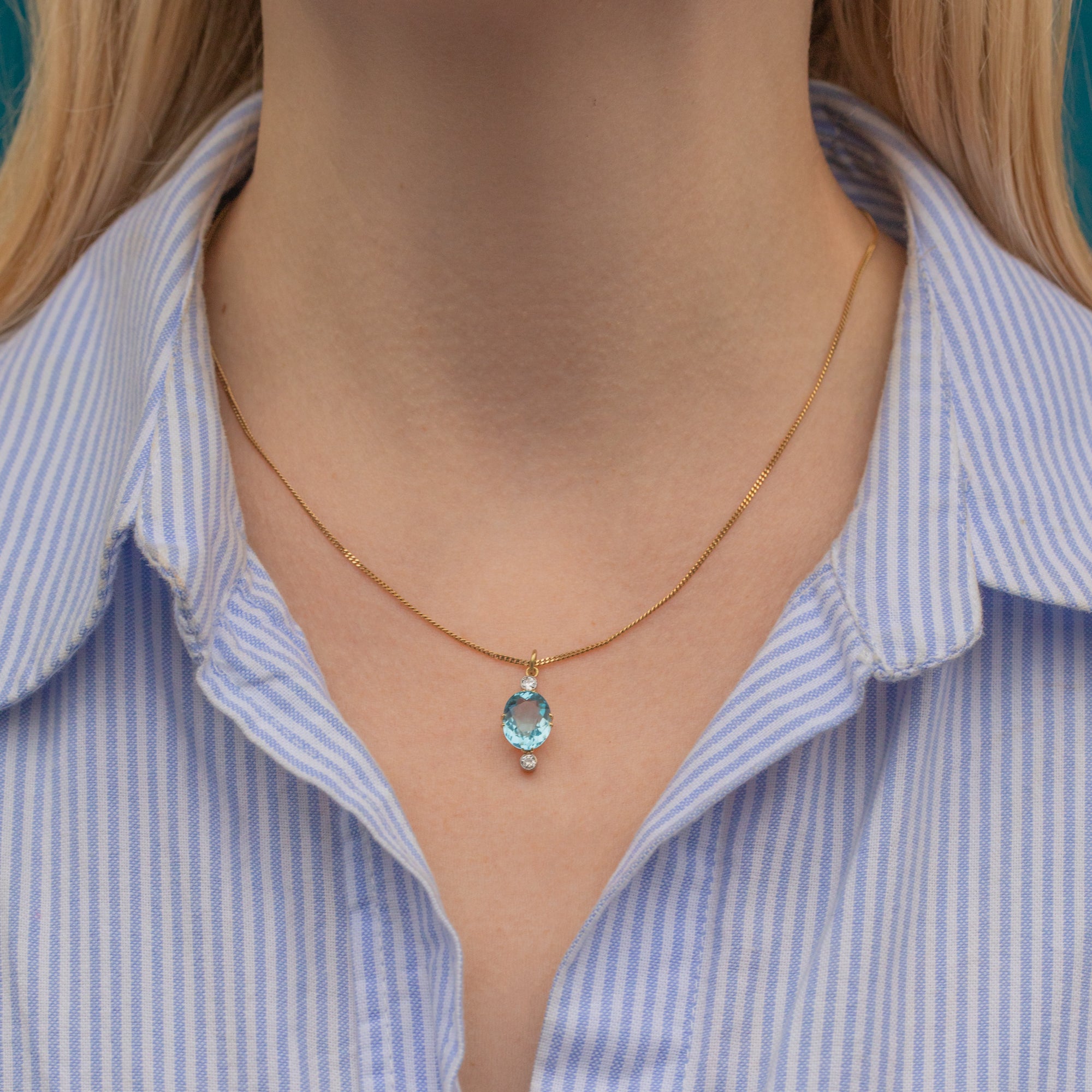 This antique 18ct Gold Aquamarine Diamond pendant has stolen our hearts! A quintessentially elegant and timeless Edwardian pendant, this piece boasts a 5.10ct glacial Aquamarine at the centre, accented by two scintillating Diamonds set in Platinum, akin to frozen droplets of ice.