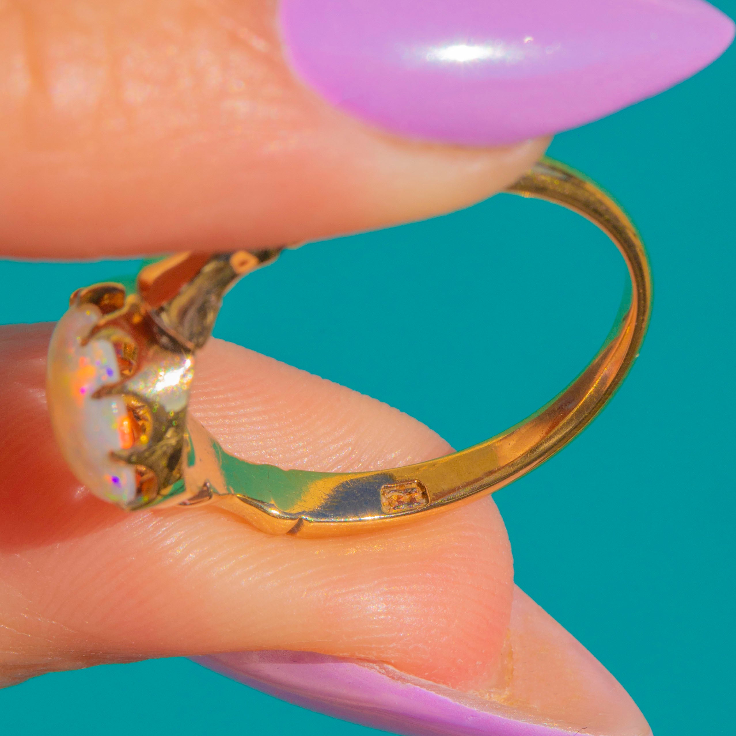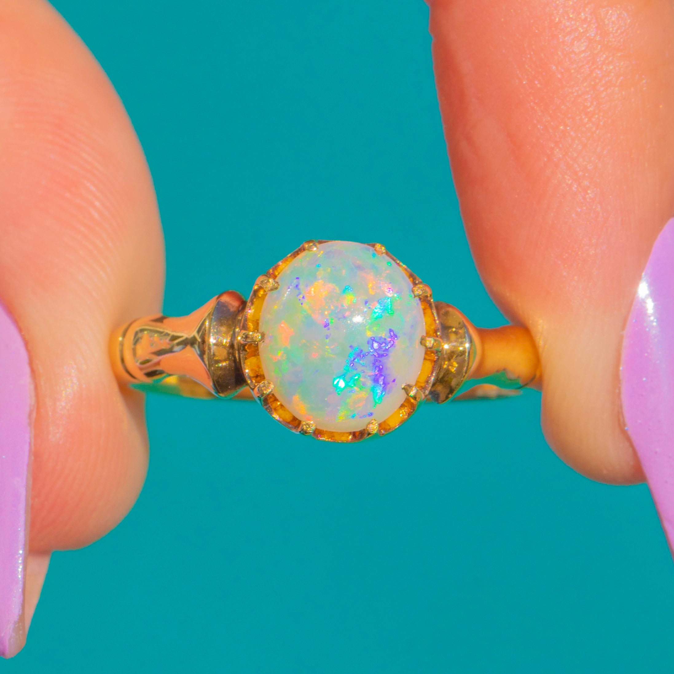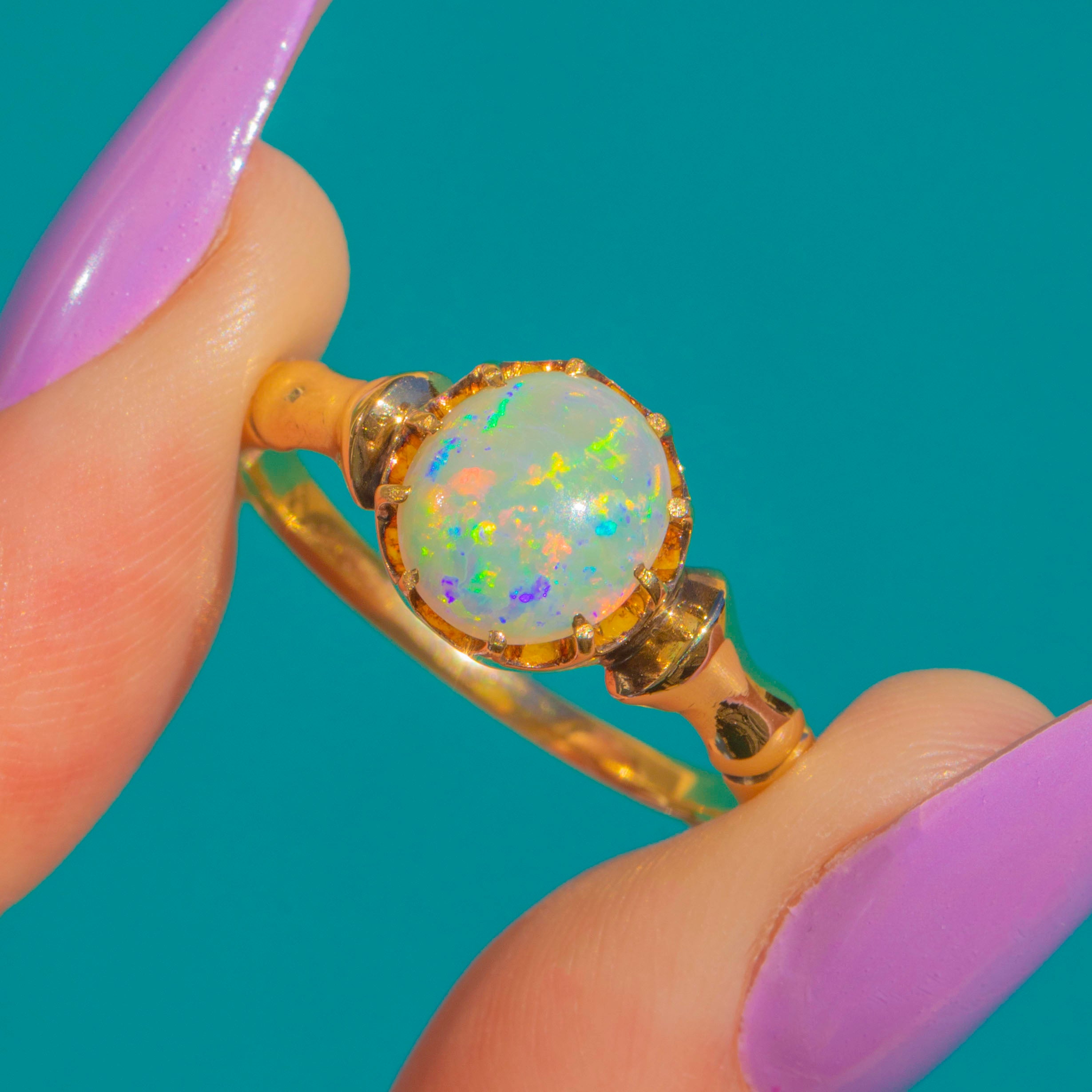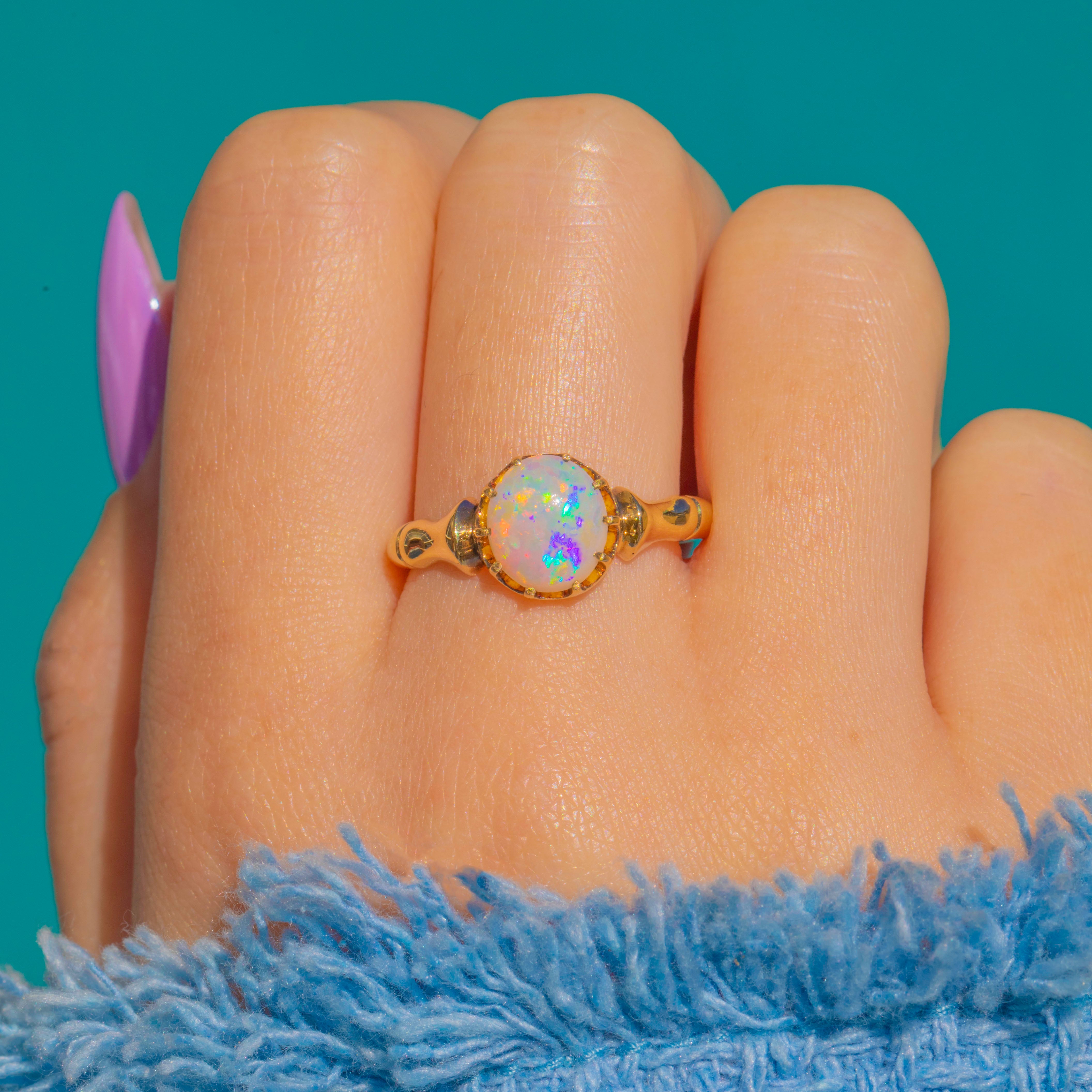 EXCELLENT: The Opal displays magnificent play of colour and sits securely within its crown setting, with no chips, abrasions, or visible wear. The 18ct Gold retains a bright, saturated polish throughout with no notable nicks or scuffs, and the shank remains true and well-shaped. A beautifully preserved antique, ready to be enjoyed for many years to come.