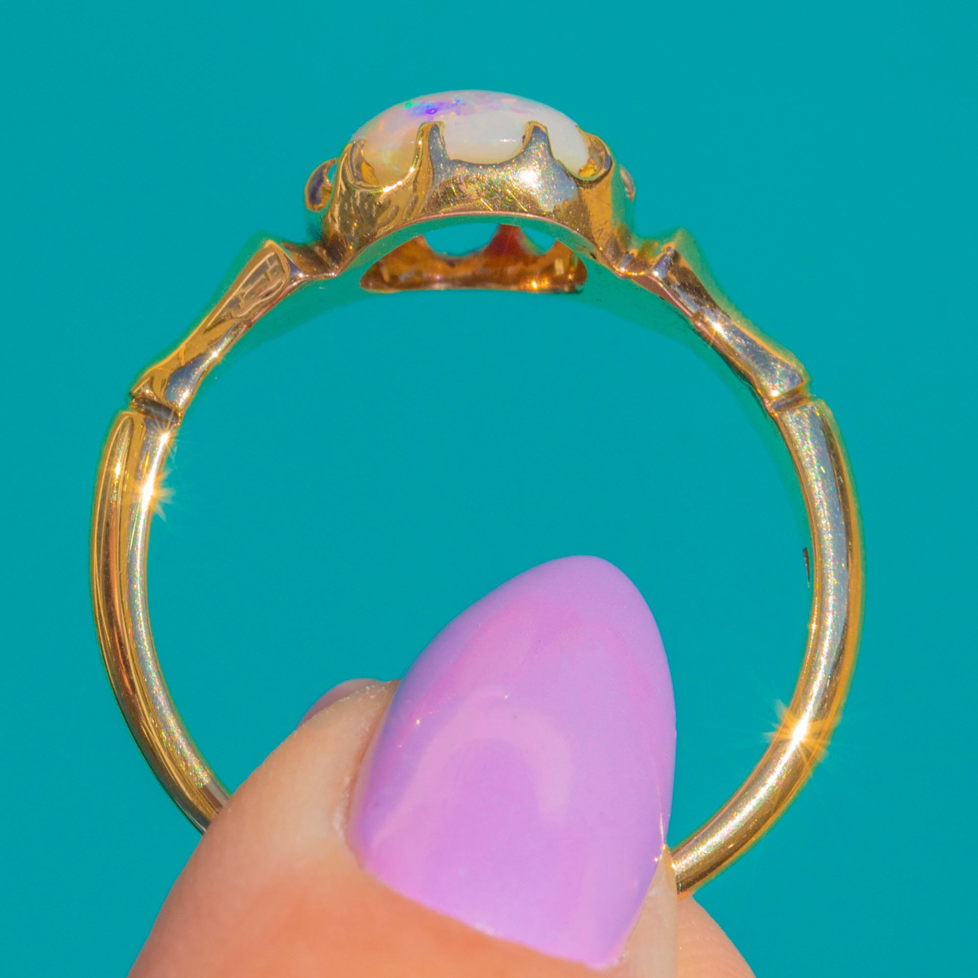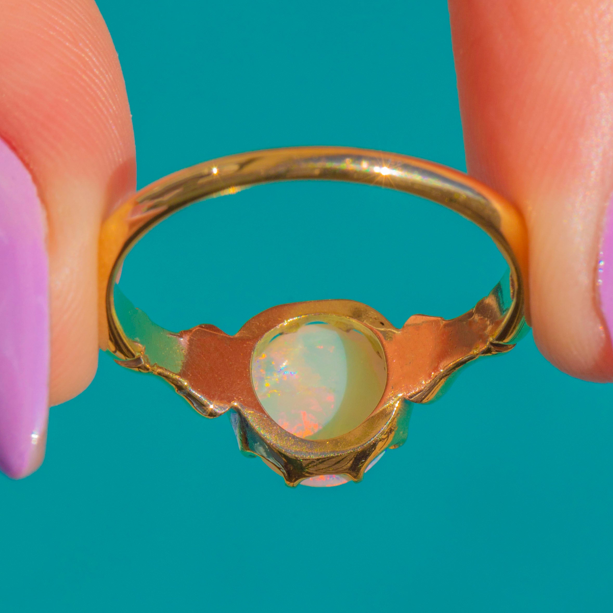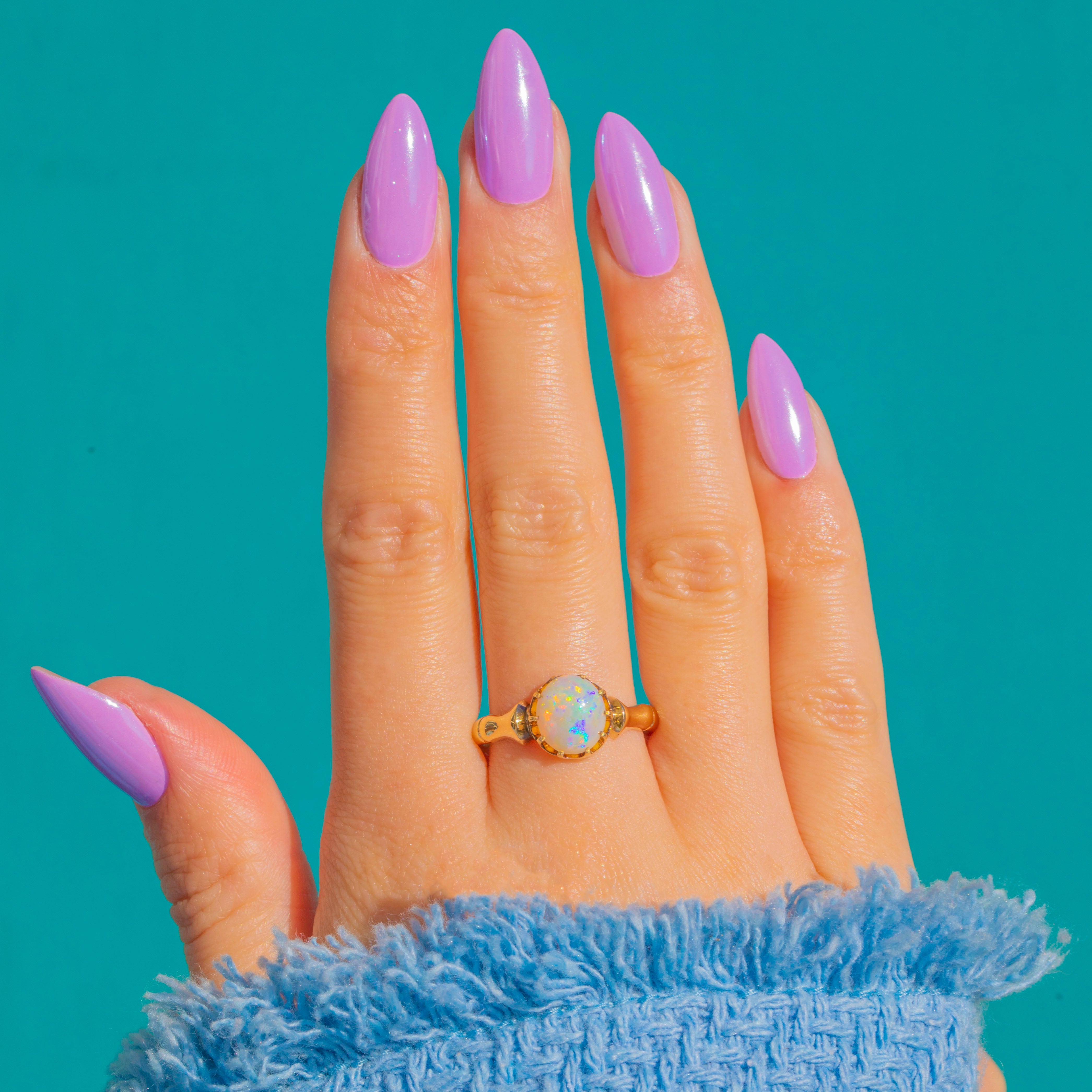 A luminous treasure, this antique 18ct Gold Opal ring captures the romance of Victorian design. The high-domed Opal cabochon shimmers with a kaleidoscope of colour—vivid flashes of blue, green, orange, red, pink and purple dance across its milky-white body with every movement.