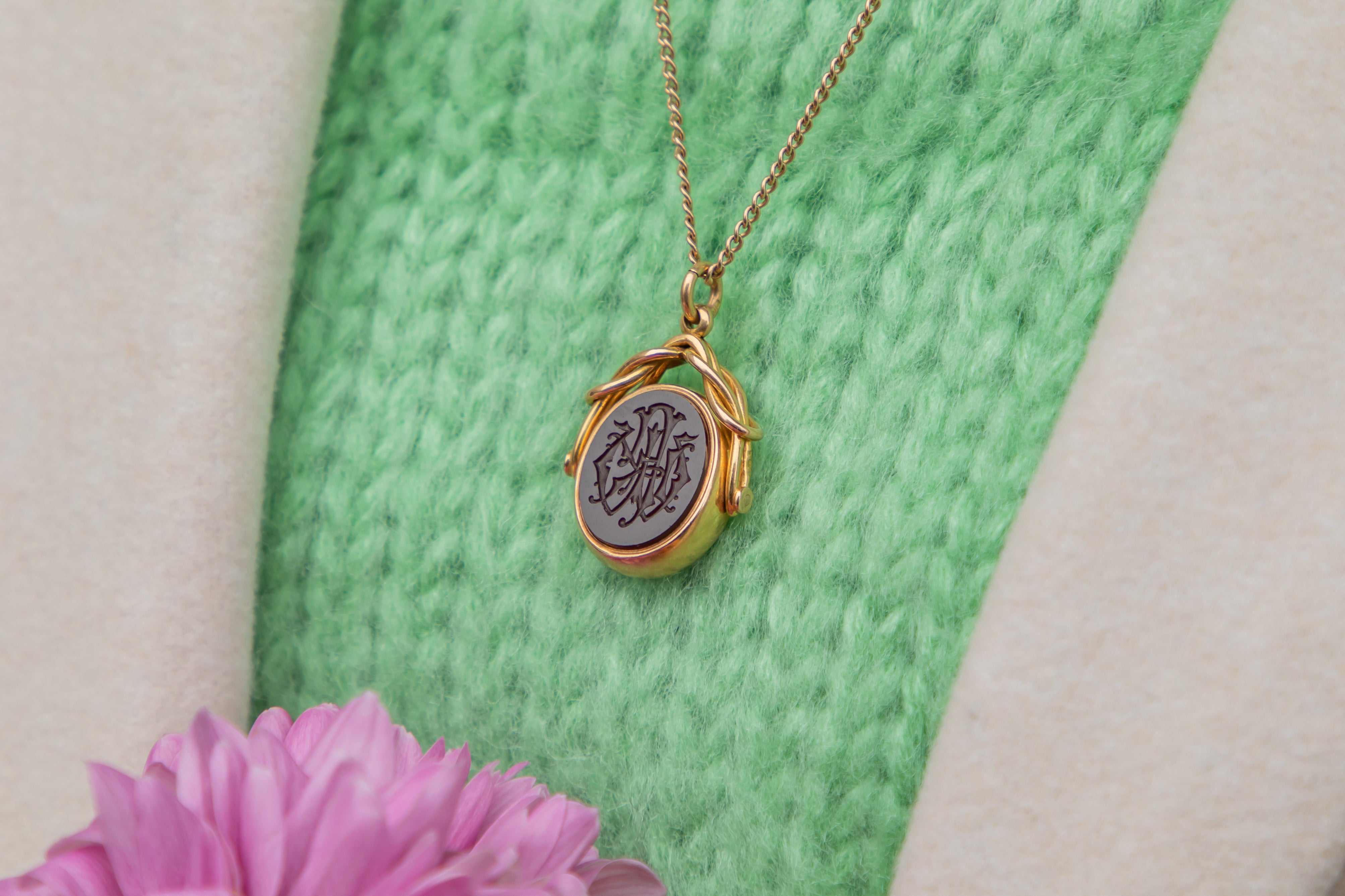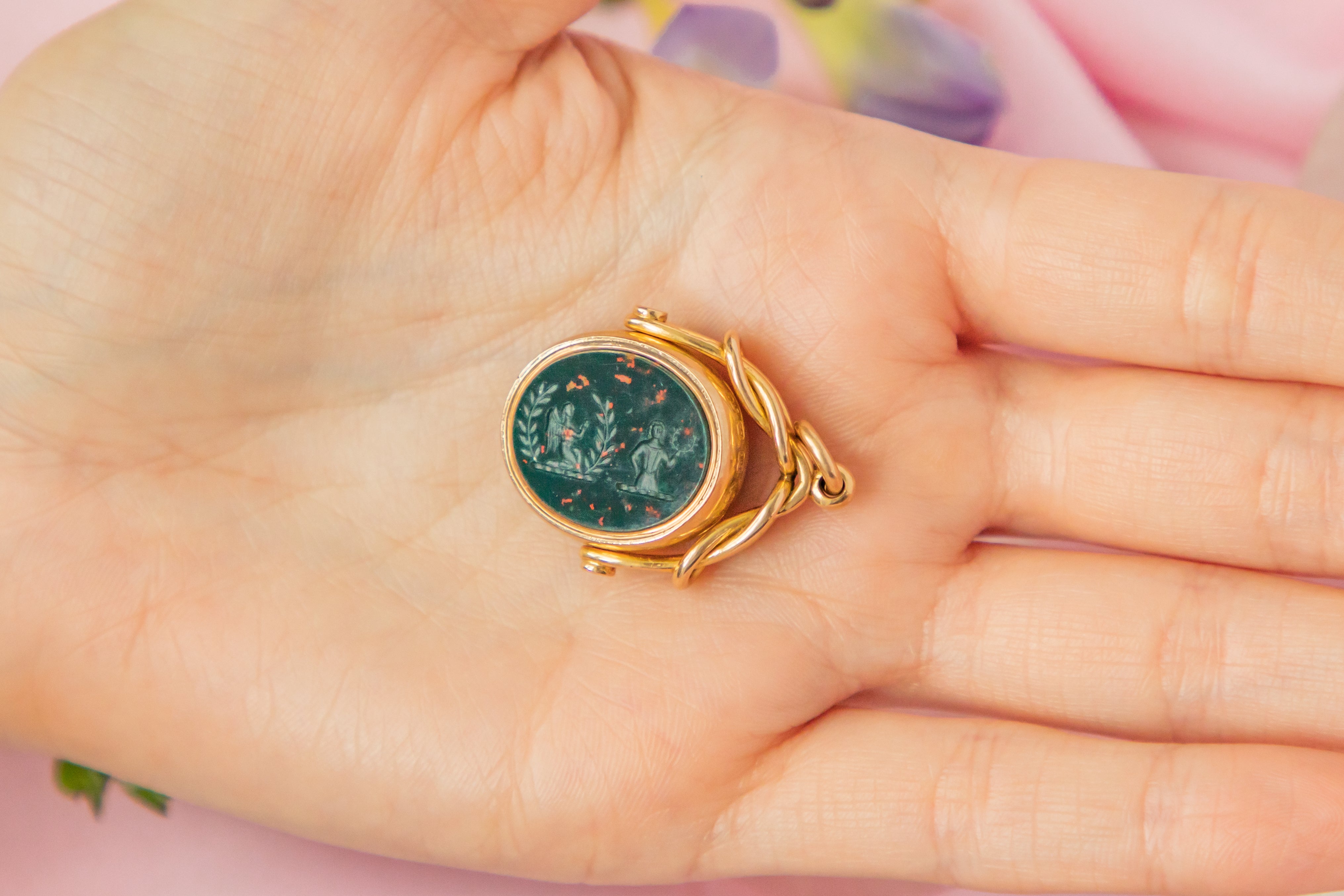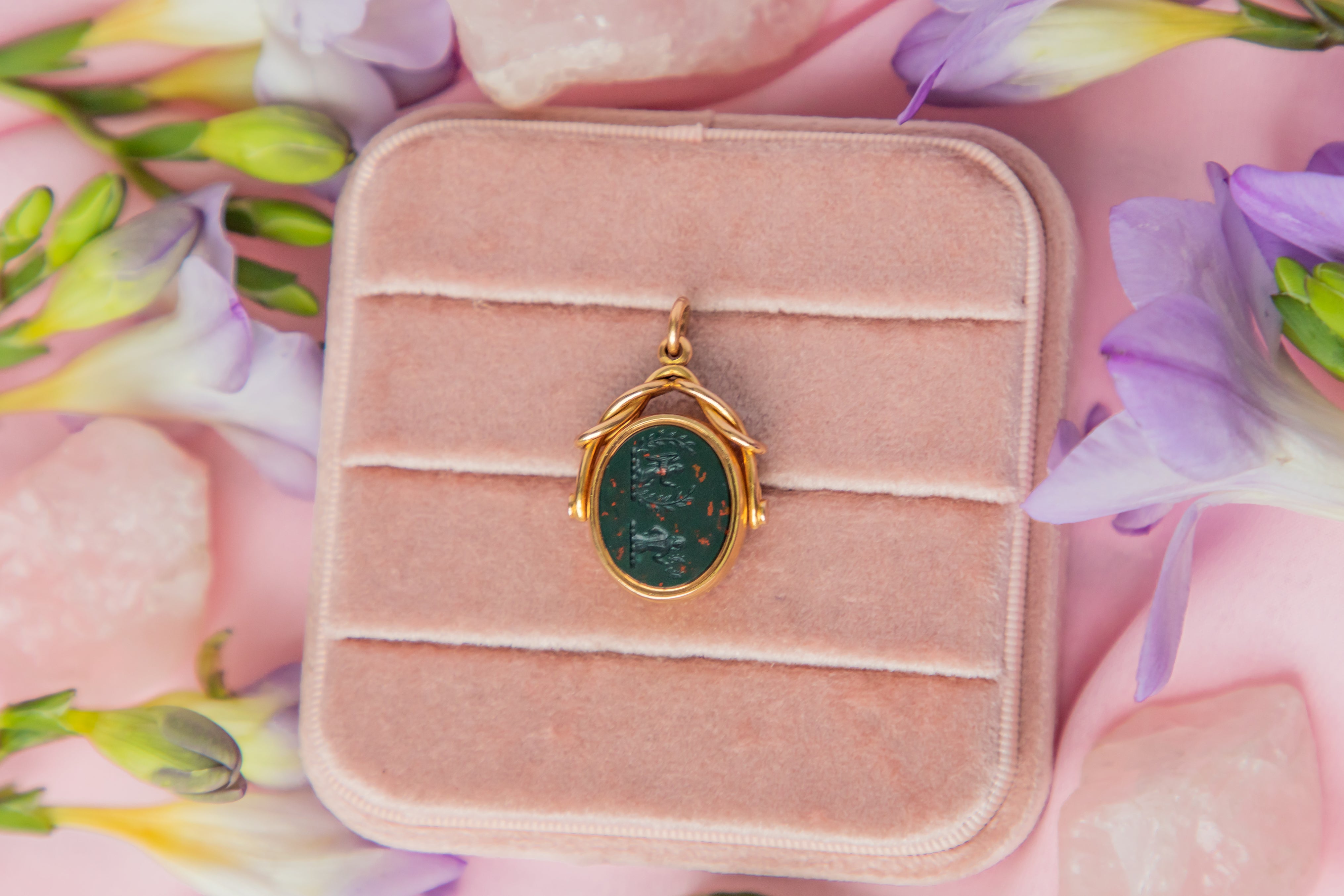 VERY GOOD. Bursting with character, this antique 18ct Gold Bloodstone Carnelian intaglio fob pendant is in lovely condition throughout. Both of her stones are securely set and their intaglios are intricate, with all detailing still visible to see. Her 18ct Gold has retained good form, with only minor surface wear across her underside, slightly obscuring the hallmarks. Her wire bale is akin to a lover's knot and very sturdy. She swivels with ease and will make for a lovely pendant suspended from a chain. An absolute dream to add to your antique jewellery collection!