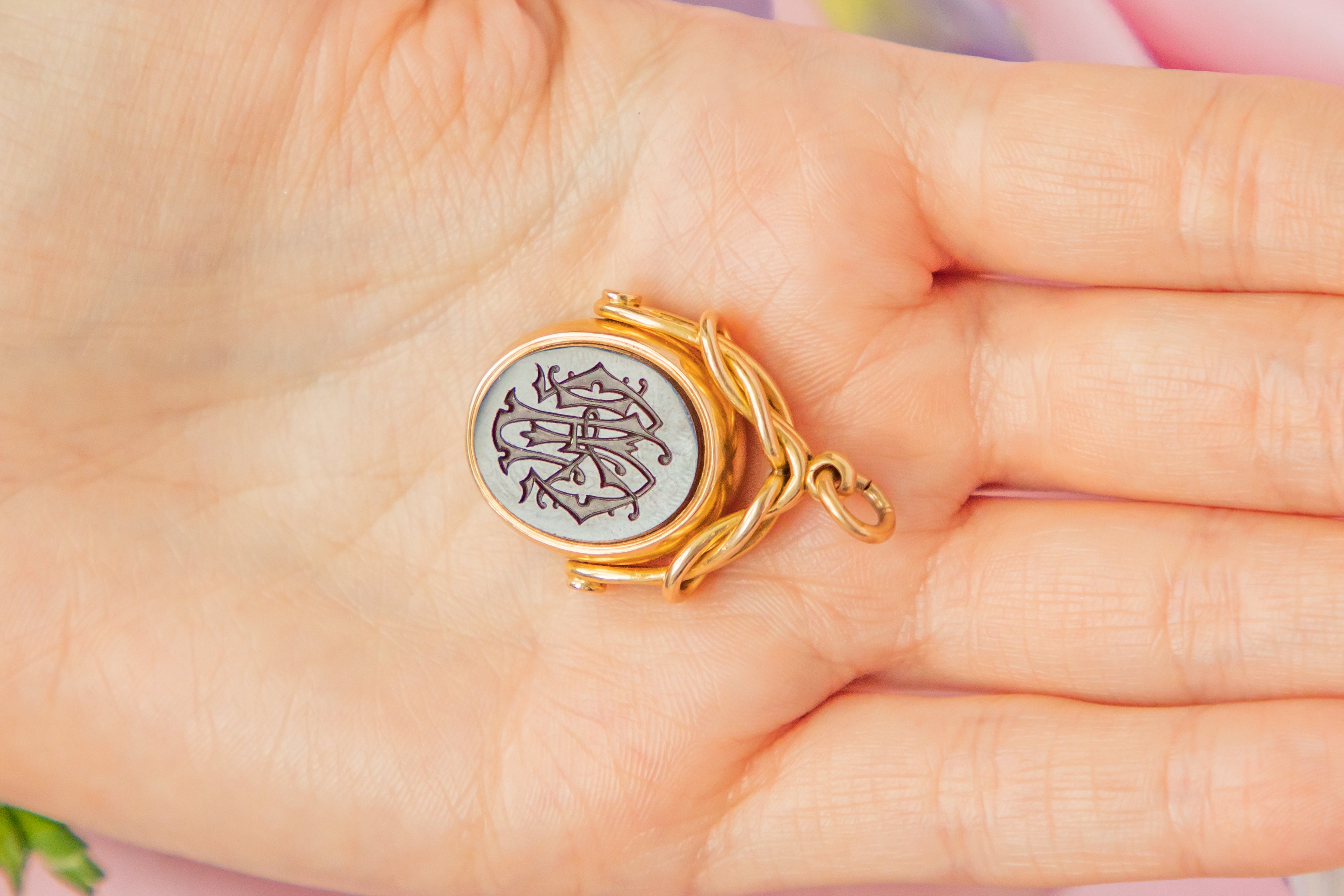 We are in awe of this antique 18ct Gold Bloodstone Carnelian intaglio fob pendant! A unique intaglio has been skillfully engraved into each gemstone, making this Victorian fob one-of-a-kind!