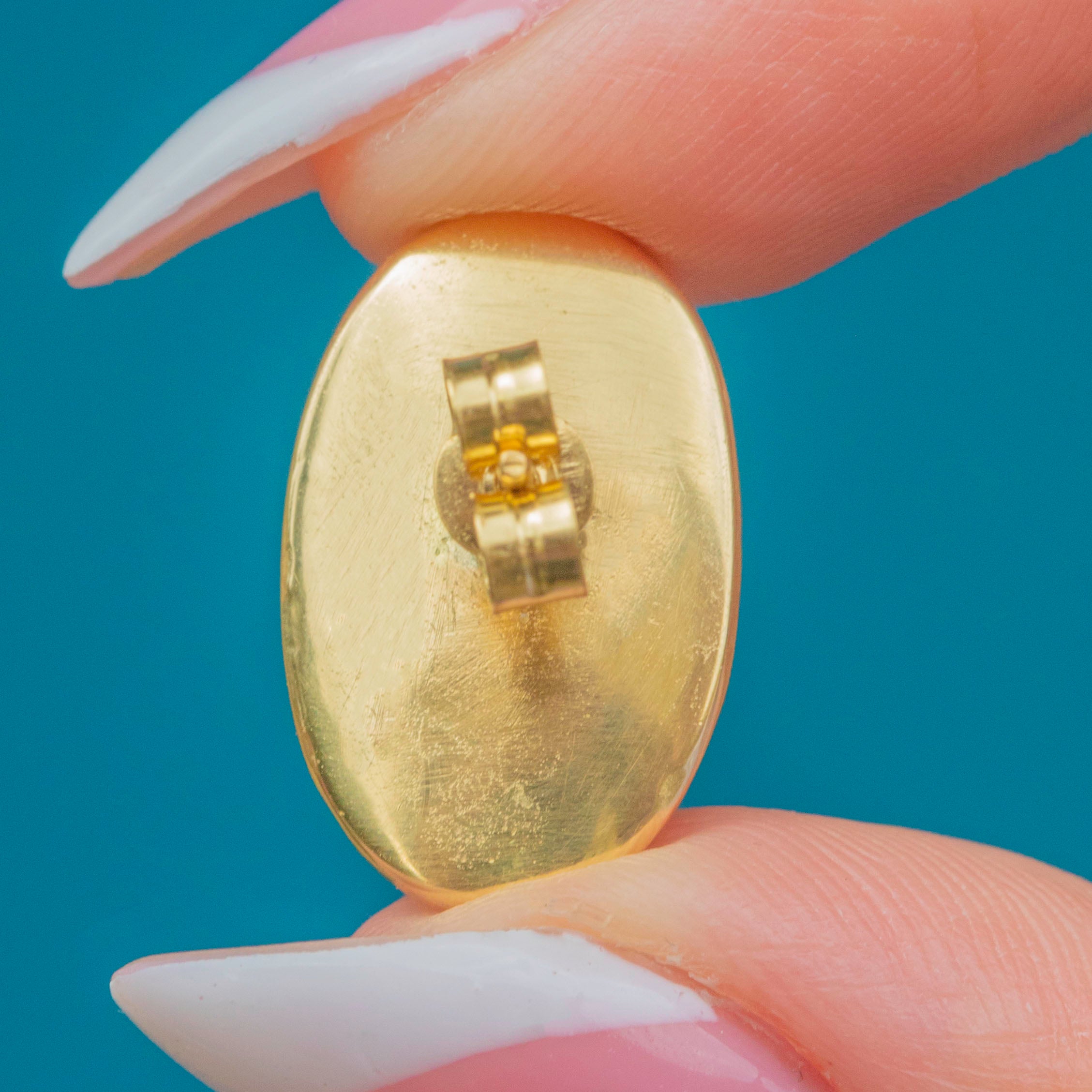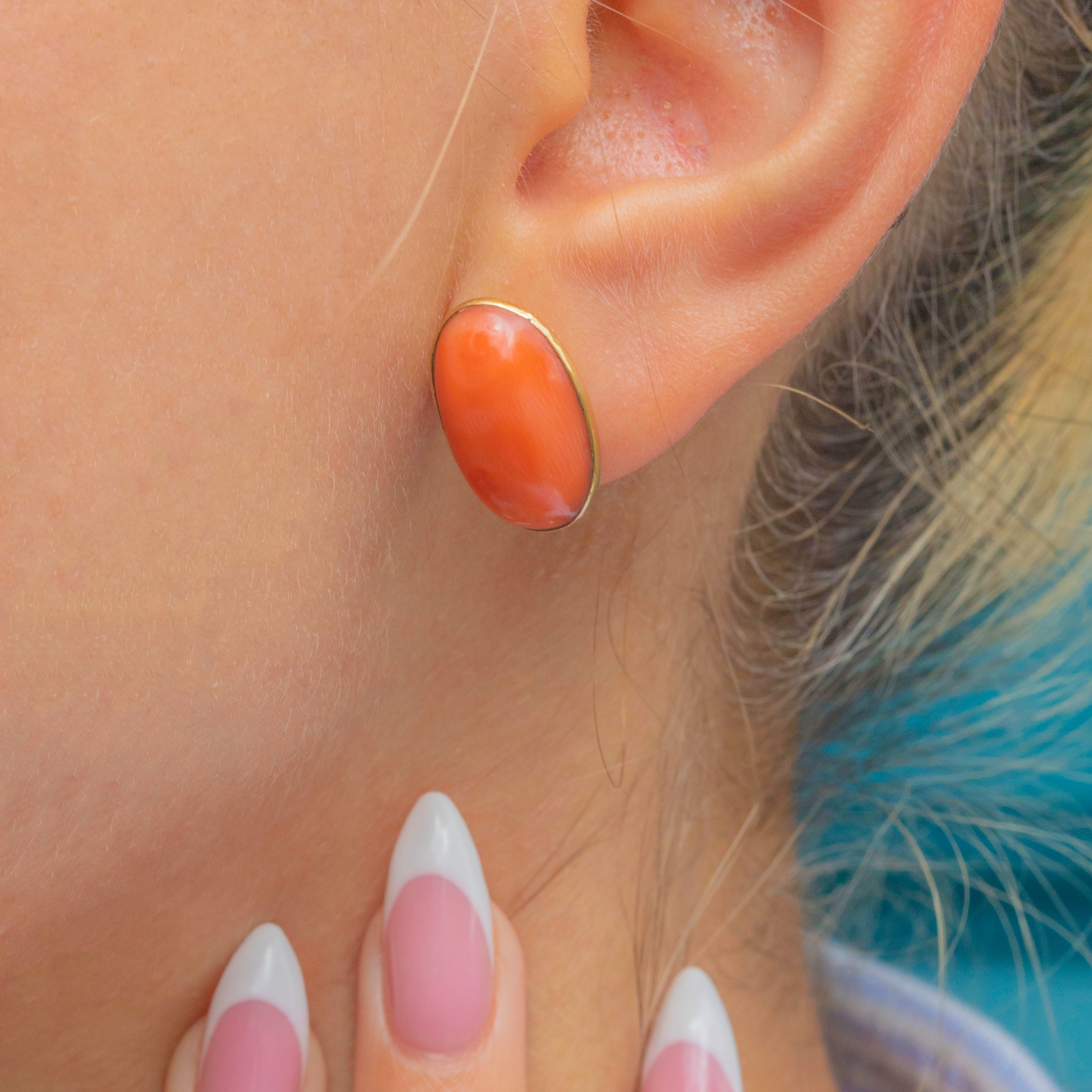 EXCELLENT: The rich orange Coral cabochons are smooth, polished, and free from chips or cracks. The bezel settings securely hold the stones and exhibit a warm, well-preserved yellow gold tone with minimal surface wear. The earrings maintain their classic shape and show no signs of repair or damage.