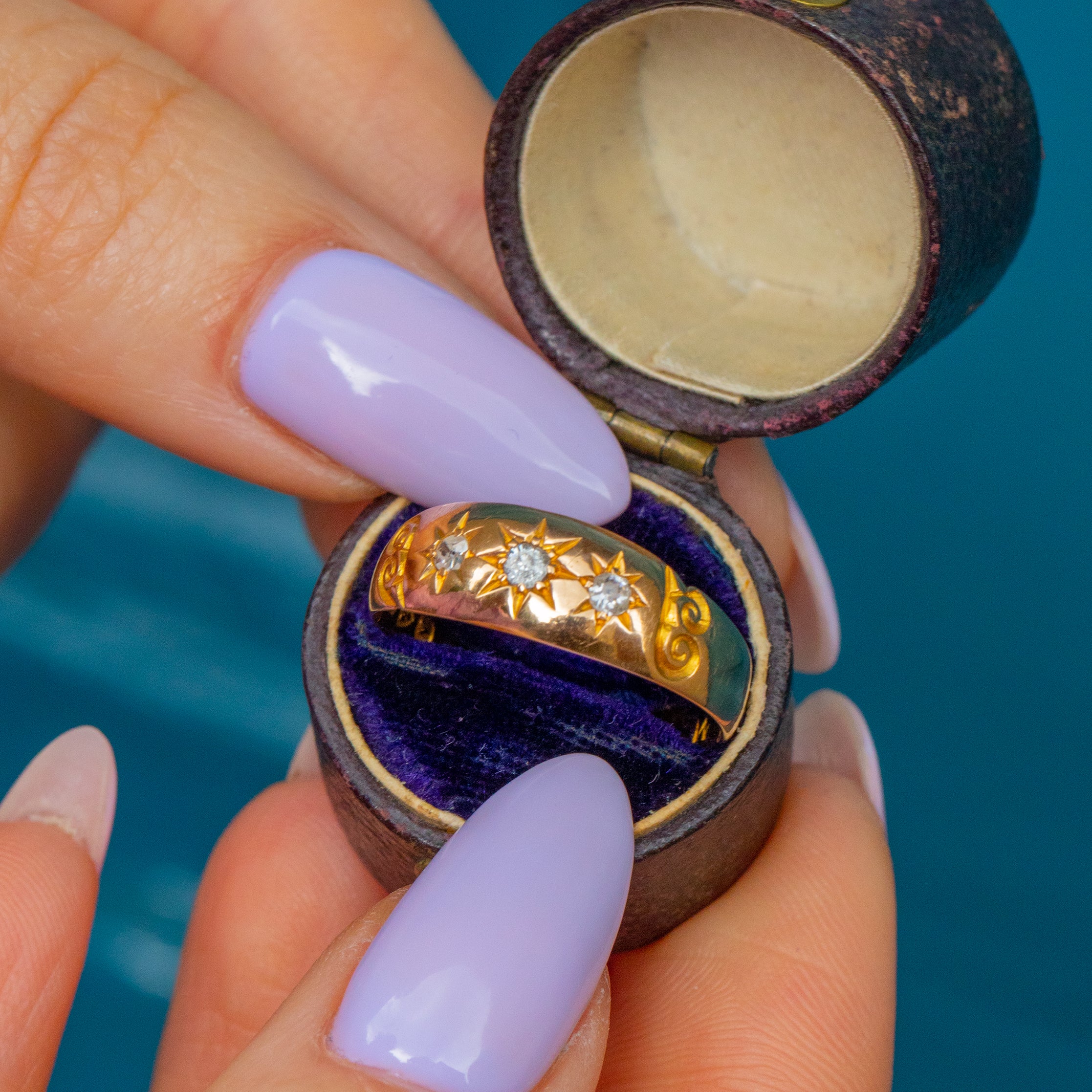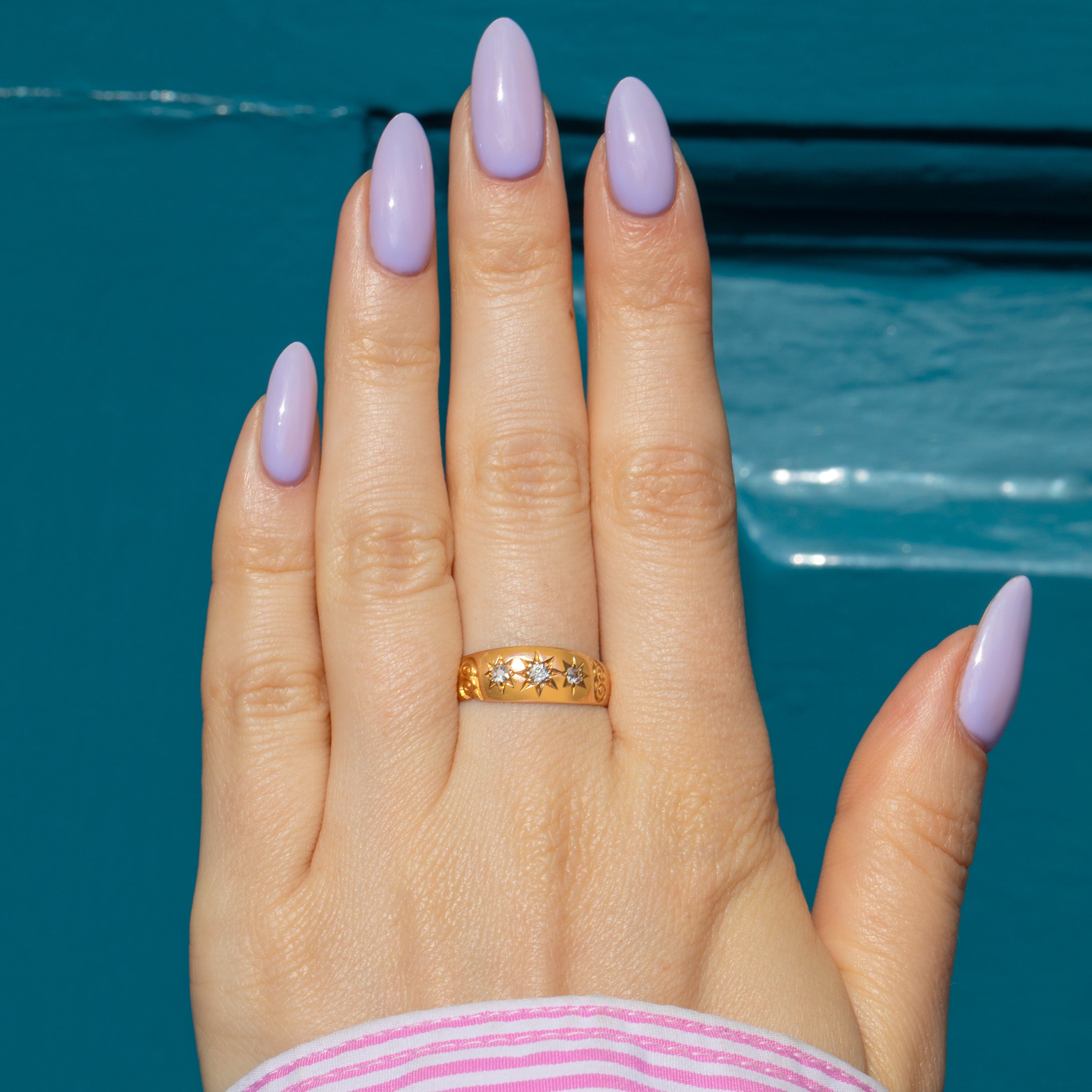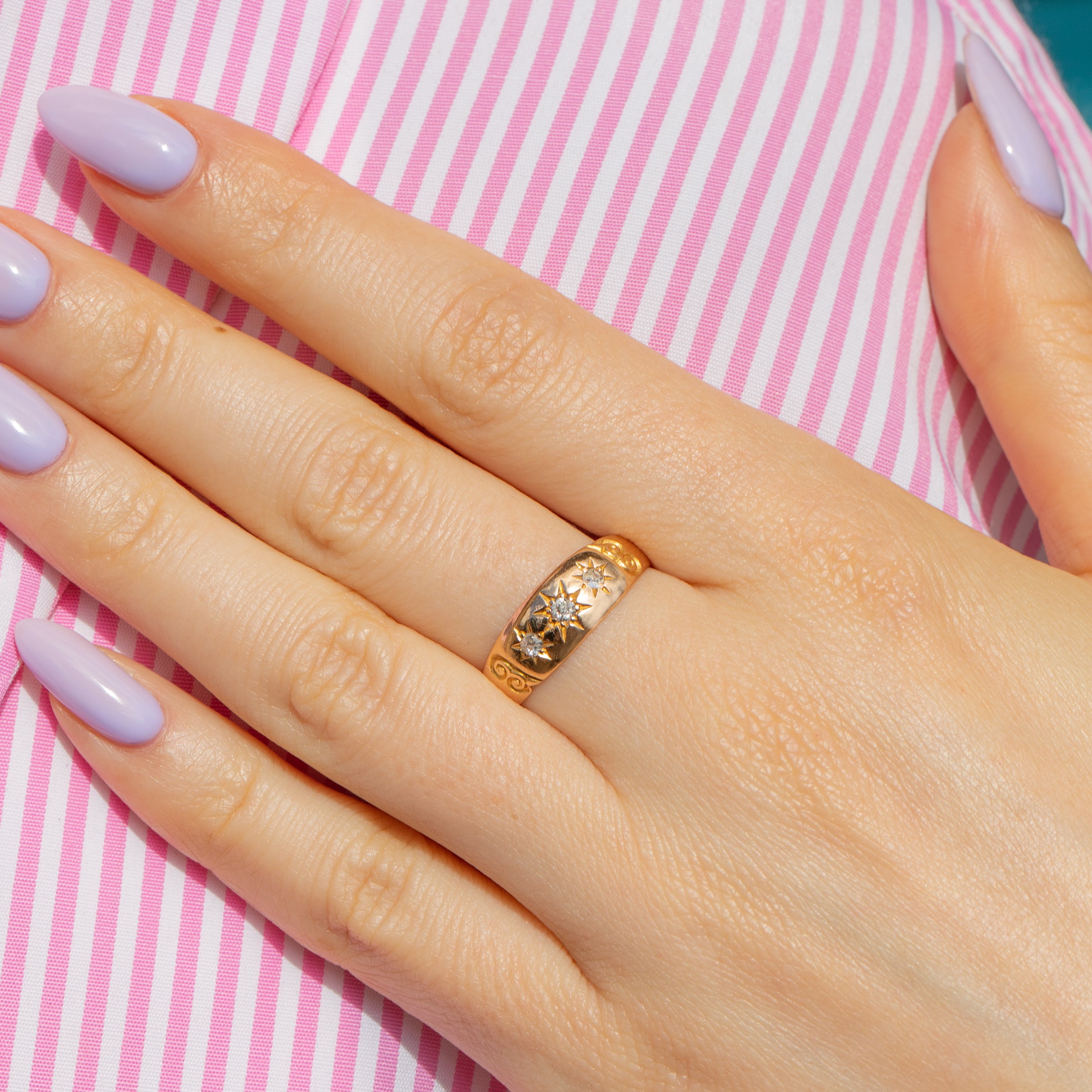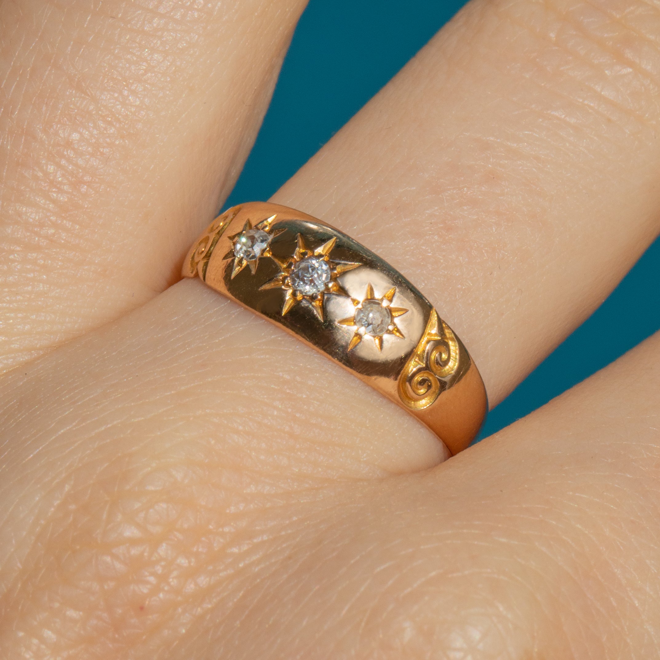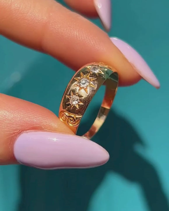 This post-Edwardian 18ct Gold gypsy ring features three old-mine cut Diamonds in star settings, giving it a celestial ambiance that will add a touch of elegance to any ring stack!