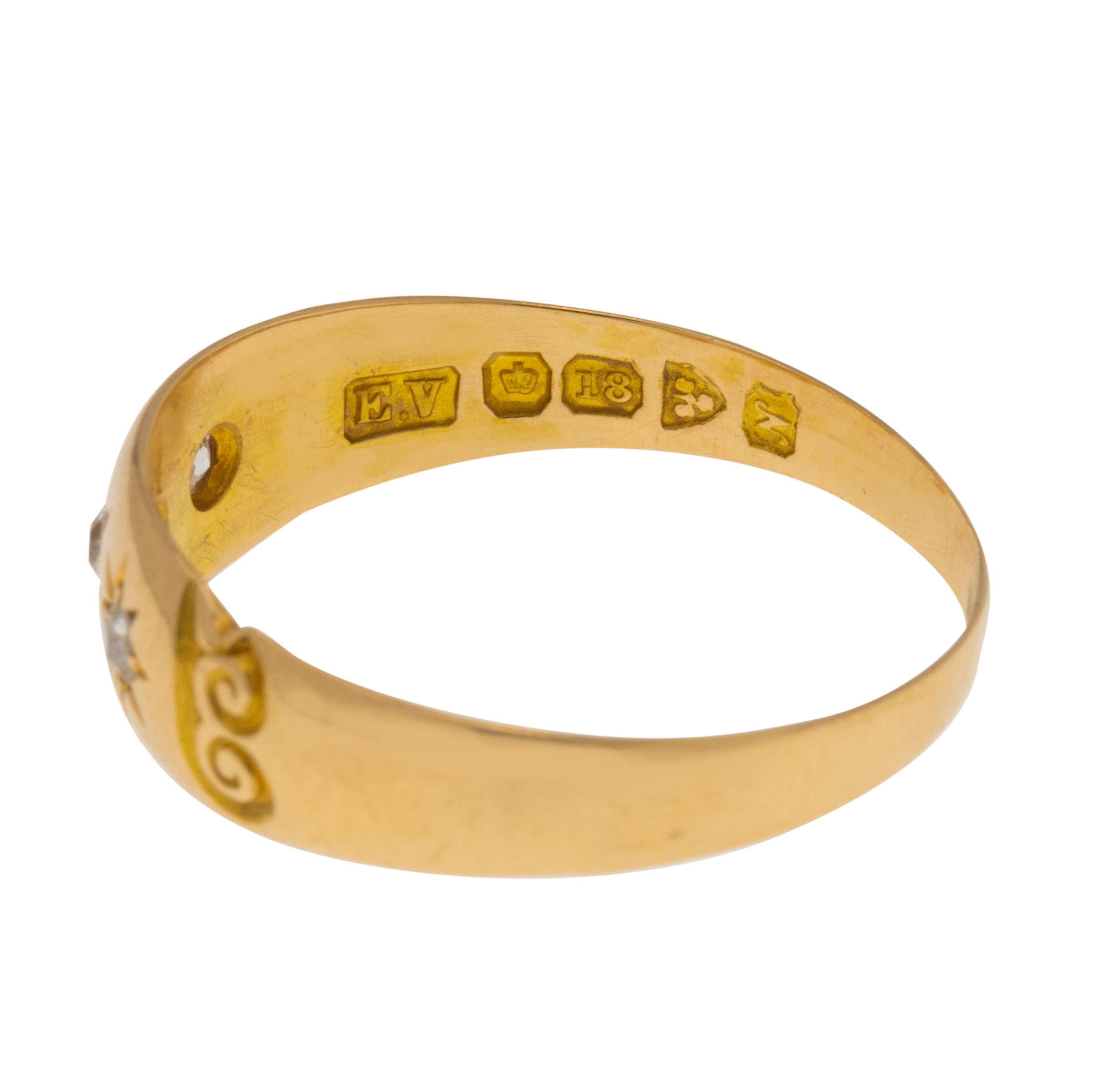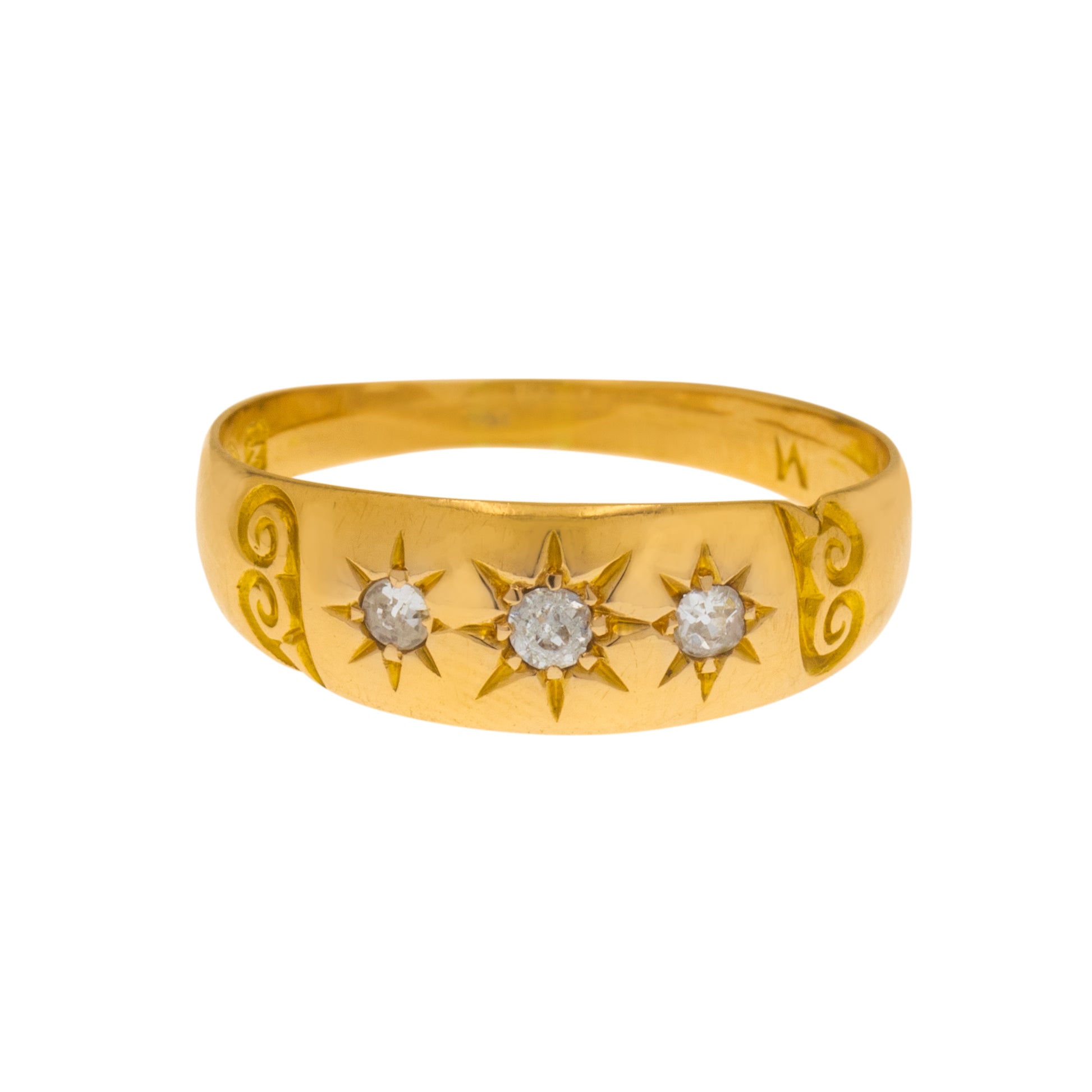EXCELLENT. This antique 18ct Gold Diamond gypsy ring is offered in excellent condition. A must-have, this piece has three old mine-cut Diamonds that are all securely held in star settings and free from any signs of wear. The 18ct Gold is brightly saturated and the band has retained its form well with a full set of hallmarks on the inside making her a fine collector's piece!