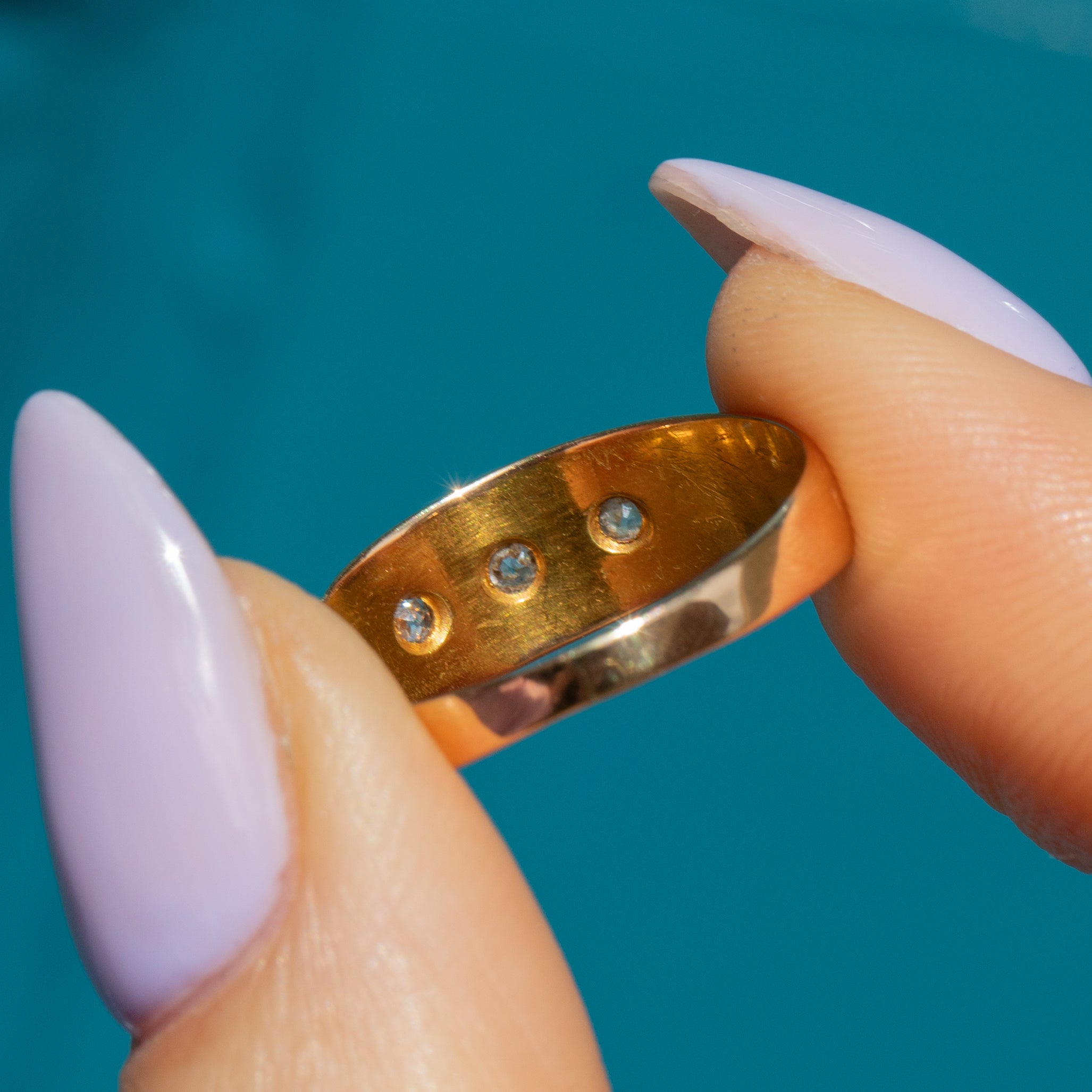 This stunning antique 18ct Gold Diamond gypsy ring is the perfect piece to enrich your collection, sure to catch your eye with her chunky Gold band and subtly twinkling Diamonds!