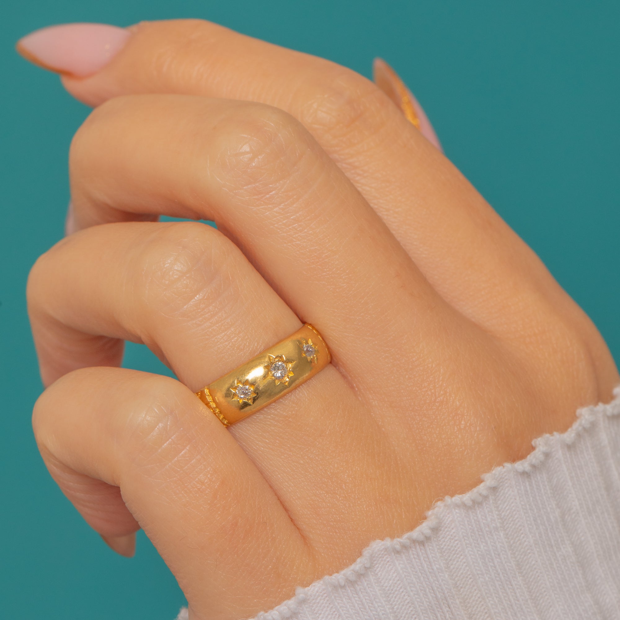 This beautiful Victorian ring is crafted in rich 18ct Gold and set with three twinkling antique Old Mine Cut Diamonds in star settings.