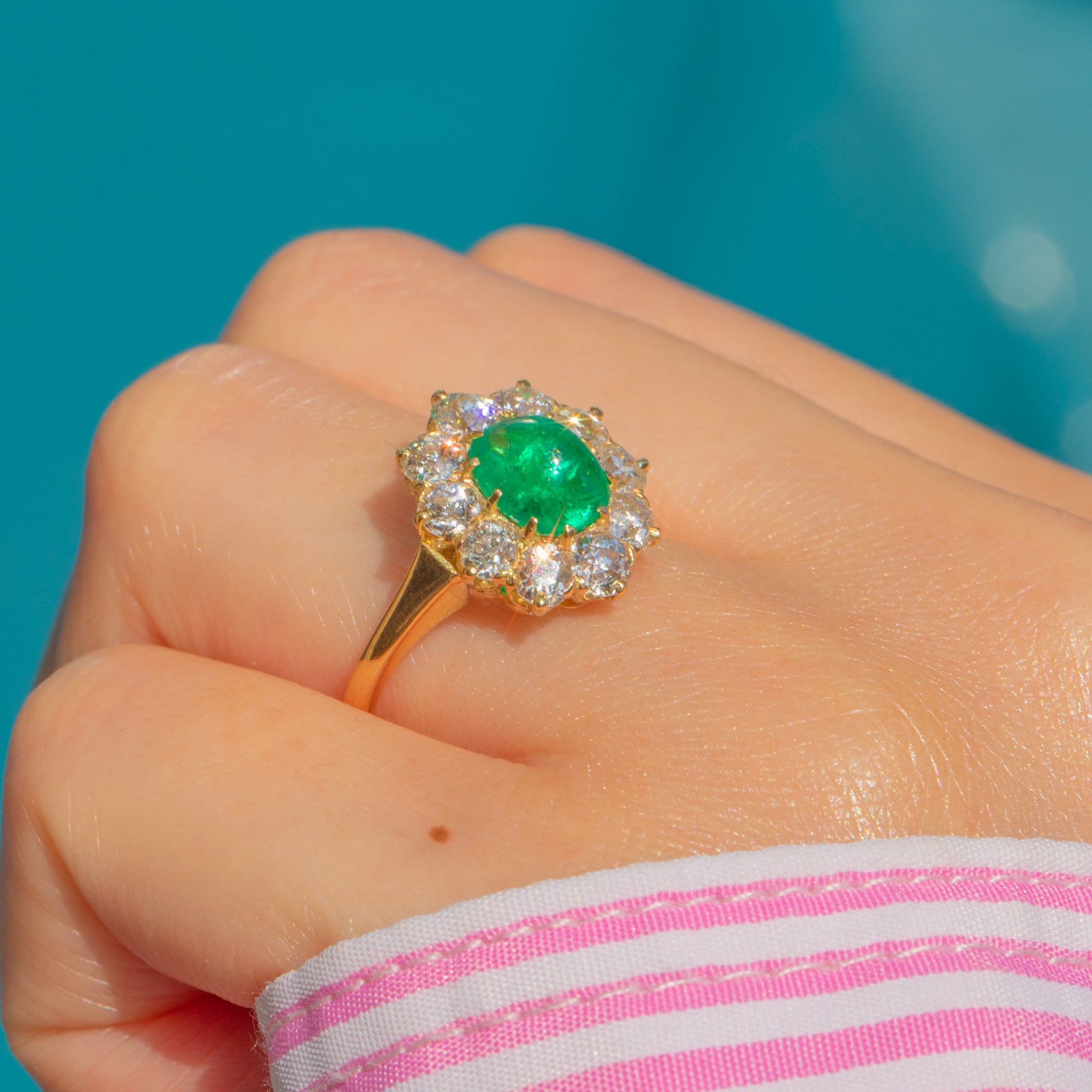 Each gemstone is secured by buttery 18ct Gold claws and rests on a glossy band, with the vibrant gemstones married harmoniously by the warmth of the Gold. A gorgeous option for an engagement ring, this elegant Victorian Emerald and Diamond cluster ring is a must-have!