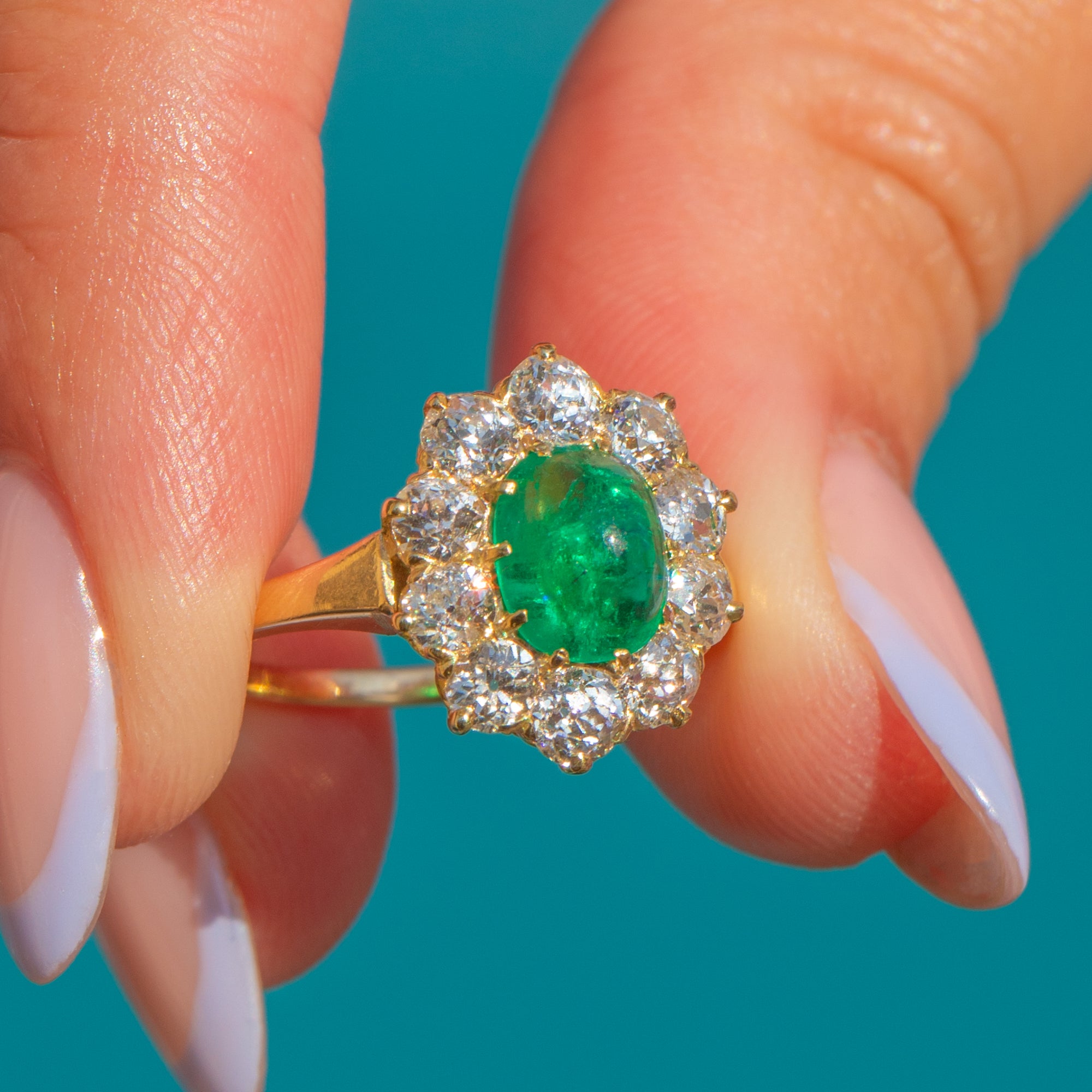 An exemplar of Victorian craftsmanship, this ring is centred by a plump Emerald cabochon, weighing 0.90ct and radiant a saturated, vibrant green hue. She is encircled by a halo of large, twinkling Old-mine cut Diamonds, ensuring that this antique ring dazzles from every angle.