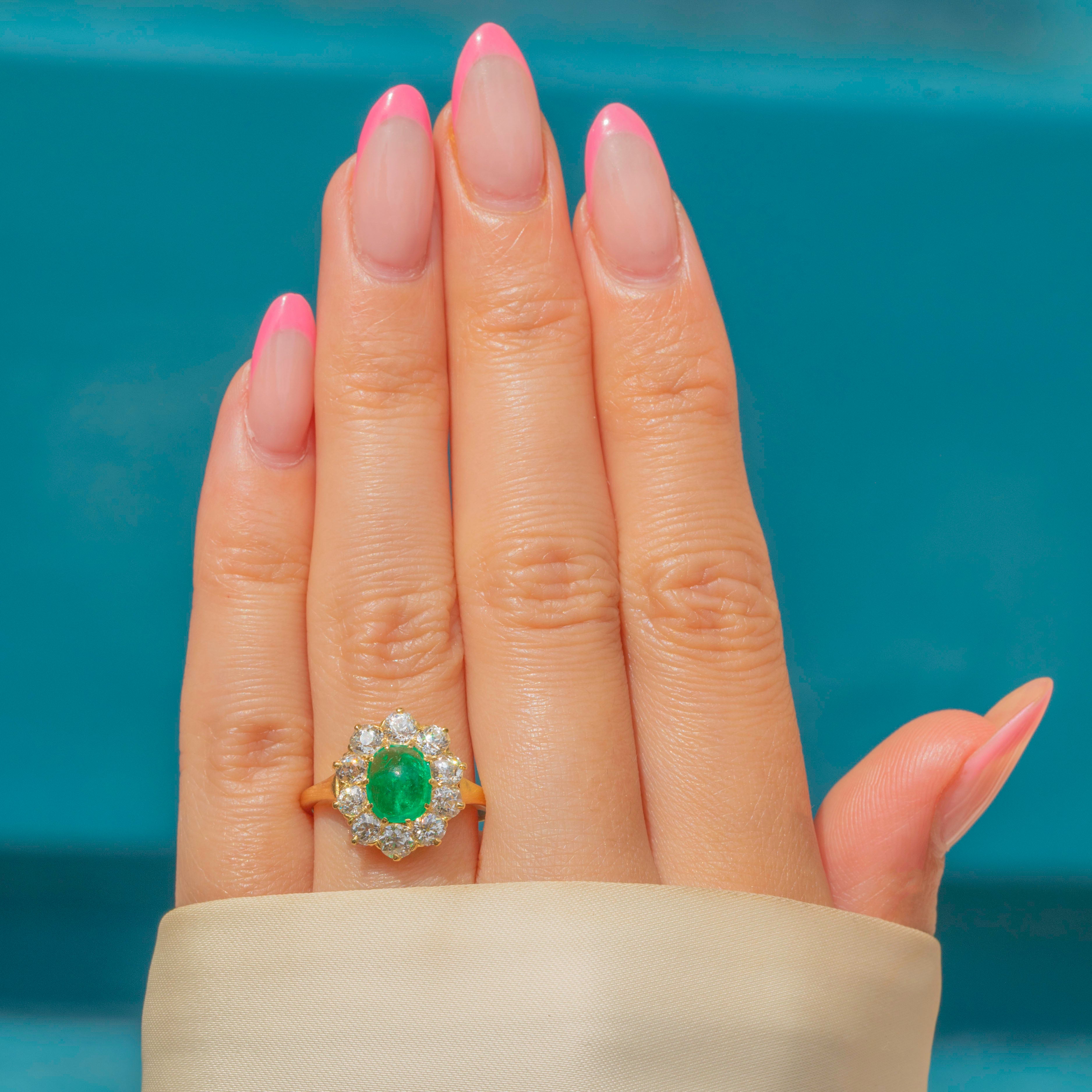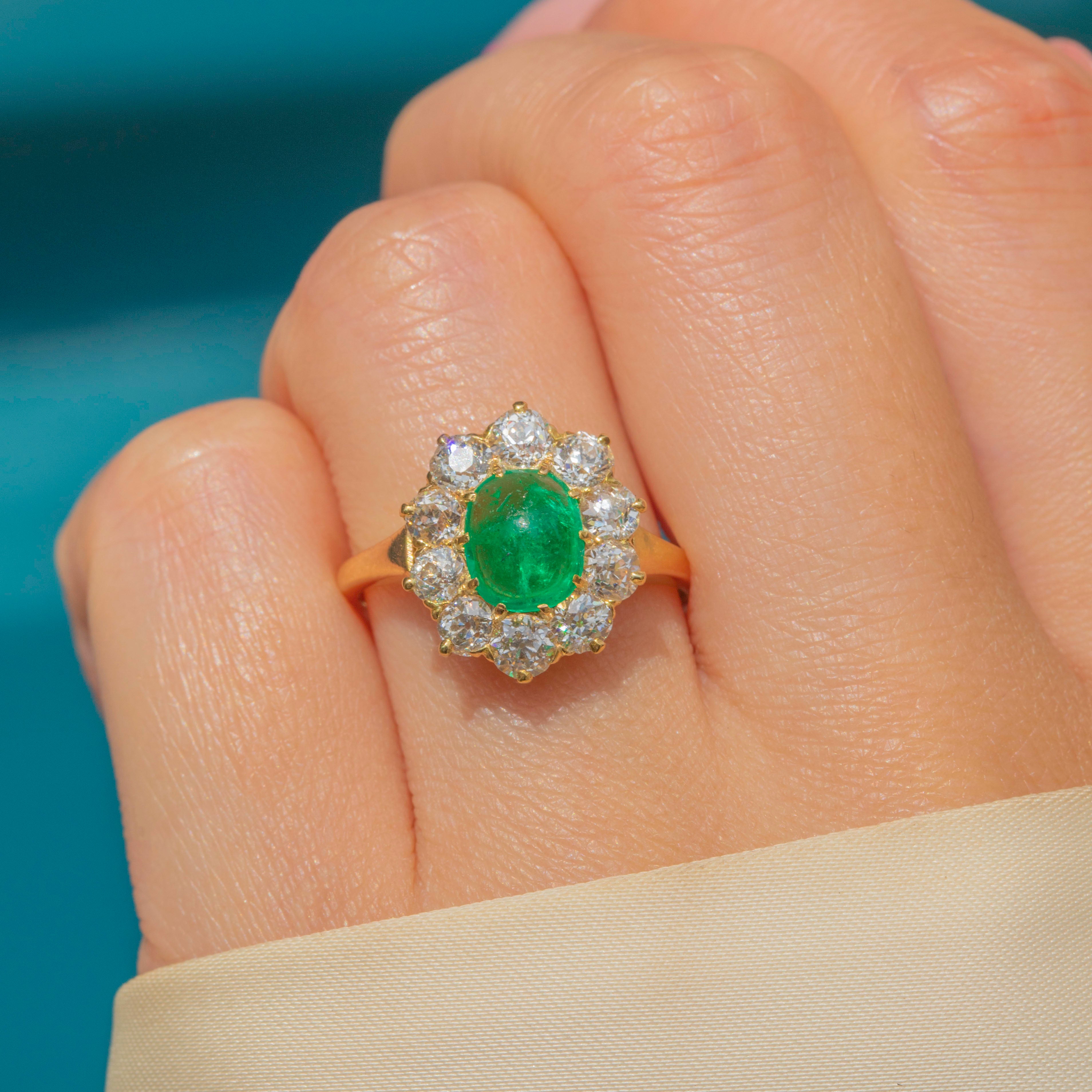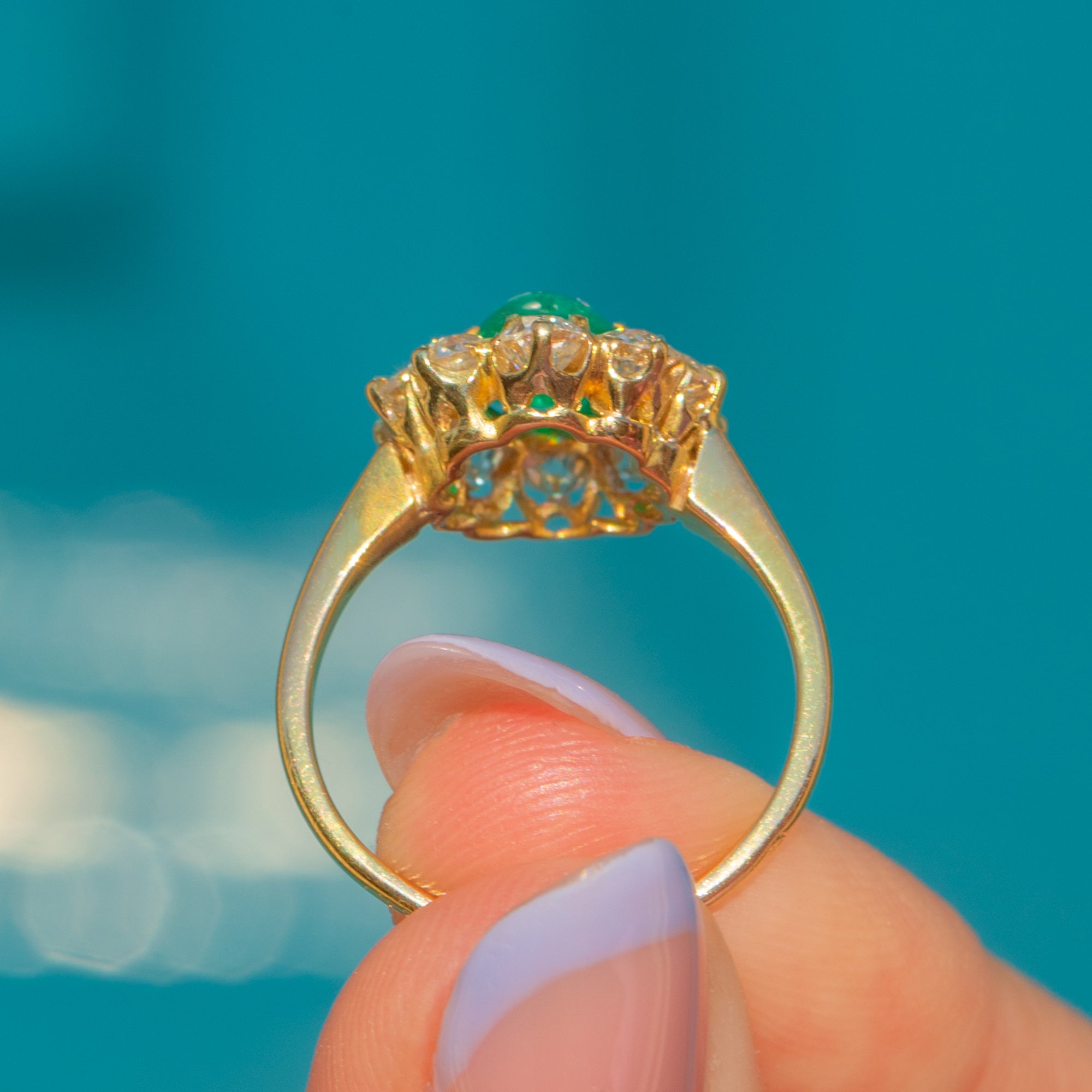 Antique 18ct Gold Emerald Cabochon Diamond Cluster Ring 0.90ct Emerald