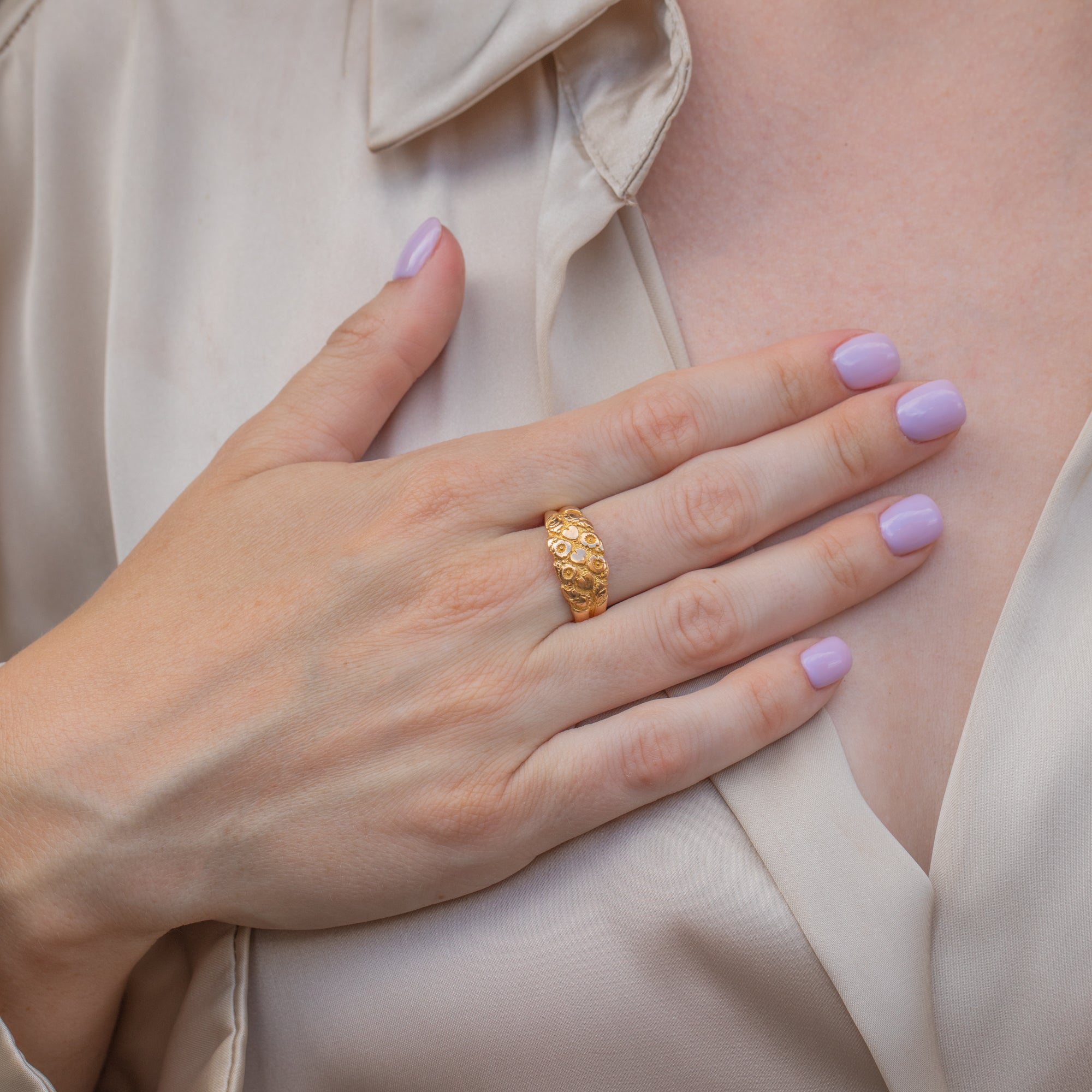 A chunky size, this Edwardian ring will bring a presence to your ring stack, with a considered low profile making her an easy everyday wear. With a glossy inner band, this engraved ring glides onto your hand a dream!
