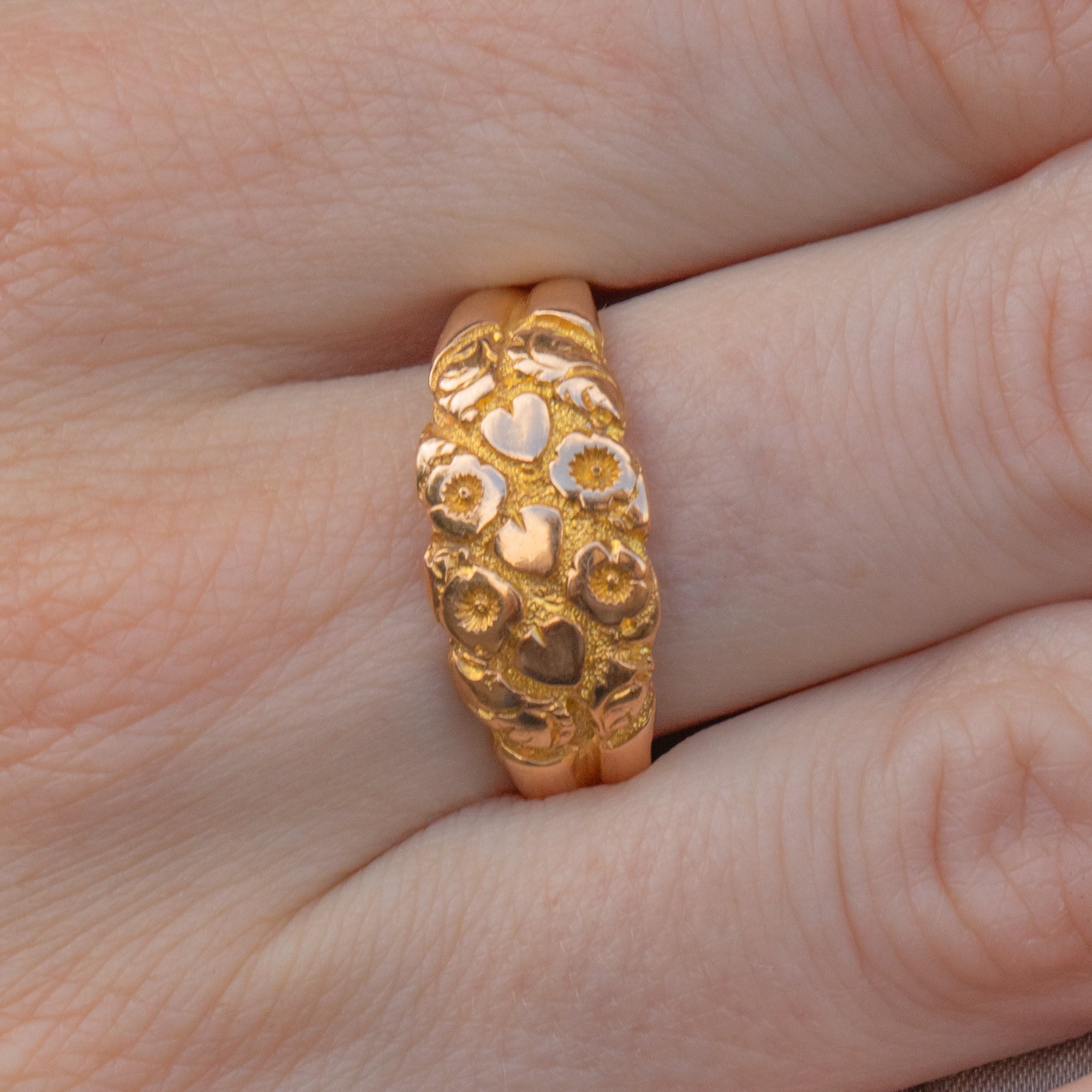 VERY GOOD-EXCELLENT. This antique 18ct Gold engraved flower ring is in very good to excellent condition! The floral detailing is crisp and catches beneath the light beautifully. The ring band is well formed, with the Gold glossy and effortless to wear. There is a small resize mark to the back of the band but nothing untoward. This Gold ring is ready to be the finishing touch to any attire!