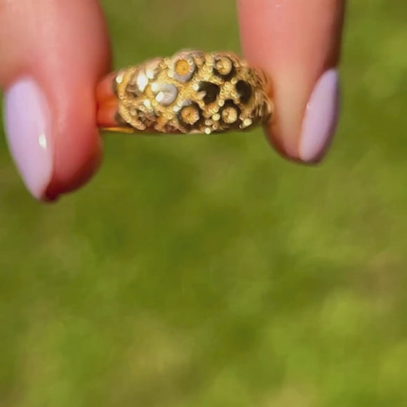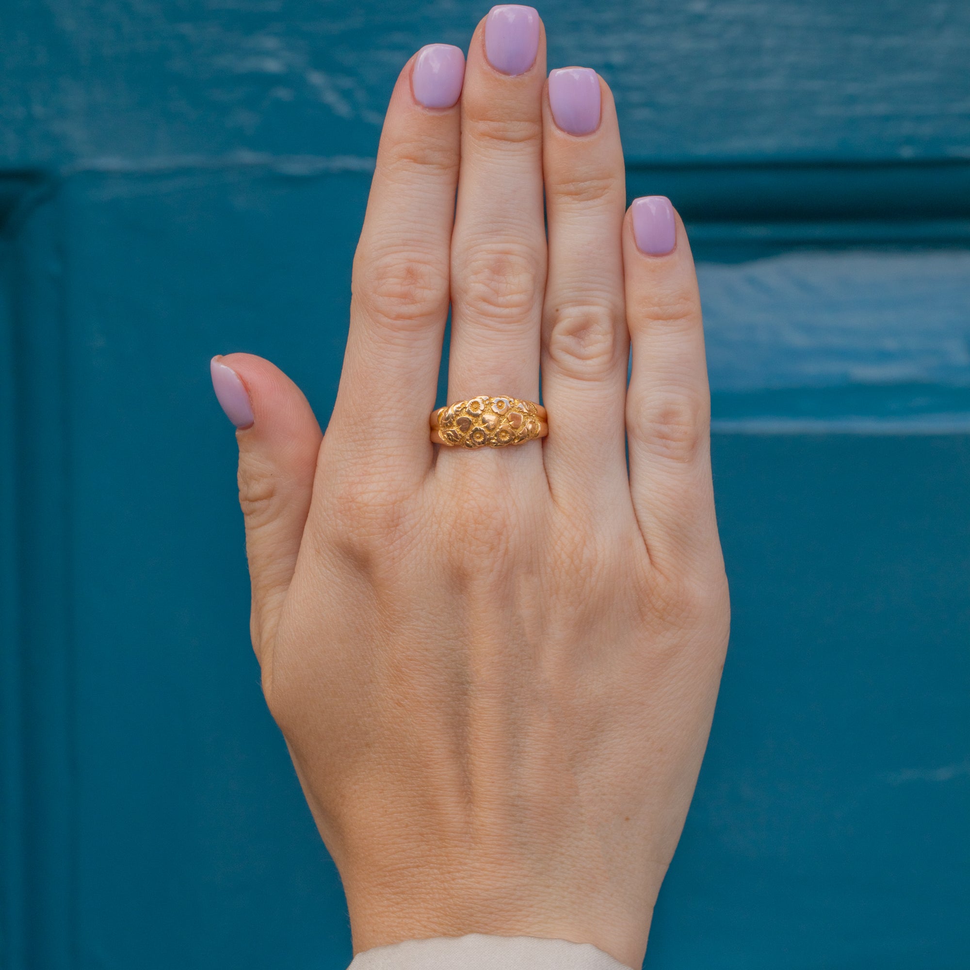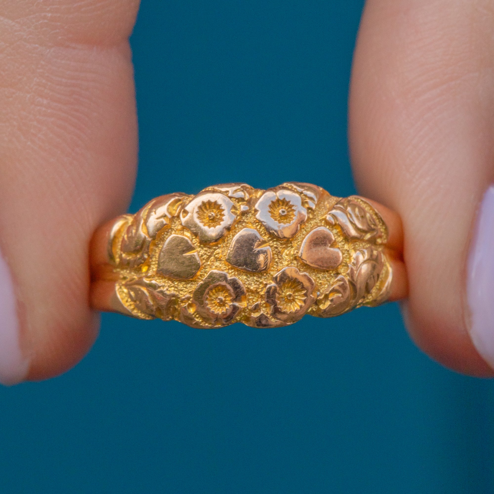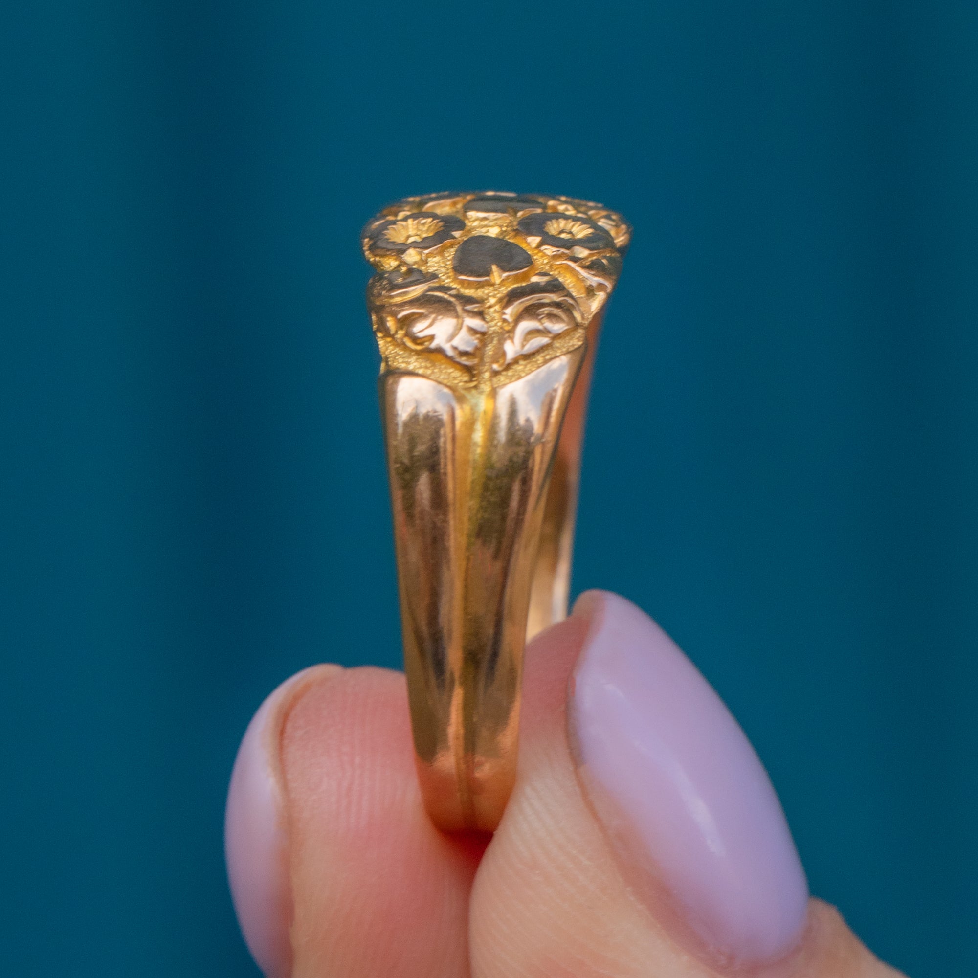 Flaunting a flourish of forget me not flowers, this antique 18ct Gold engraved flower ring will bring happiness to your repertoire. Her glossy flowers are illuminated by her stippled background, crafted entirely from honey hued 18ct Gold.