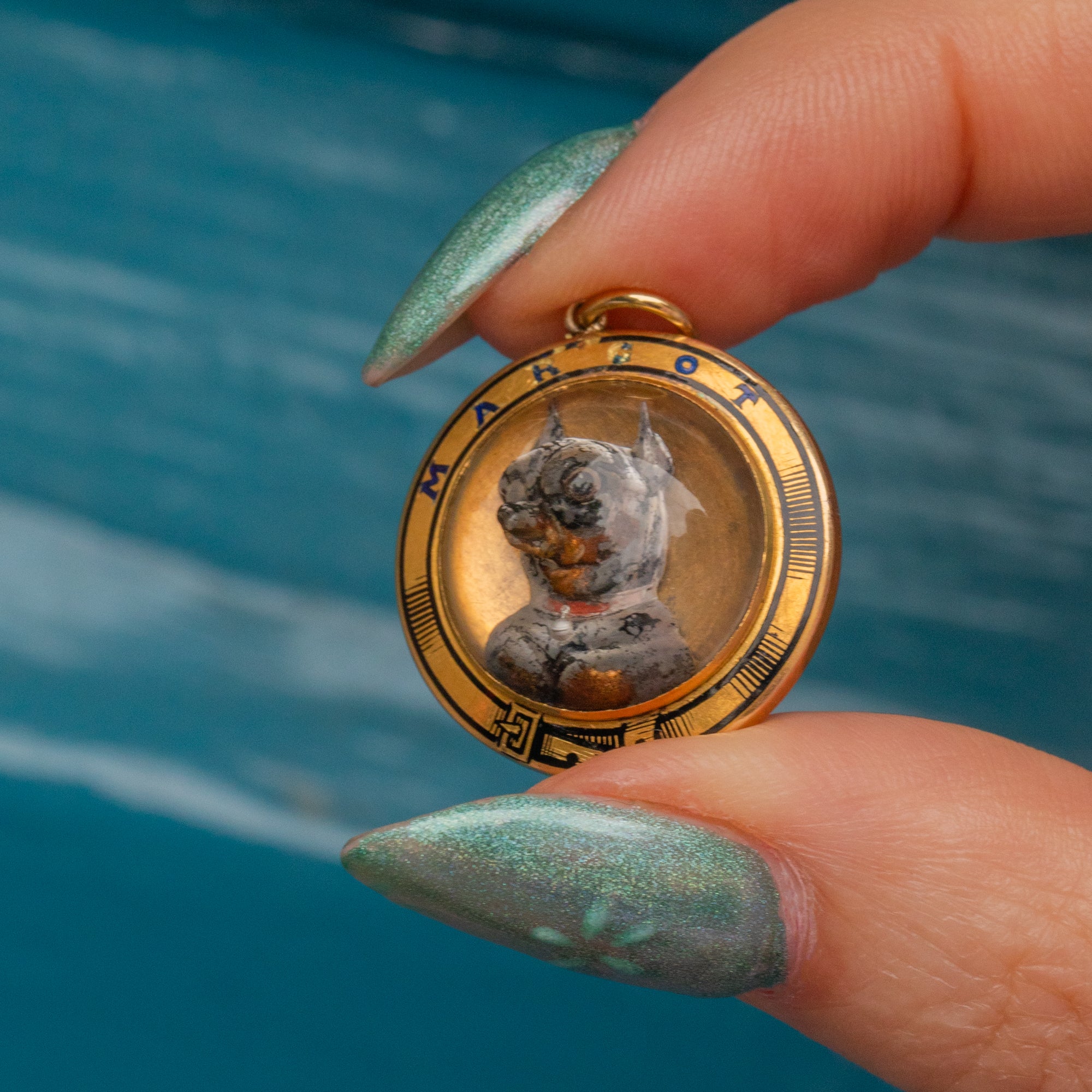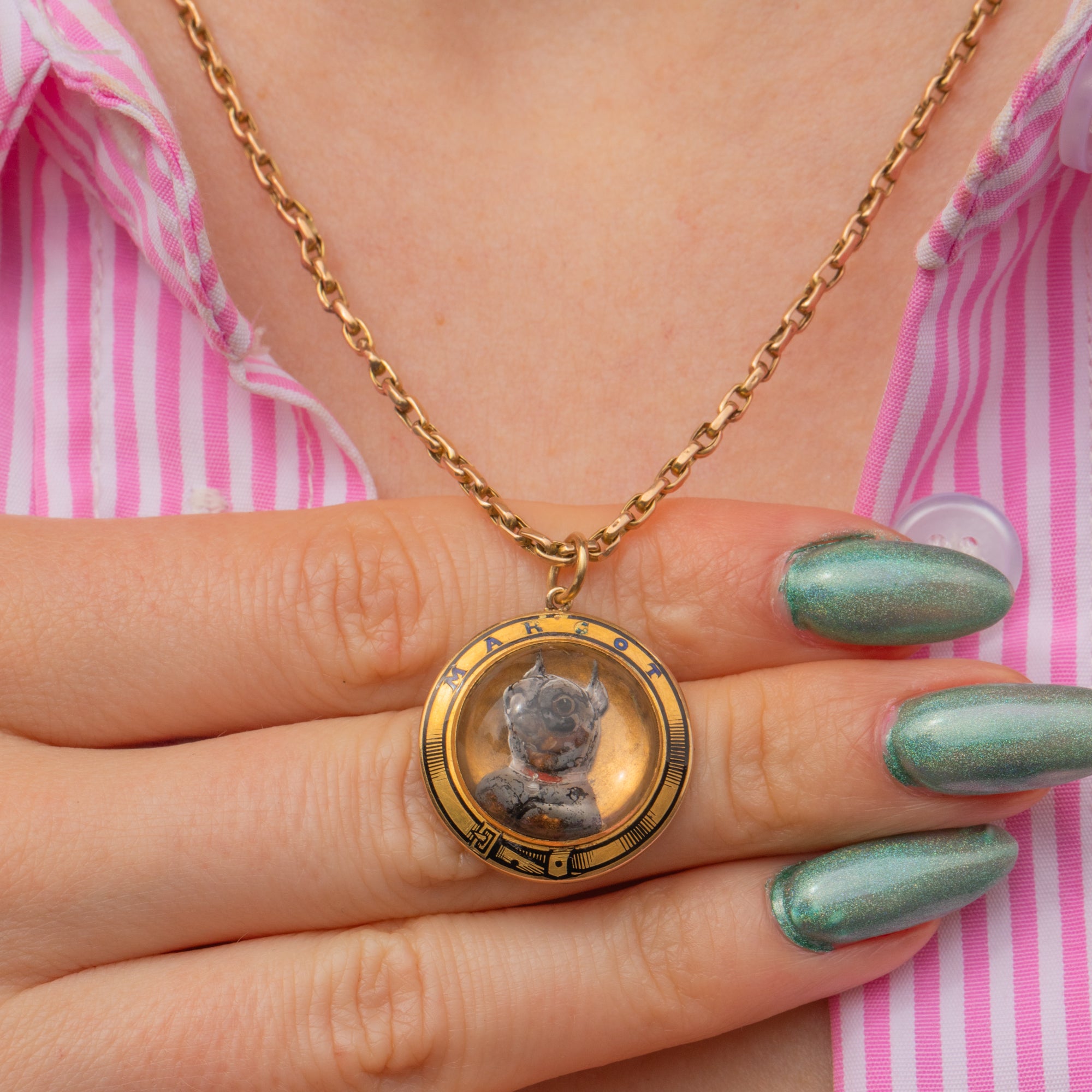 VERY GOOD-EXCELLENT. This antique 18ct Gold Essex Crystal dog pendant is in beautiful condition throughout. The Essex Crystal is completely polished, with no signs of scuffs, scratches or nicks to its settings. The 'G' in the word 'Margot' has worn slightly, but other than that her Enamel is superb! There are a few subtle scratches to the back of the pendant, but this is unnoticeable when worn. Plus, the little chihuahua's face is completely immaculate.