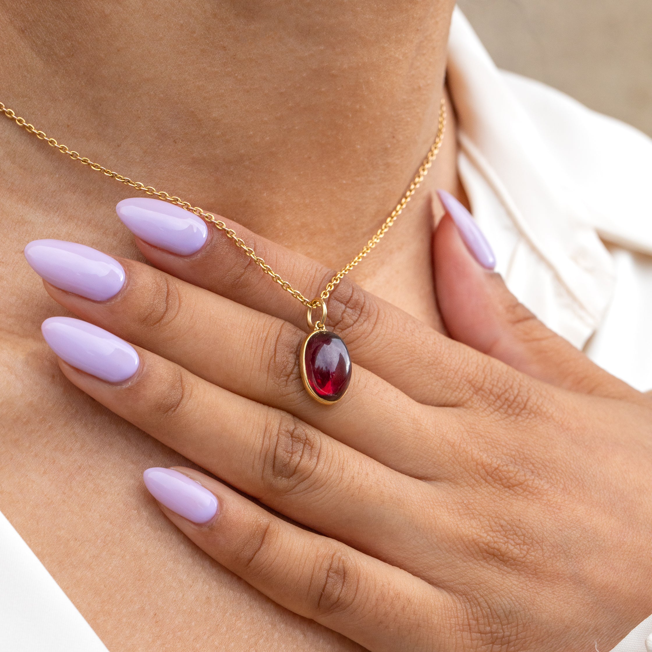 Each curve and contour of the pendant reflects in the light, revealing seductive crimson hues that shimmer across the smoothly domed Garnet cabochon; this Victorian pendant is sure to swoon!