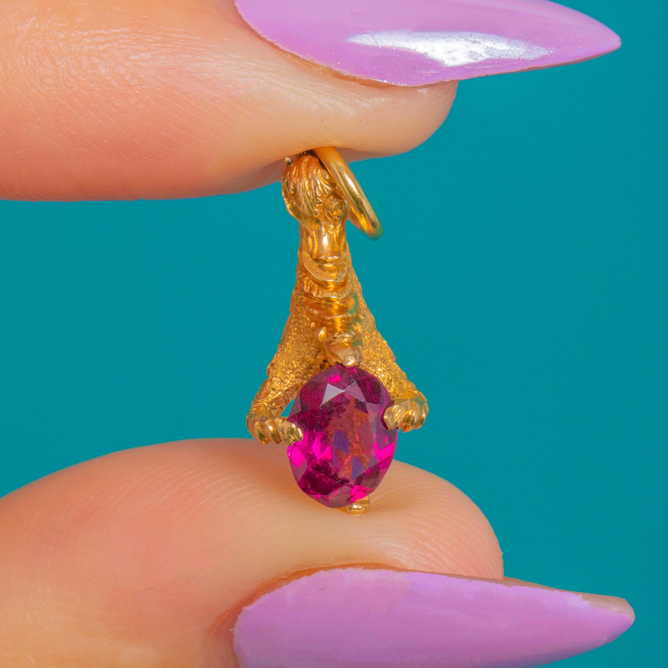 A delightful Victorian treasure, this 18ct Gold charm is sculpted as a naturalistic claw gently clasping a vivid oval Garnet. The three-dimensional figural form flows around the gemstone, with defined talon-like terminals and subtle texturing that accentuates the warm glow of high-carat Gold.