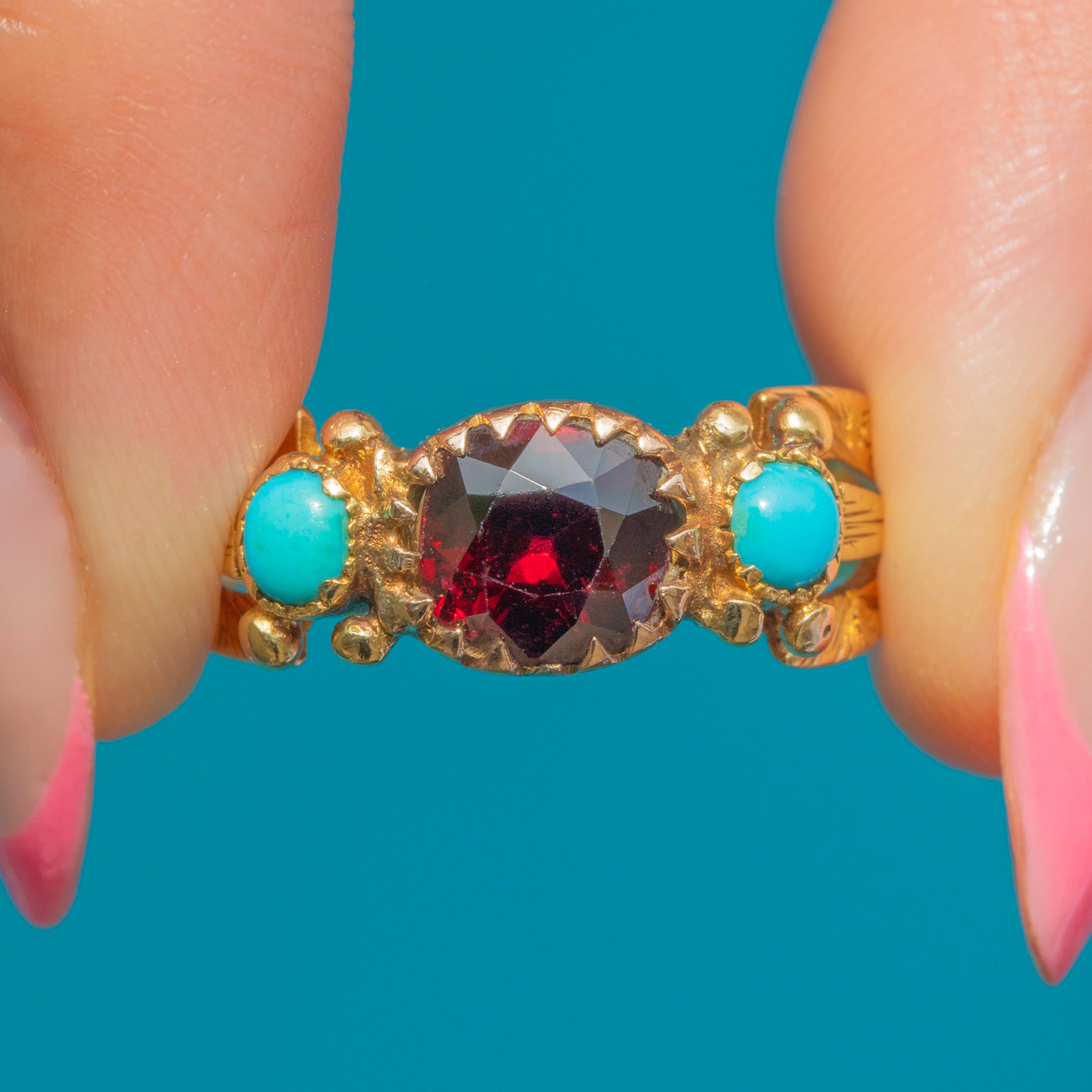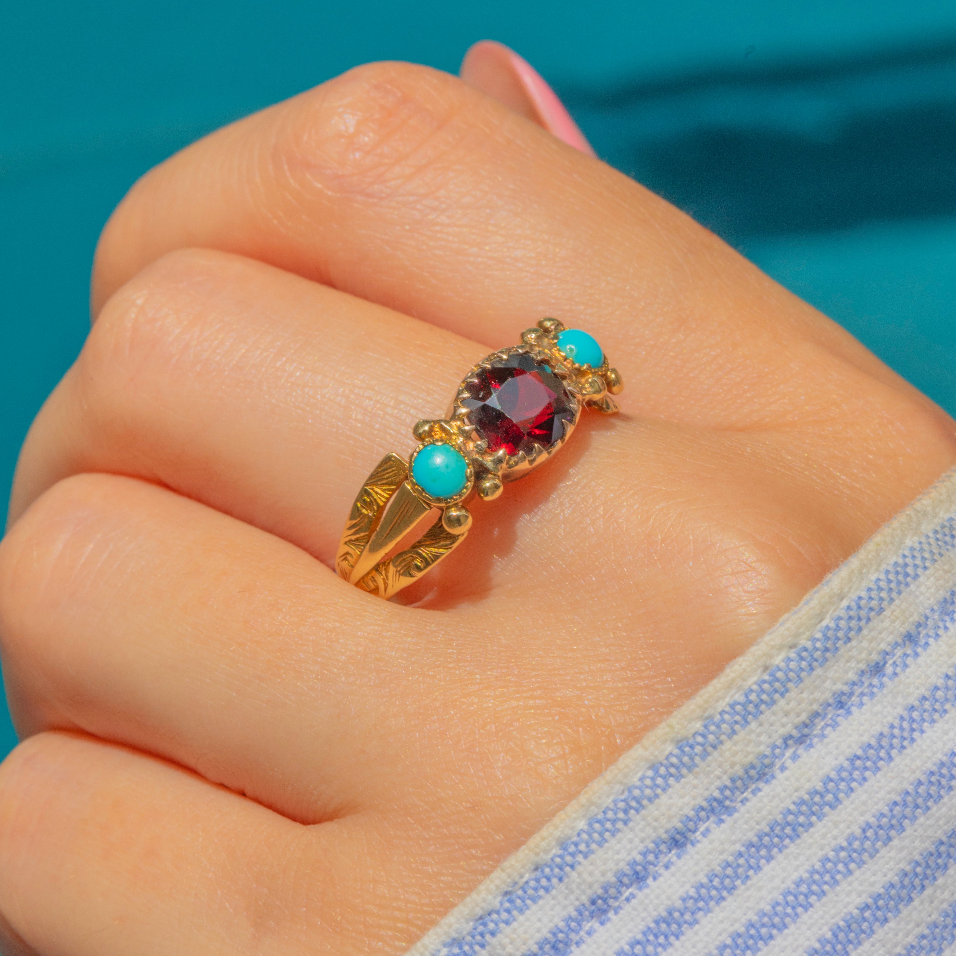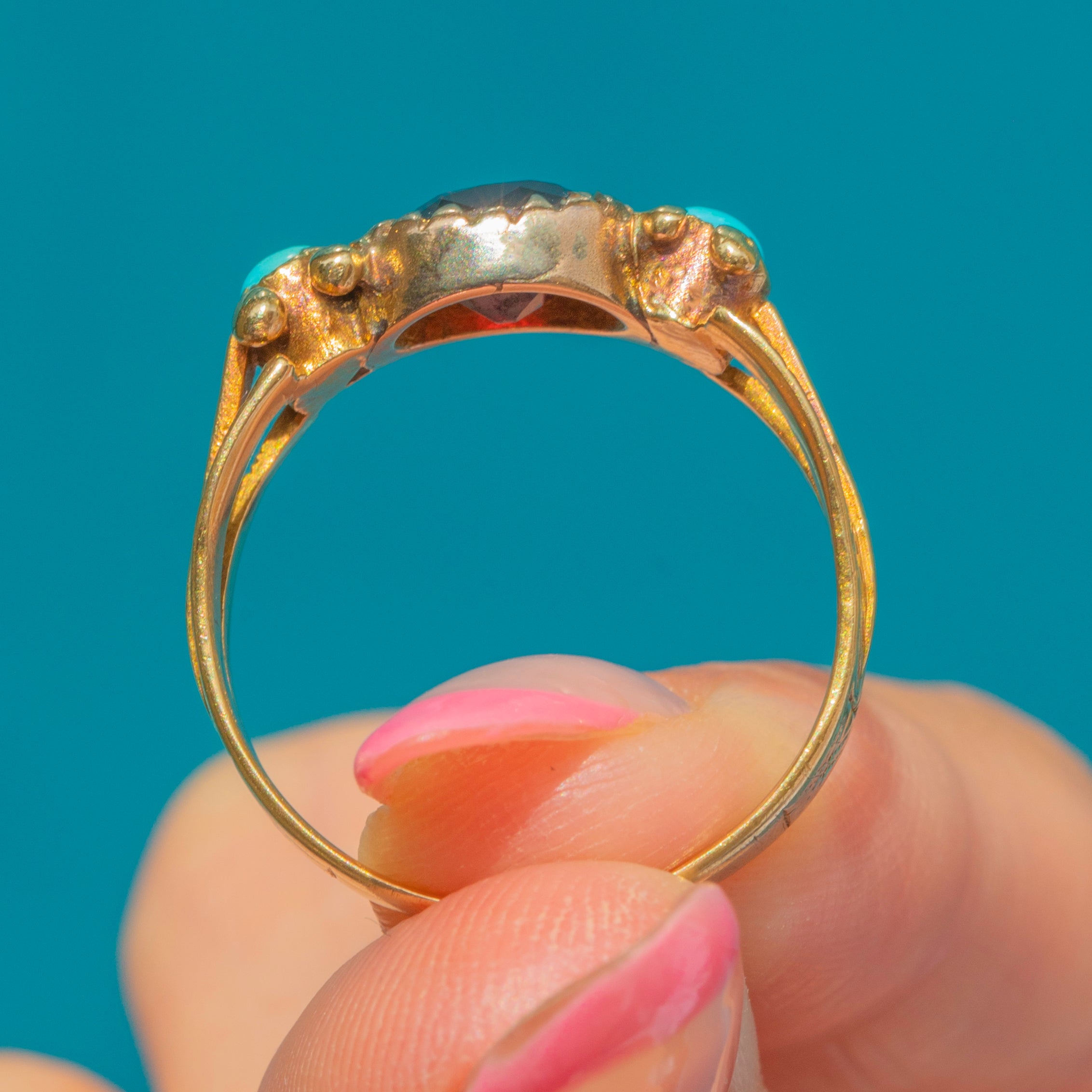 VERY GOOD. This antique 18ct Gold Garnet Turquoise ring is in very good condition. The Gold is brightly saturated, with only some discolouration on the inside of the band, likely from where someone has previously tested the purity of the Gold. The gemstones have all been wonderfully preserved, with no signs of surface wear present. There is one small claw missing from the Garnet setting, but it remains secure and doesn't affect the stone. The band is smooth and glossy, providing a comfortable fit and promising many more years of wear and enjoyment!