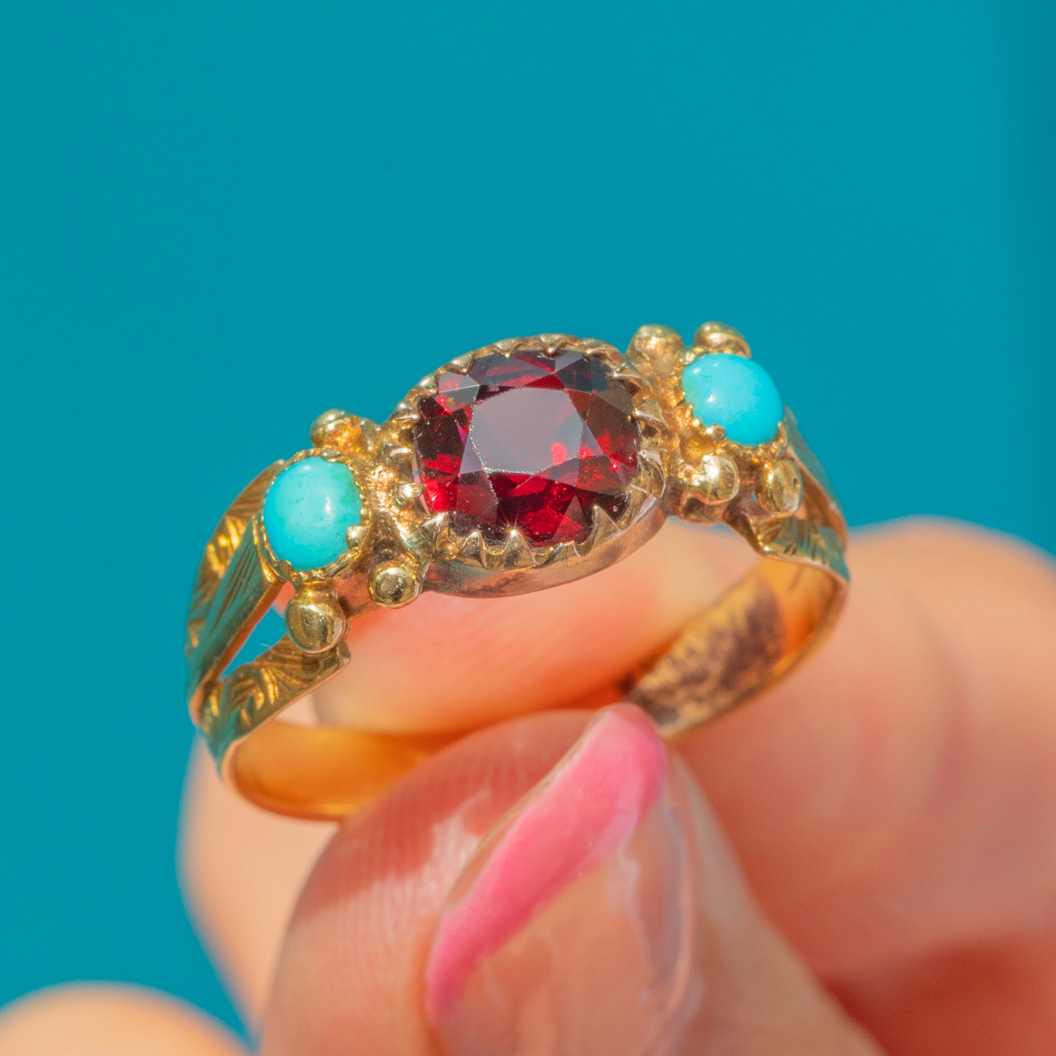This antique 18ct Gold Garnet Turquoise ring is a gorgeous piece! Made from solid 18ct Gold, this Victorian ring is comprised of a berry red Garnet flanked by robin's egg blue Turquoise gems, creating a striking contrast.