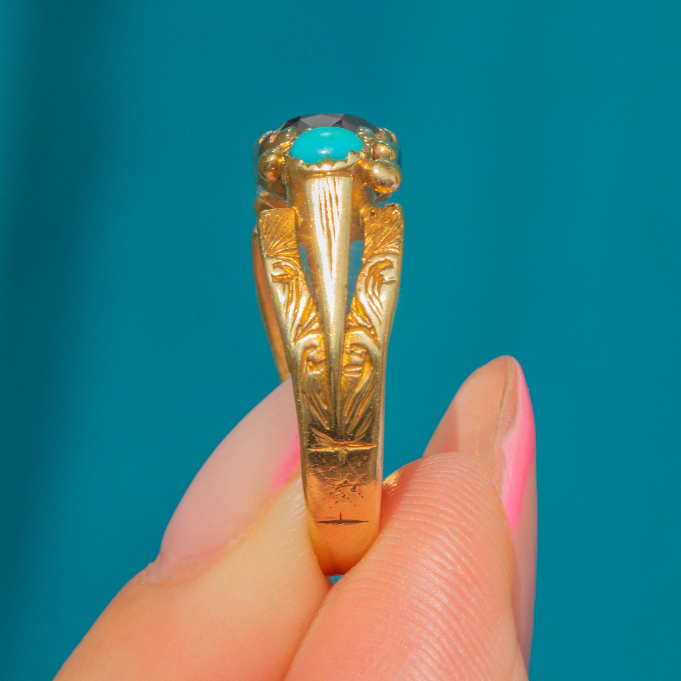 Antique 18ct Gold Garnet Turquoise Ring, Engraved Shoulders