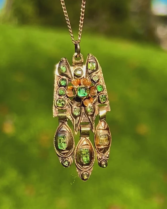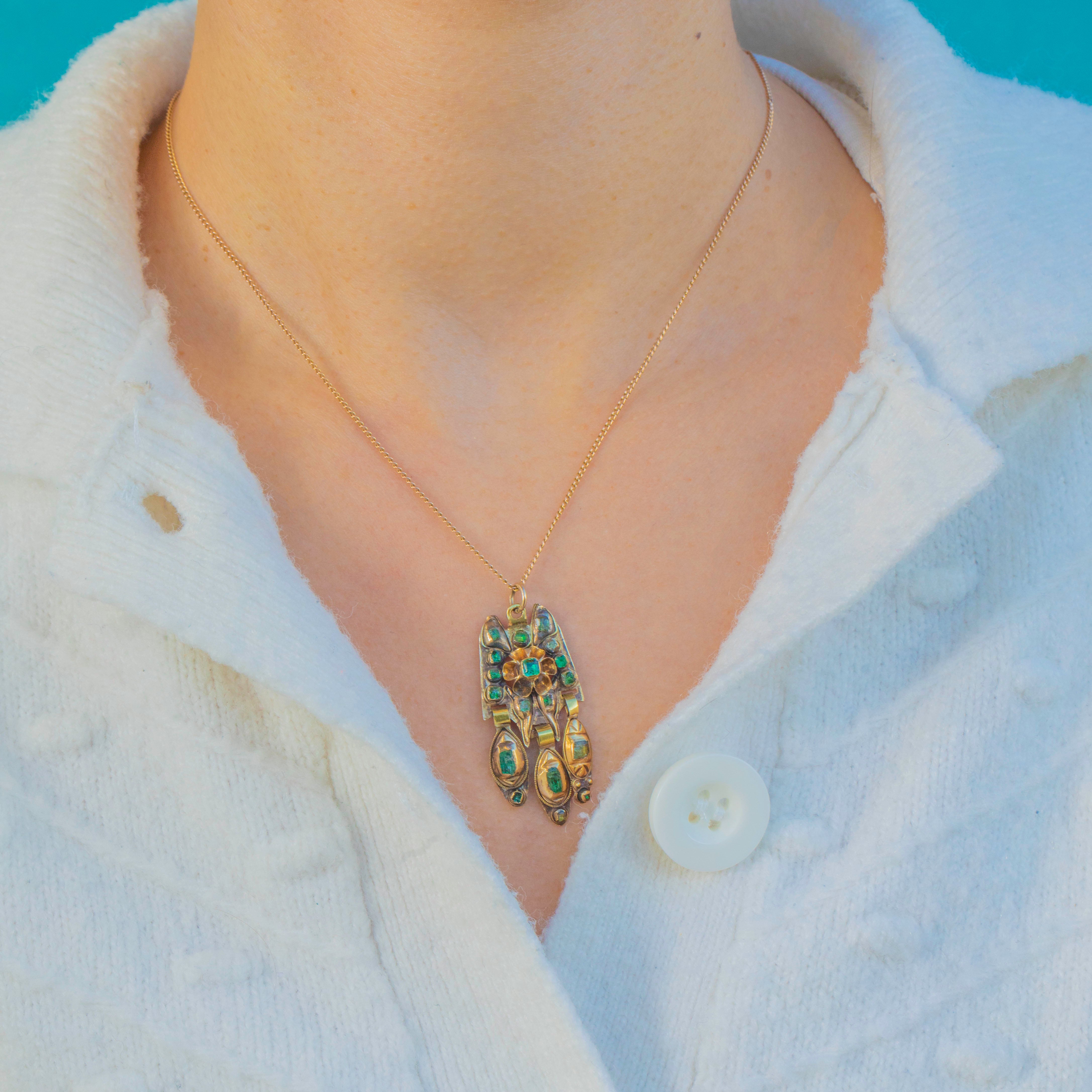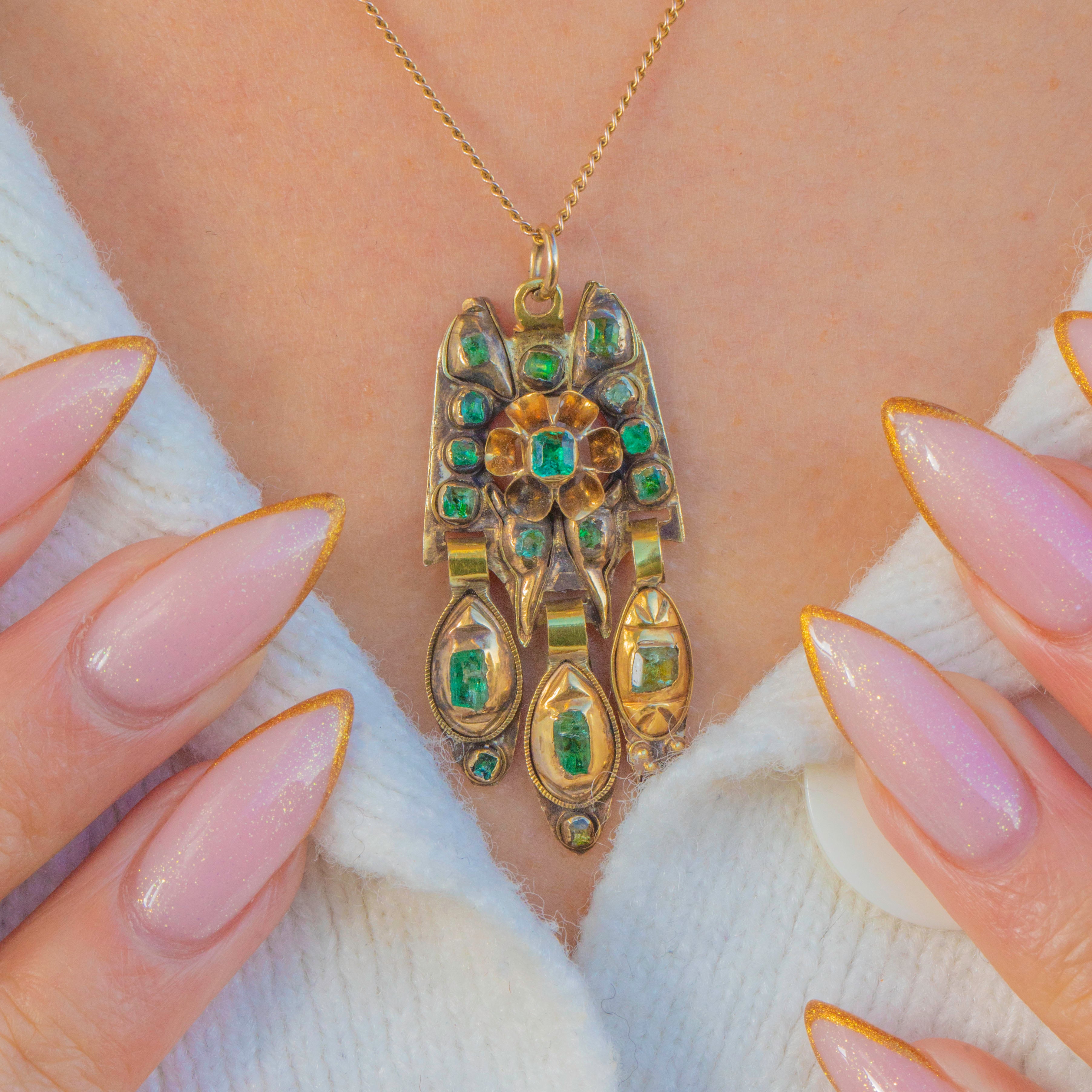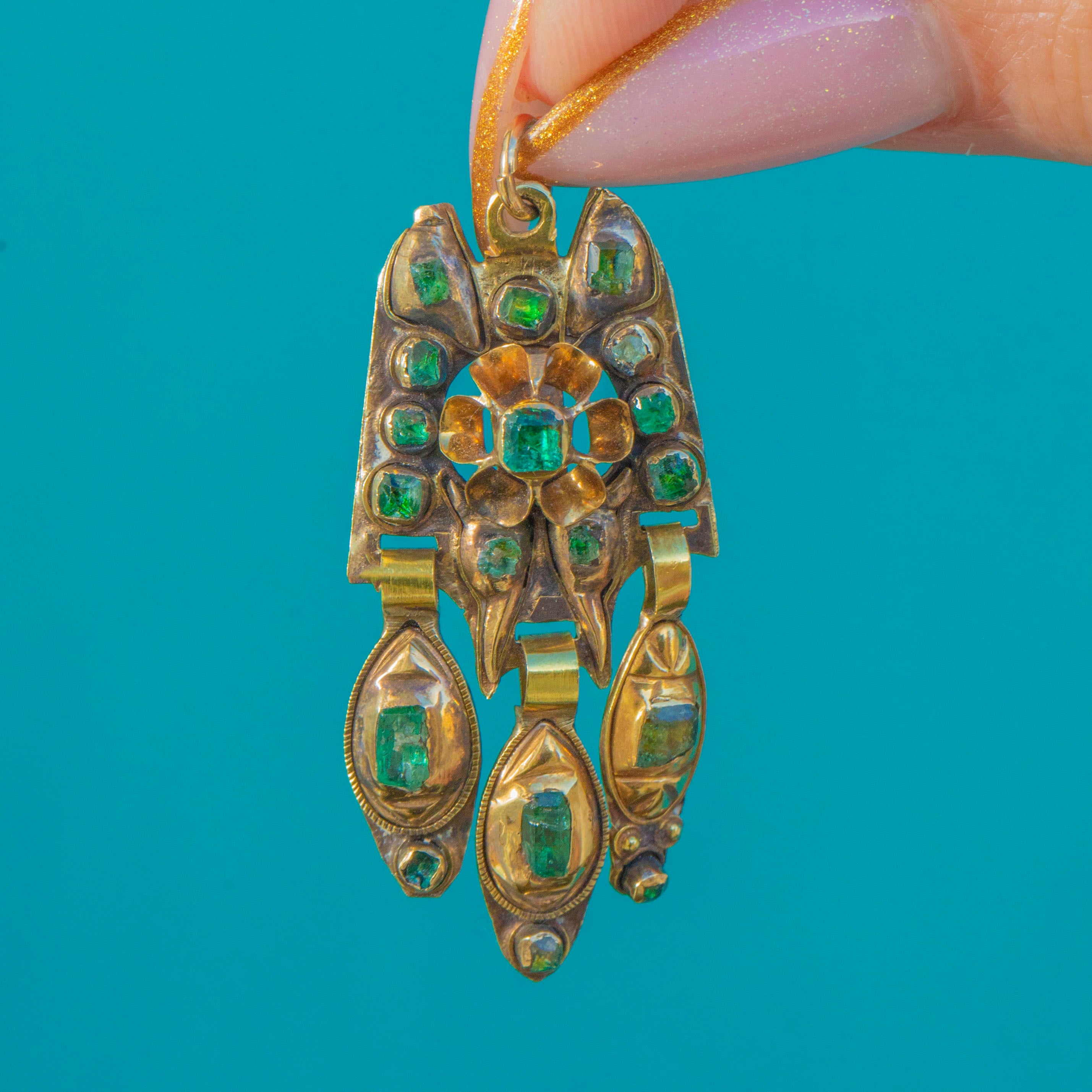 This striking 19th-century Iberian pendant showcases the bold, opulent styling characteristic of Iberian jewellery. Originally crafted as an earring, the pendant is made in rich high-carat Gold and set with vibrant natural Emeralds, each stone glowing with bright green colour and enhanced by traditional foiling behind the gems—an authentic historic technique that adds depth and radiance.